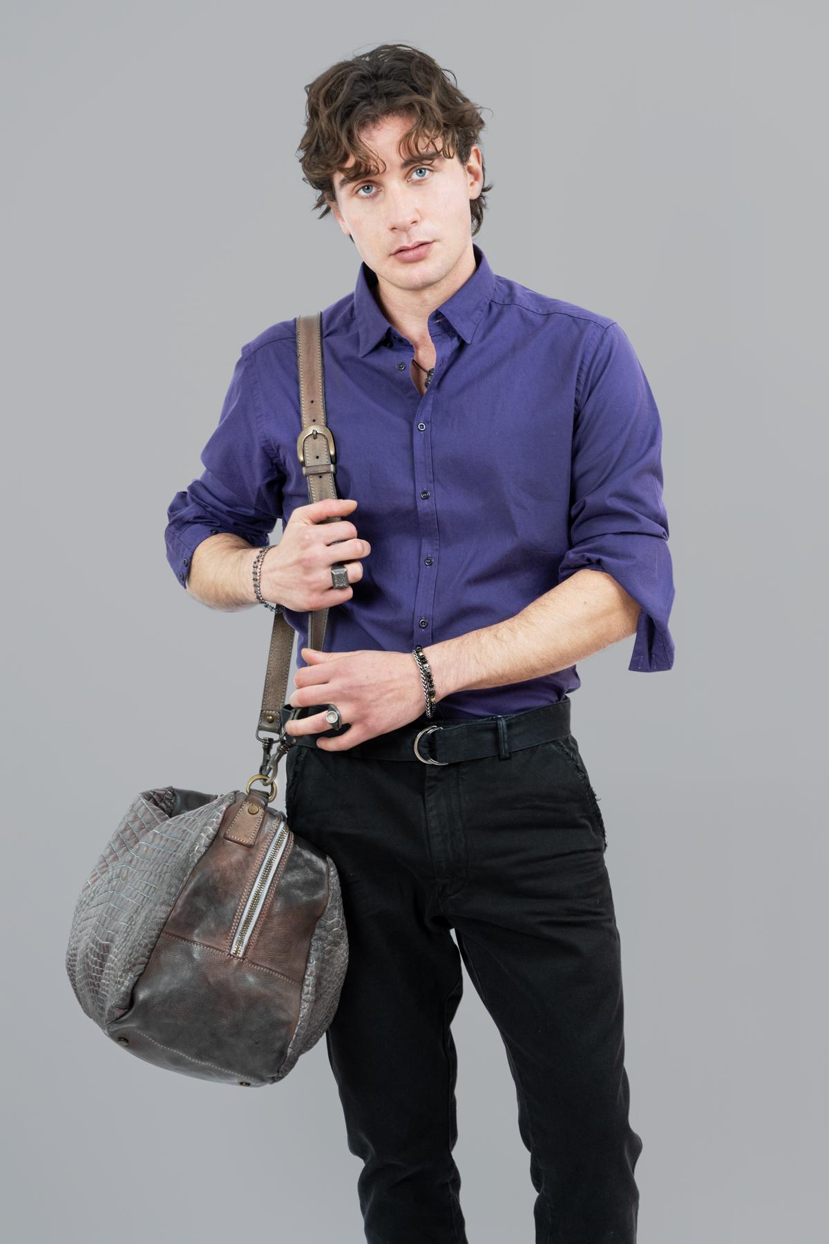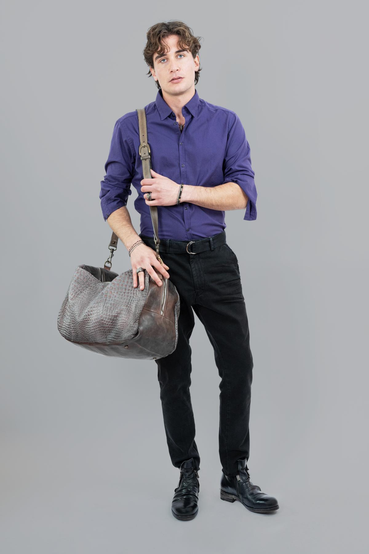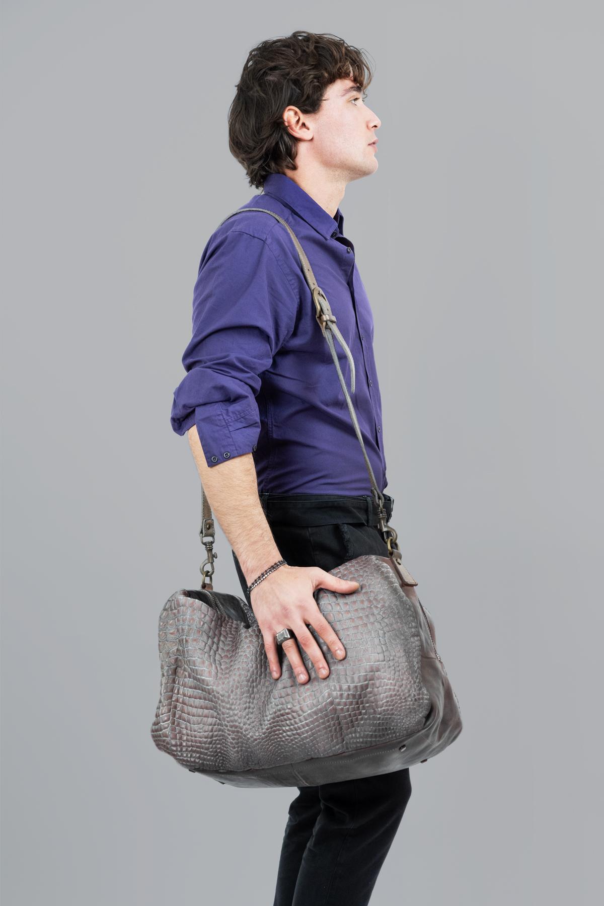Crocodile-print leather travel bag with zipper closure. Steel handle with gold finish. Removable leather shoulder strap.