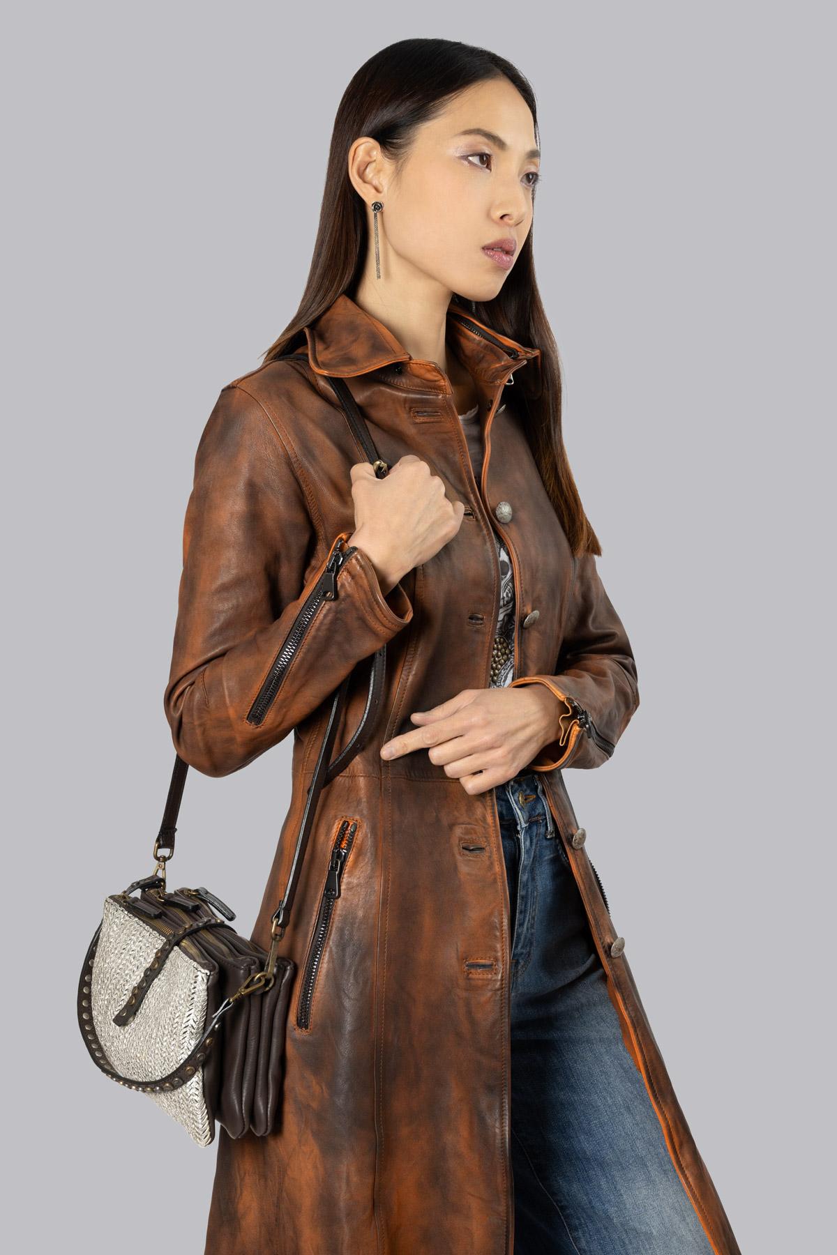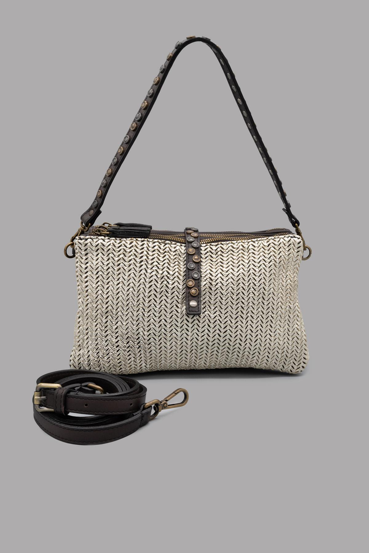 Laser-cut leather shoulder bag, painted gold. Three compartments with zip closure. Strap and handle with studs. Adjustable shoulder strap.
