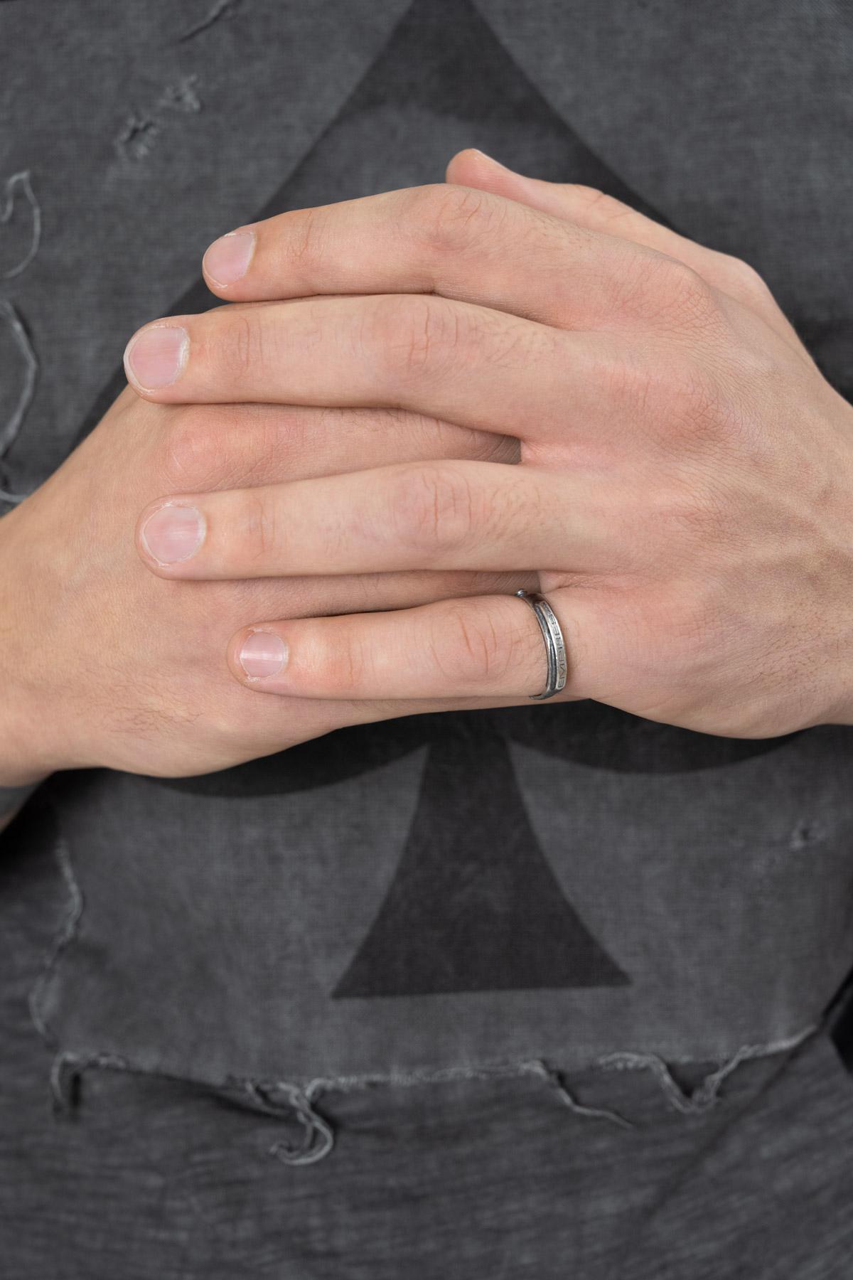 Silver ring with engraved face. Empresa logo on the band.
