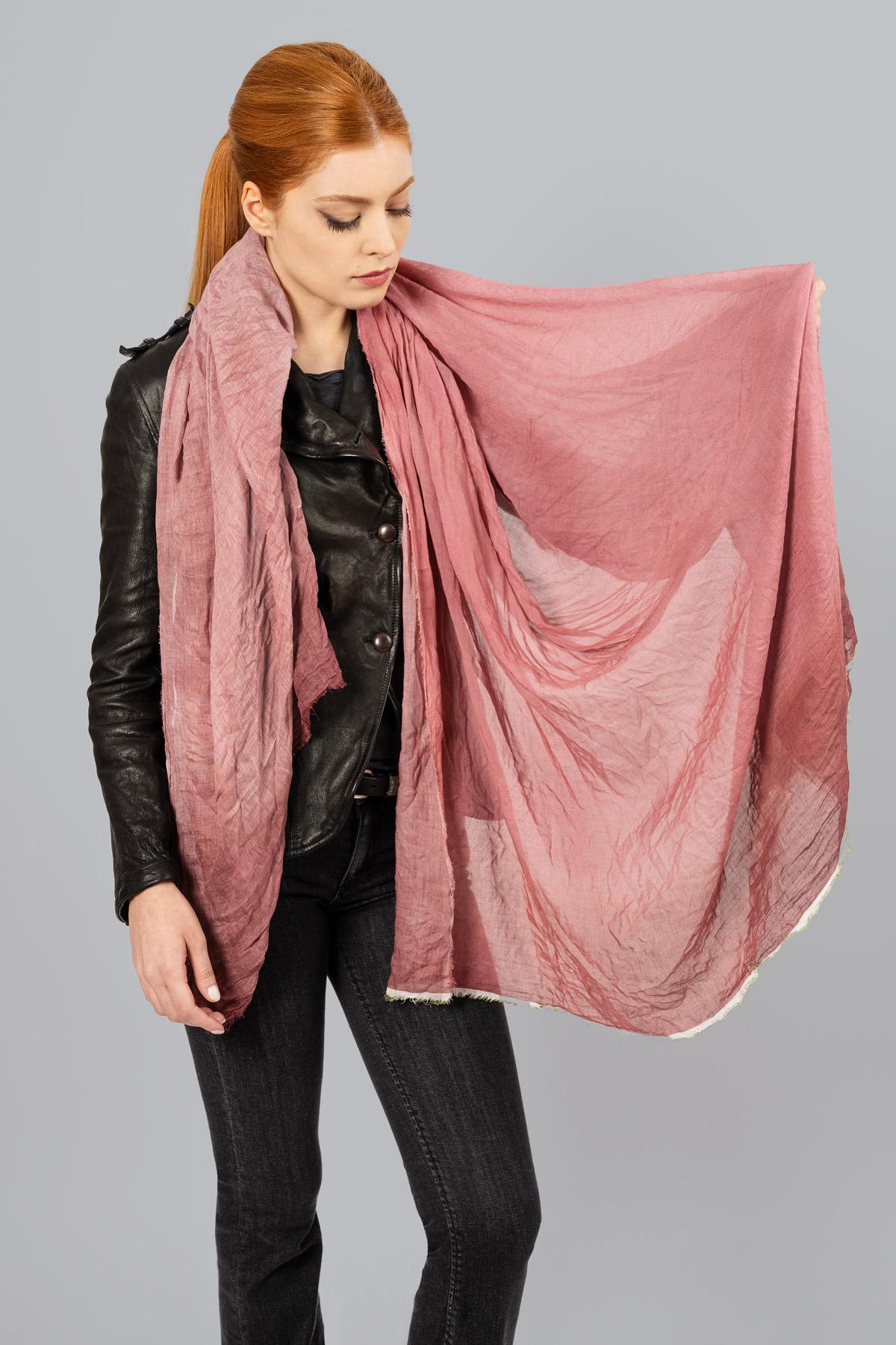 Cashmere blend scarf in green shades. Raw cut hem.