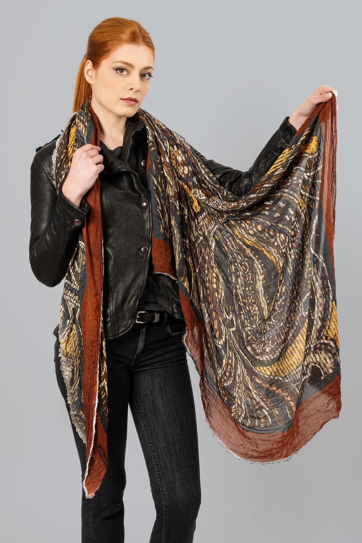Cashmere-blend scarf with ethnic print in warm earth tones. Light and refined, it is completed by a raw cut hem.