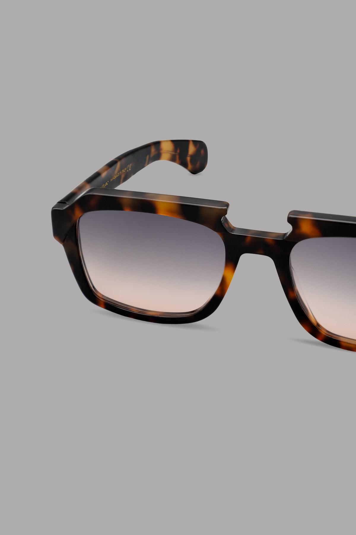 Handmade sunglasses made of high-quality cellulose acetate. Slightly rounded rectangular shaped frame, with a hollowed-out bridge. Lens with maximum UV protection.