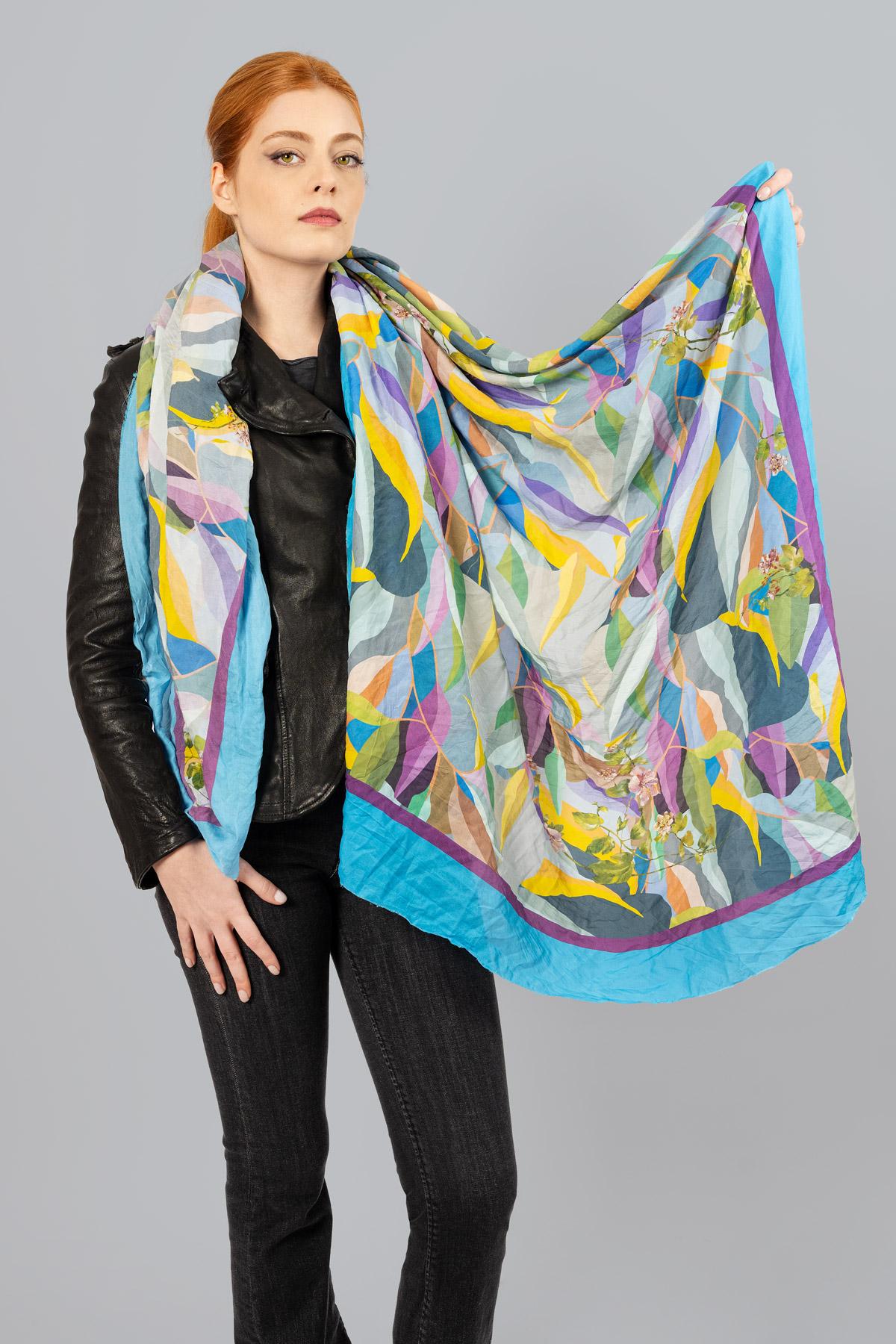 Cashmere blend scarf with geometric print. Raw cut hem.
