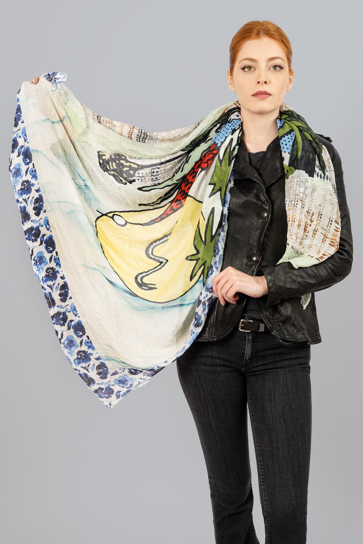 Cashmere blend scarf with cartoon print. Raw cut hem.