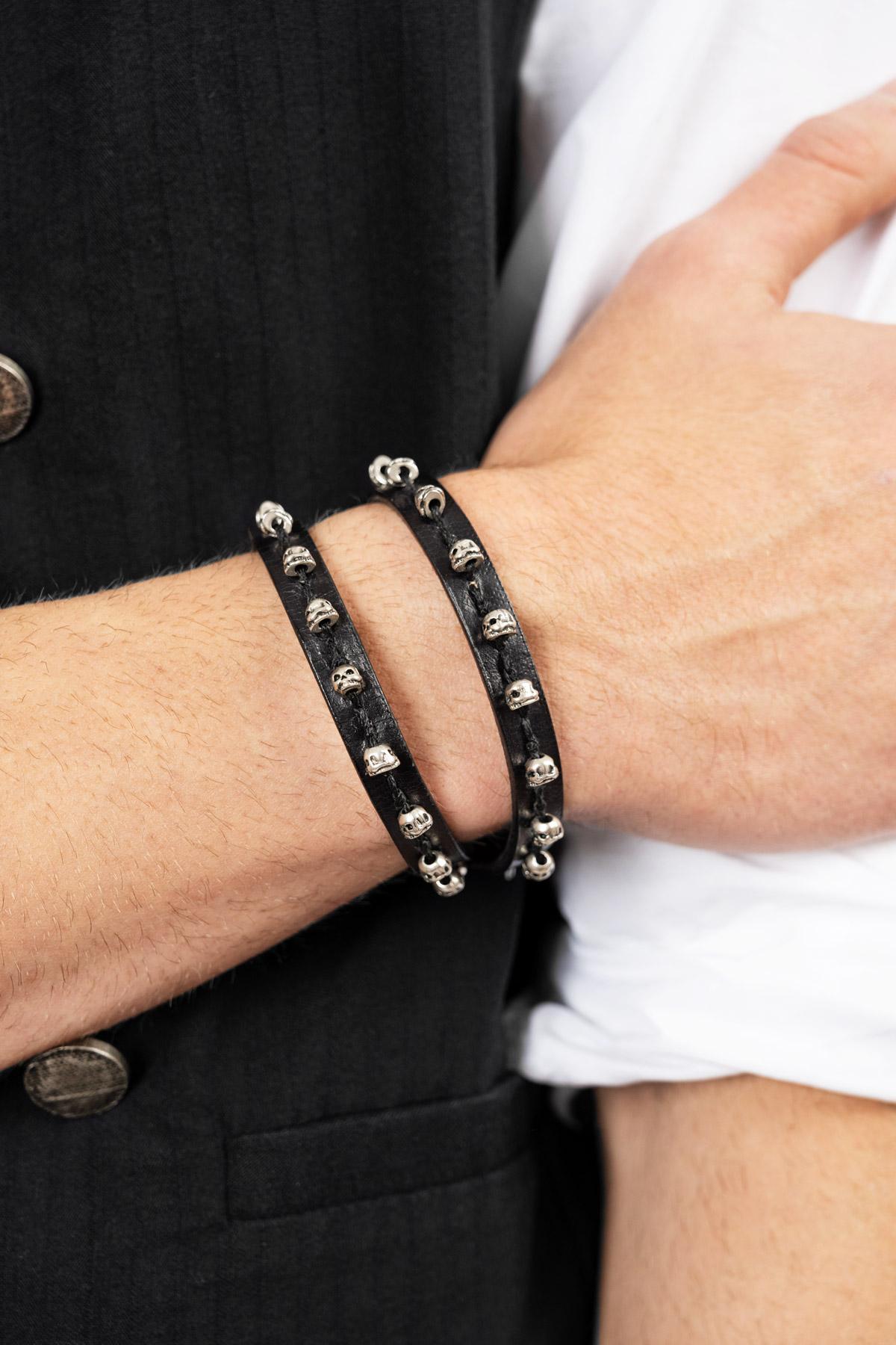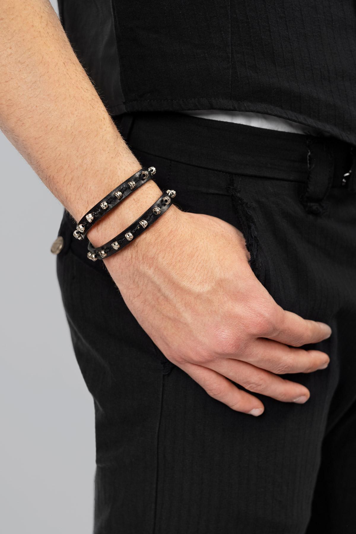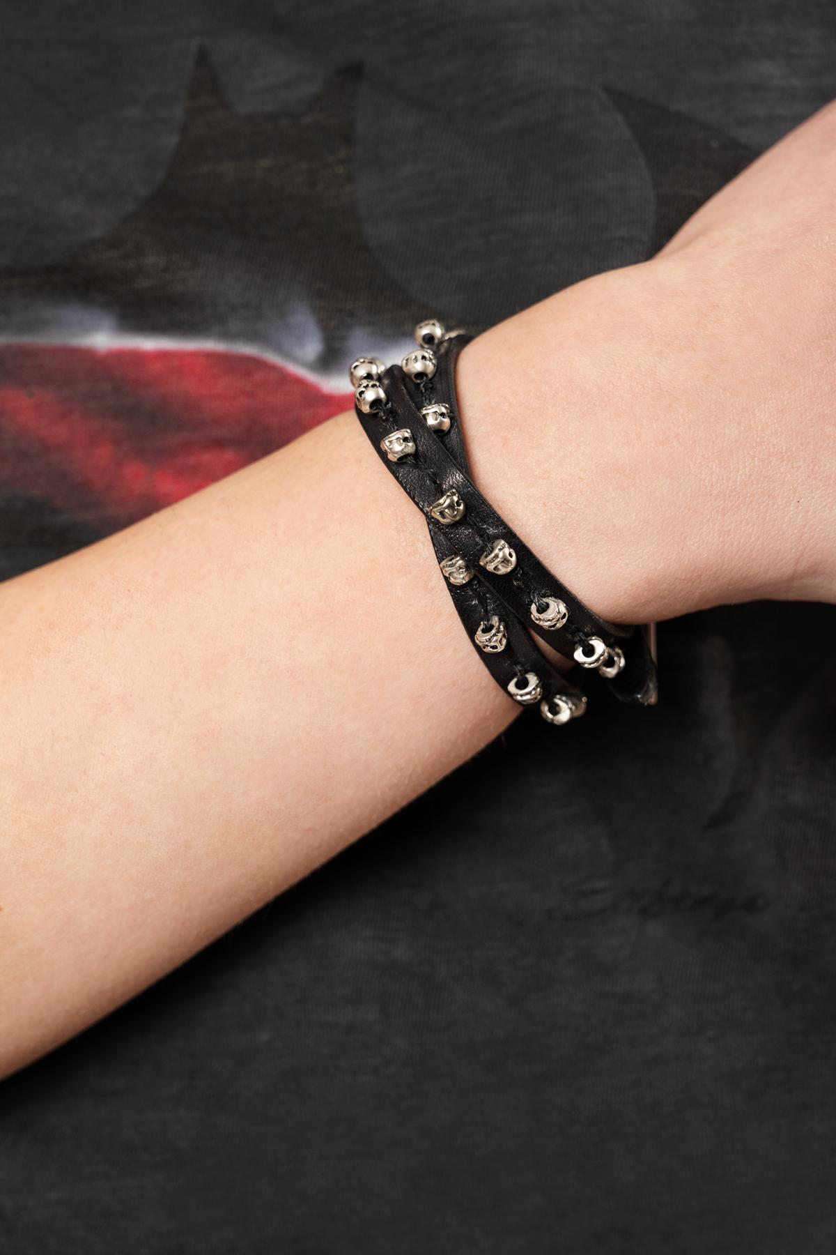 Double leather bracelet with skulls. Adjustable buckle closure.