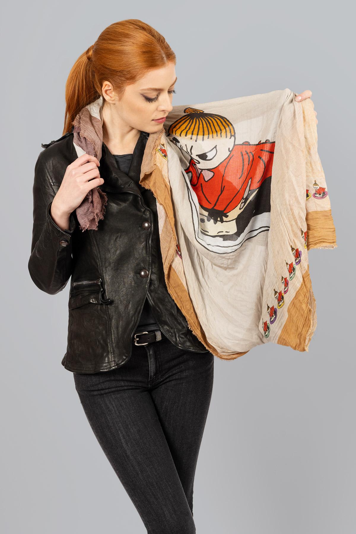 Cashmere blend scarf with cartoon illustration. Raw cut hem.