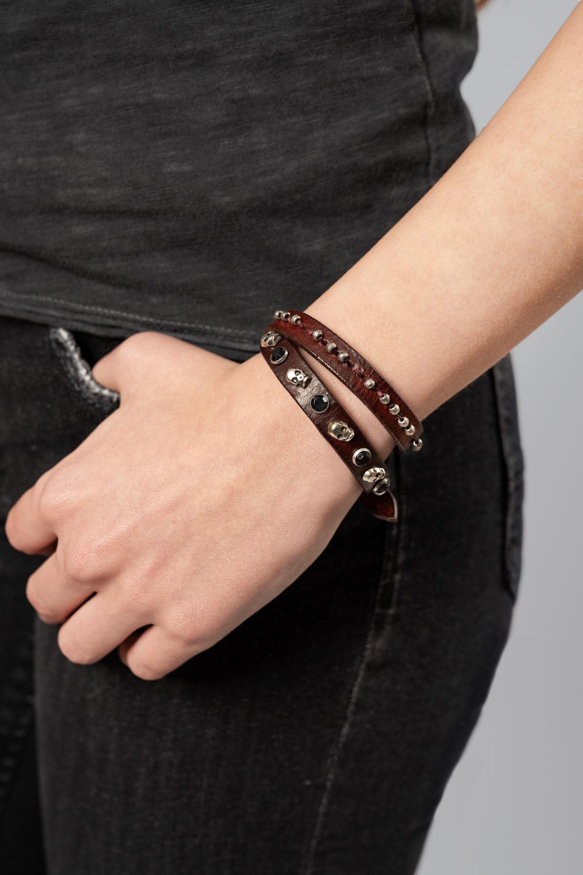Double bracelet in padded leather. Embellished with skull-shaped studs and stones. Adjustable clasp.100% Genuine Leather ...