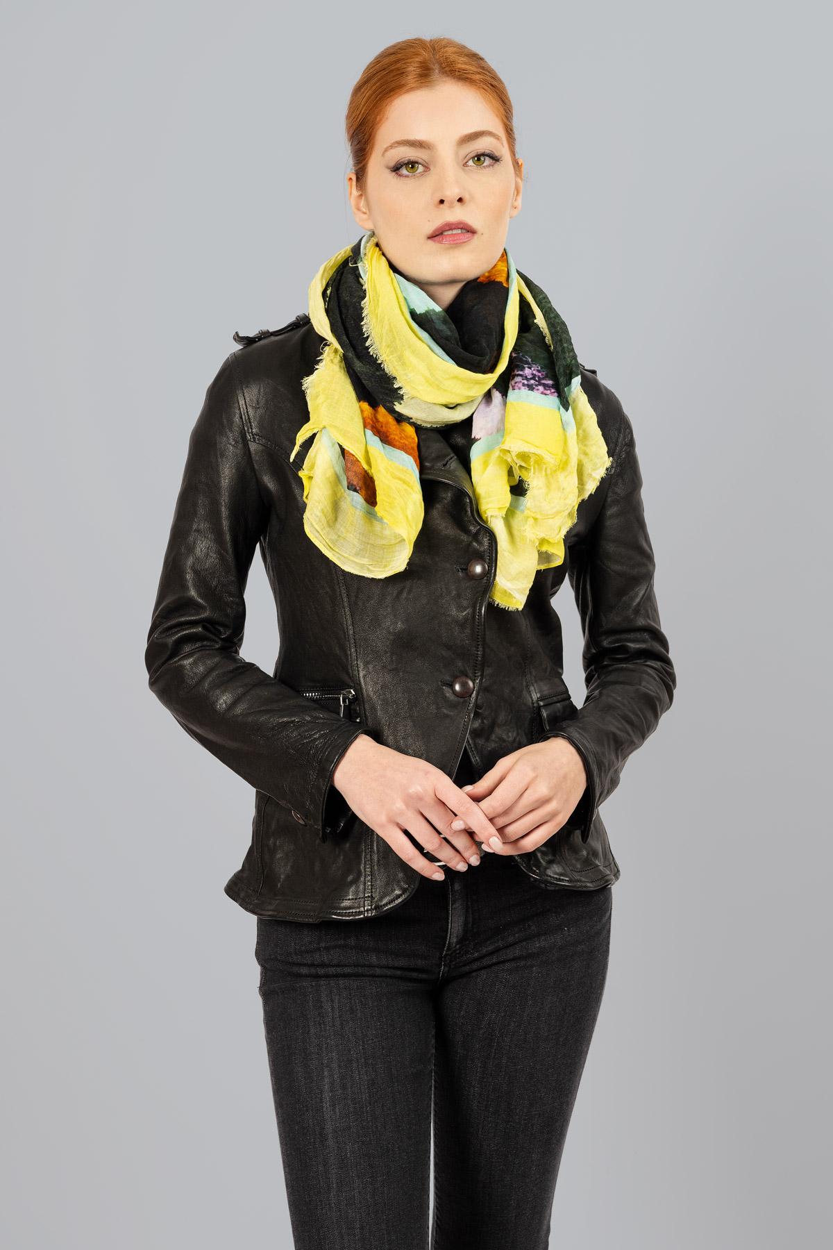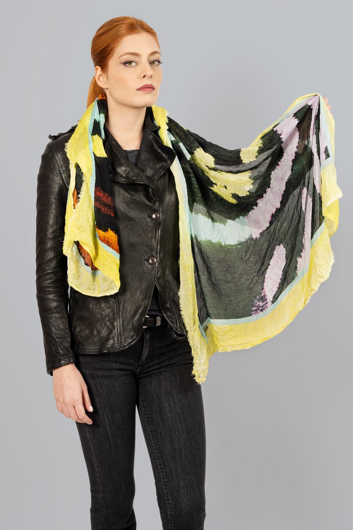 Cashmere blend scarf with abstract print. Raw cut hem.