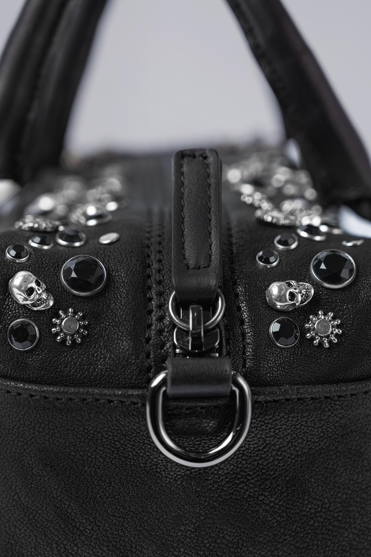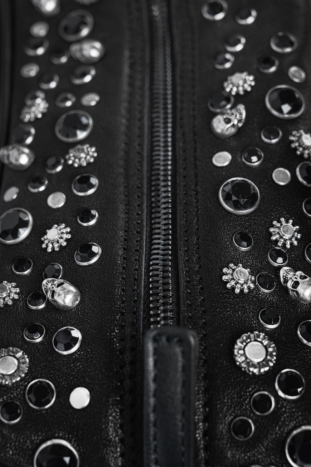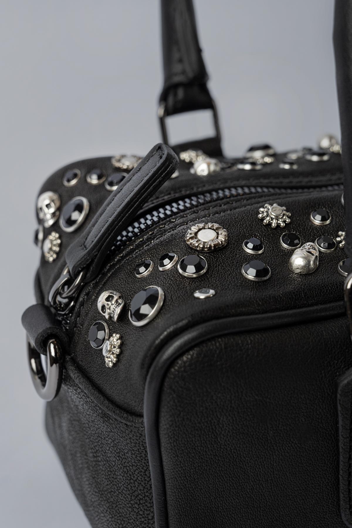 Genuine leather shoulder bag, embellished with decorative studs, including skulls, stones and floral motifs. The spacious interior is closed by a zip. Equipped with an adjustable and removable shoulder strap.