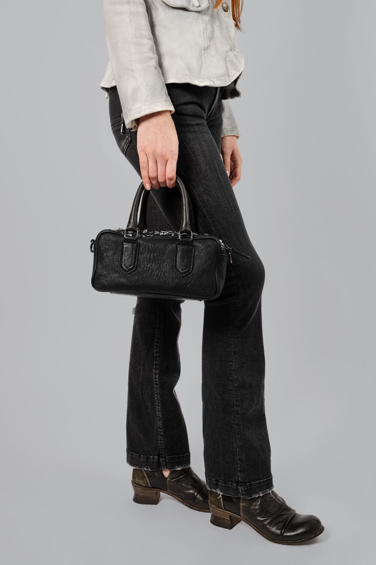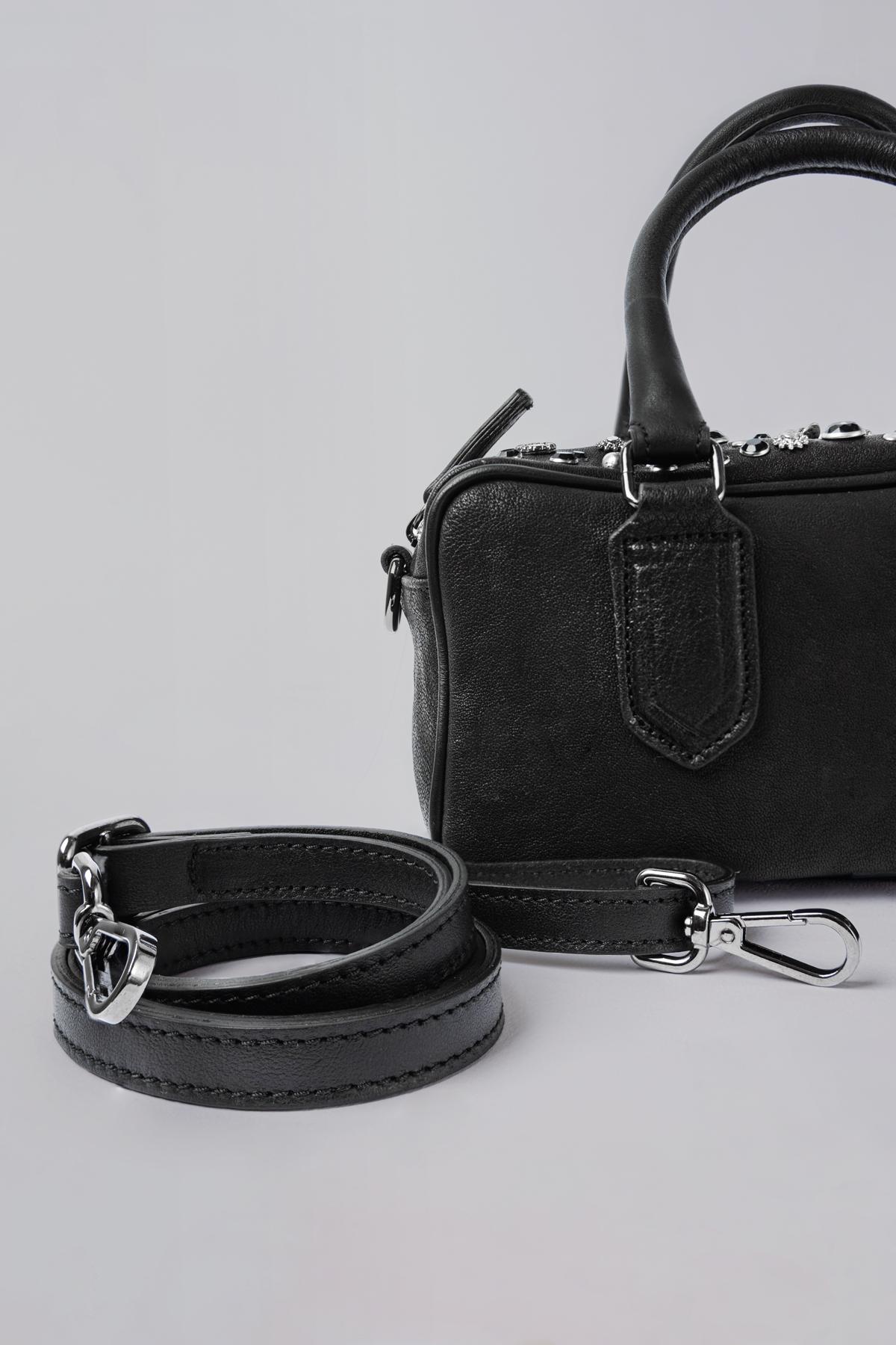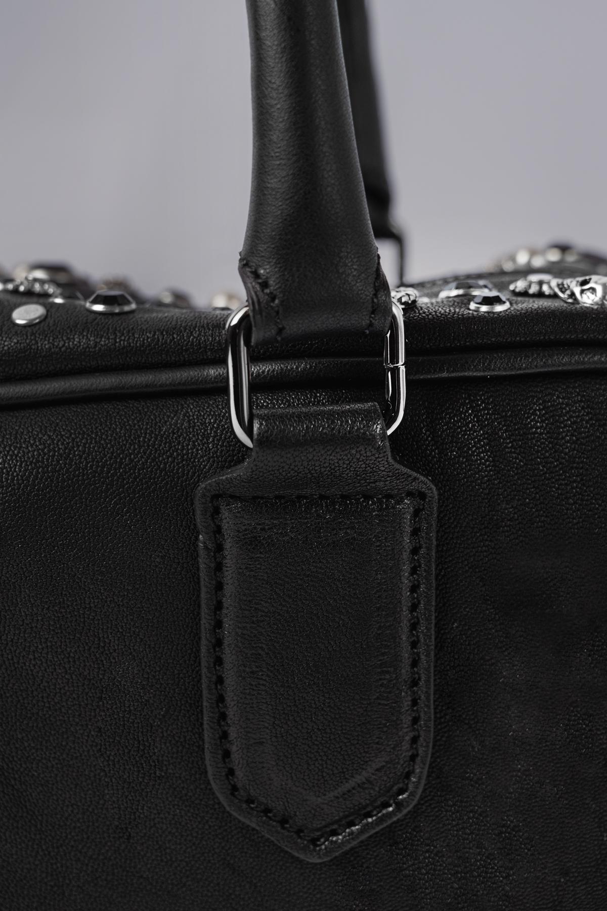 Genuine leather shoulder bag, embellished with decorative studs, including skulls, stones and floral motifs. The spacious interior is closed by a zip. Equipped with an adjustable and removable shoulder strap.