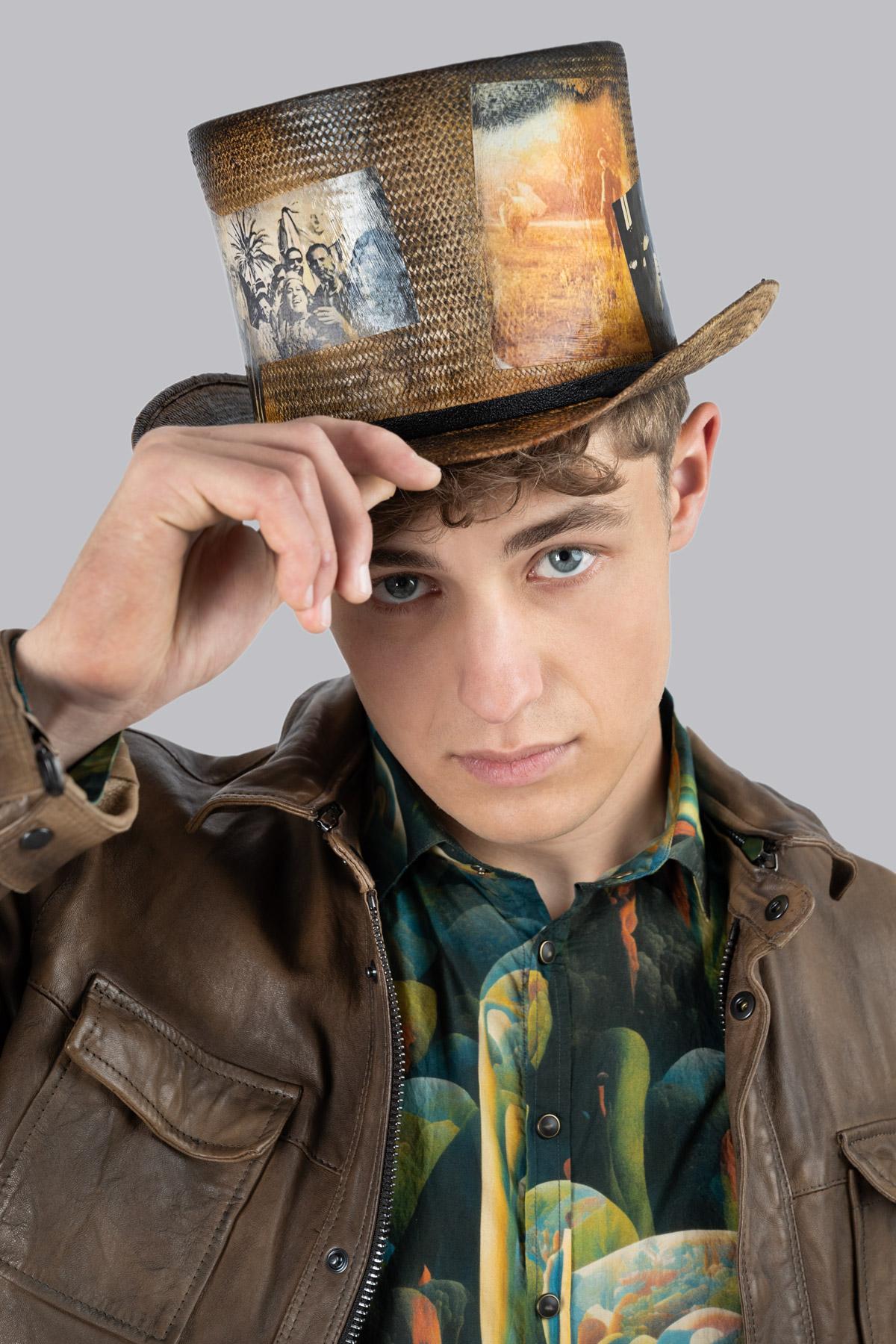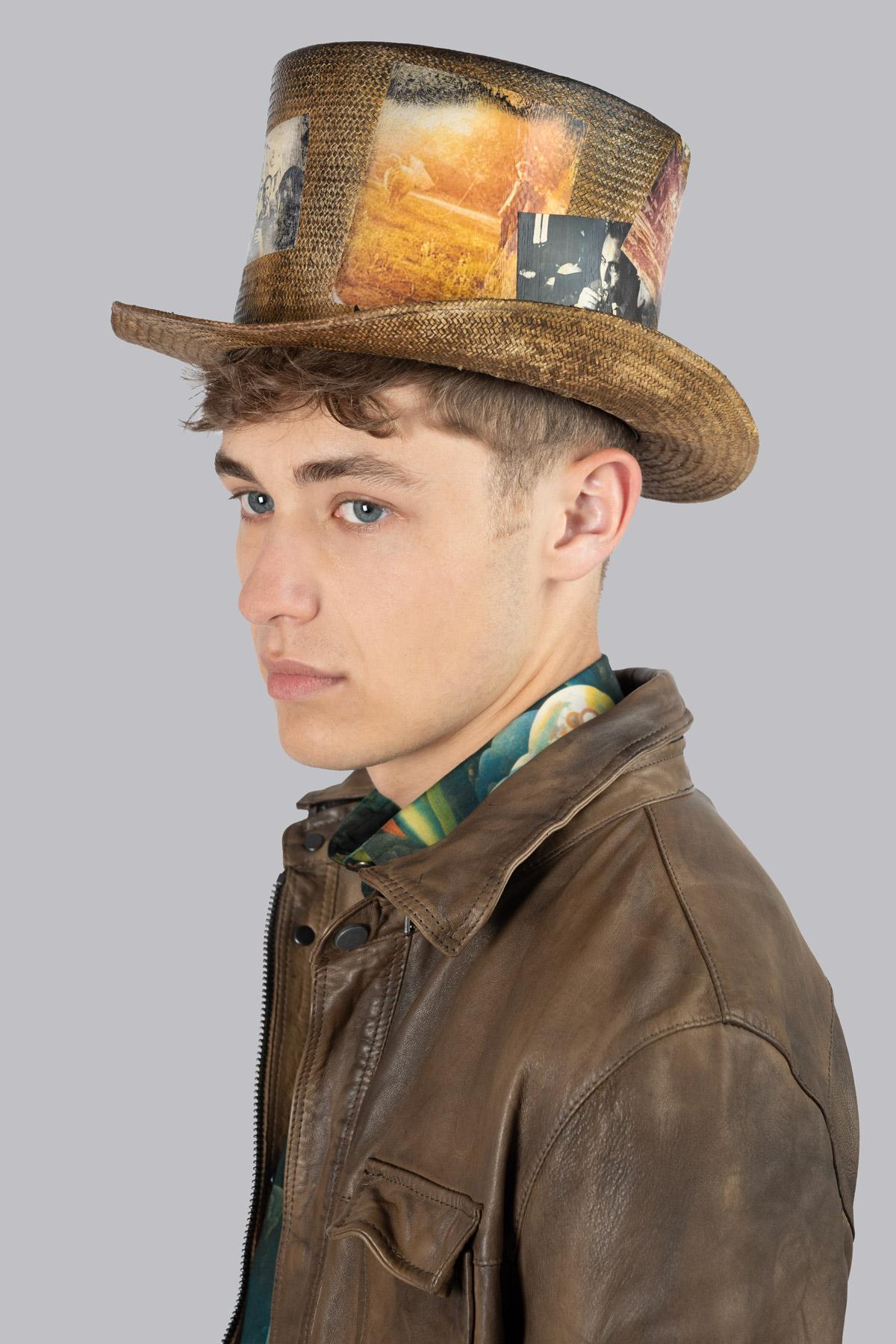 Buffered straw top hat, embellished with vintage photo. Leather insert.