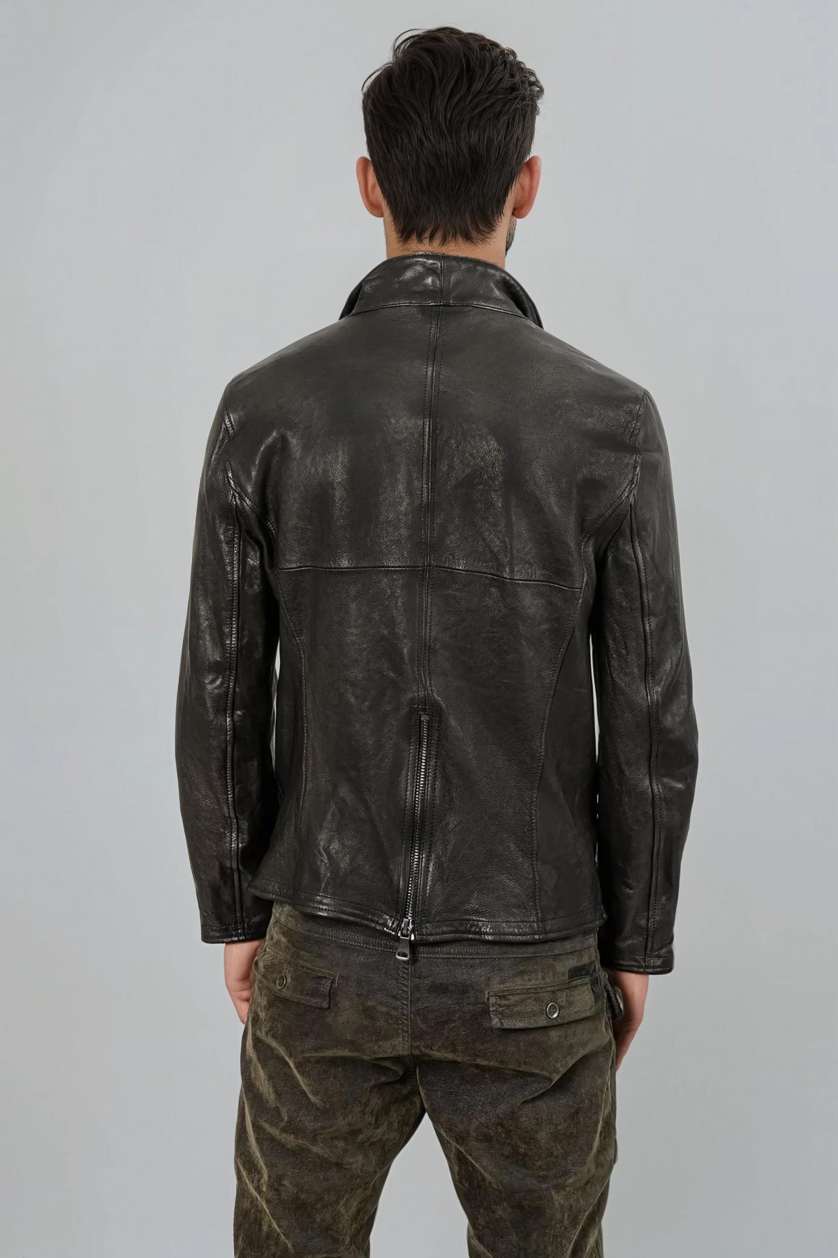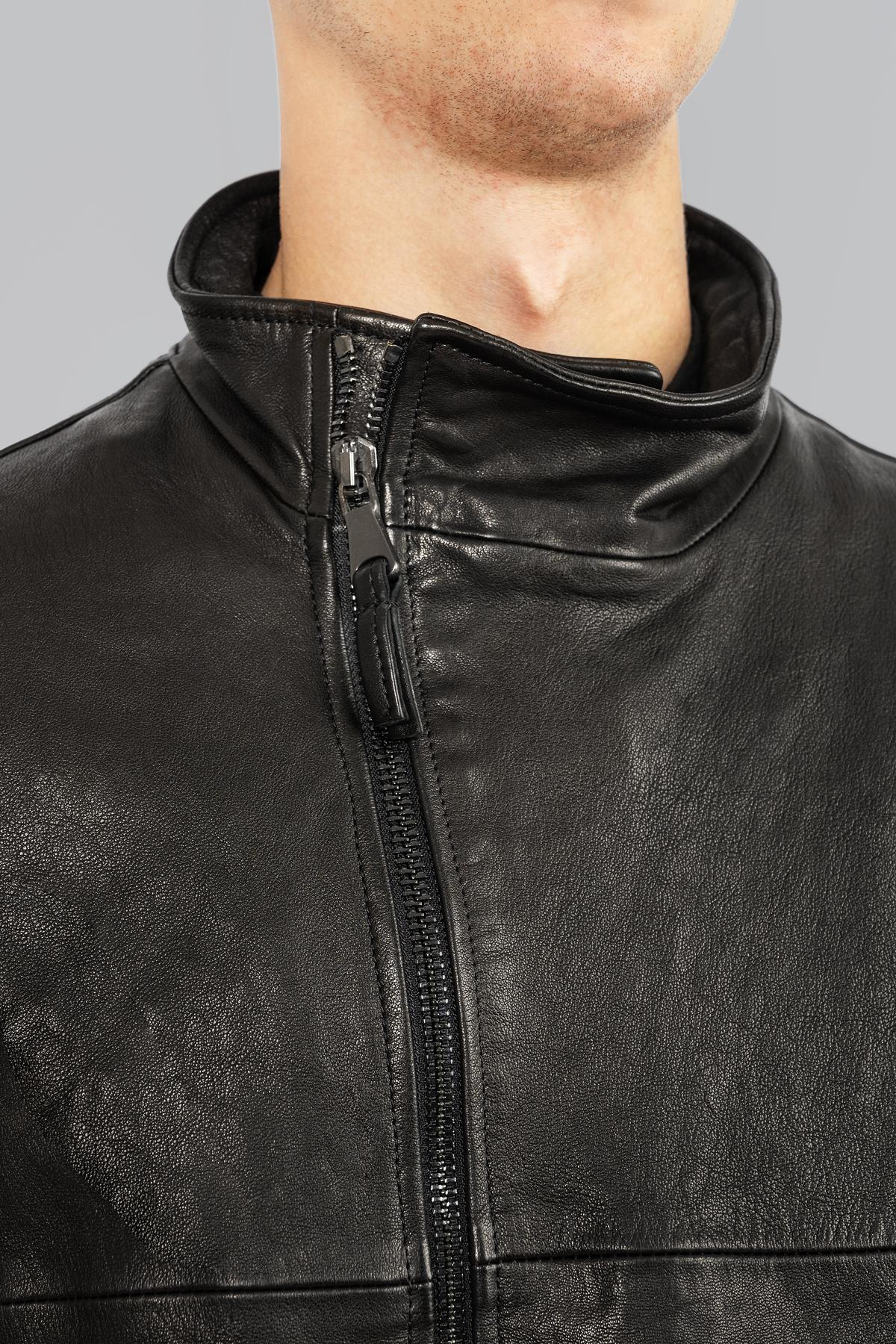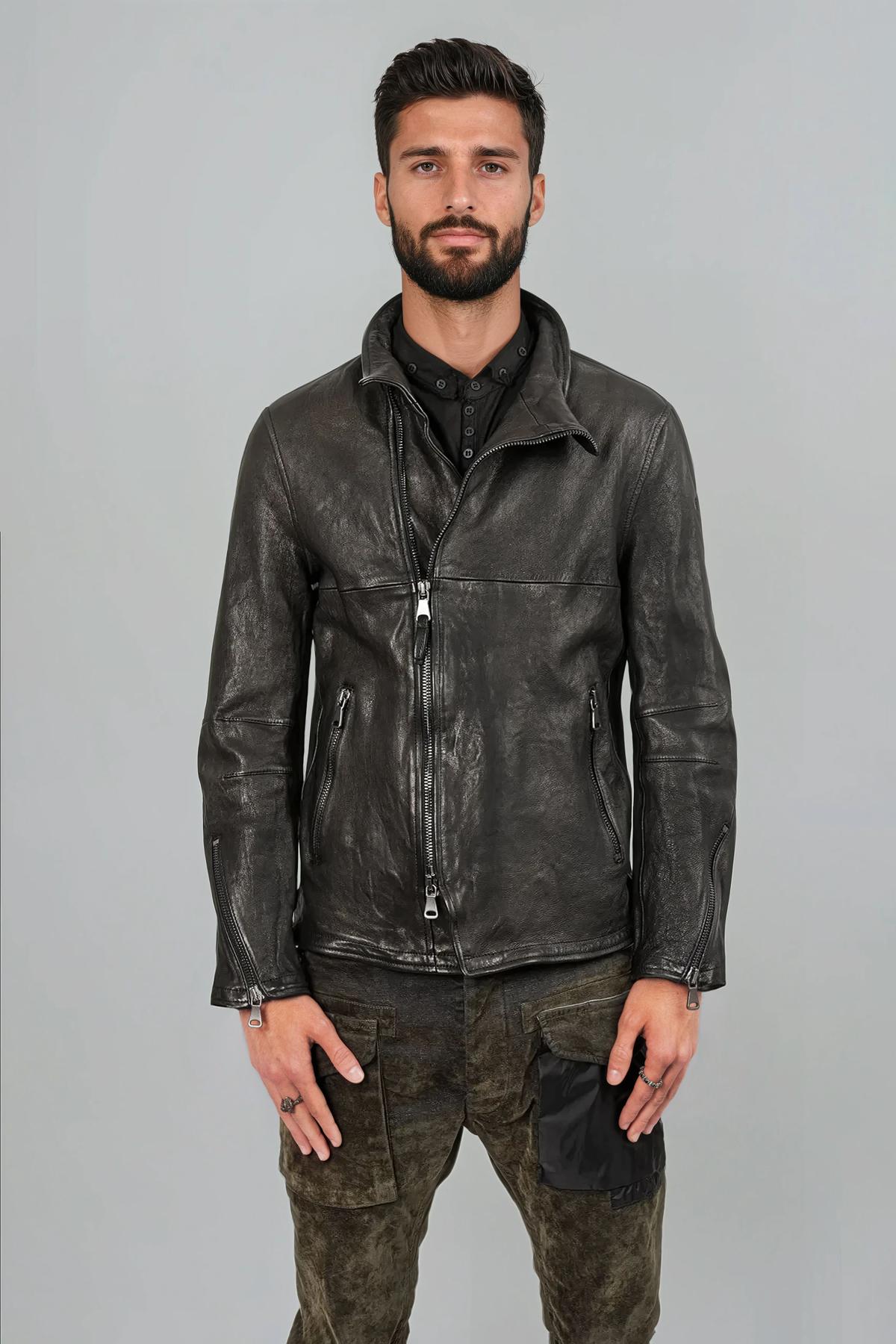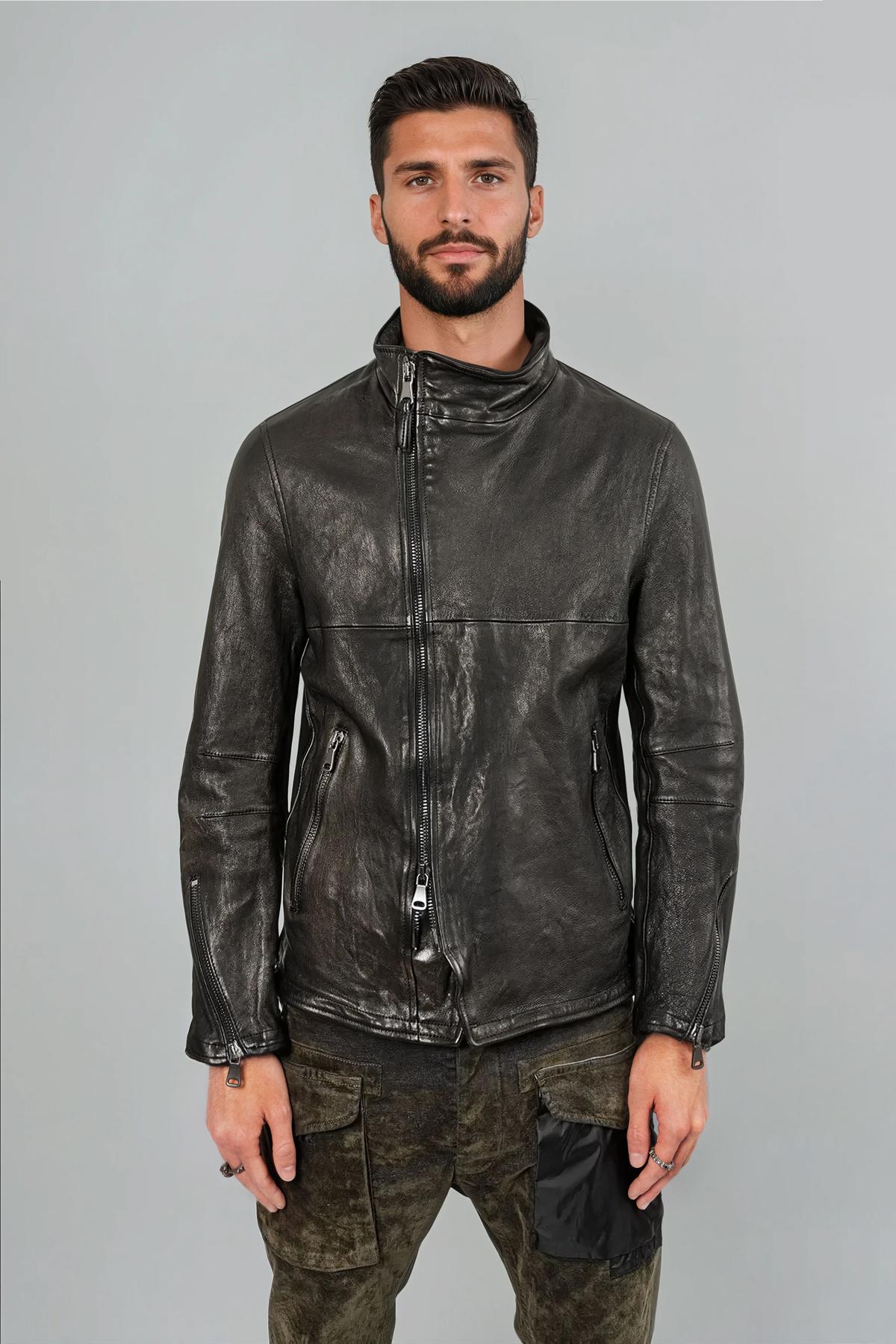Giacca in pelle con collo coreano, trattamento vegetale della pelle. Chiusura asimmetrica con zip in metallo. Senza fodera con stampa interna teschio.