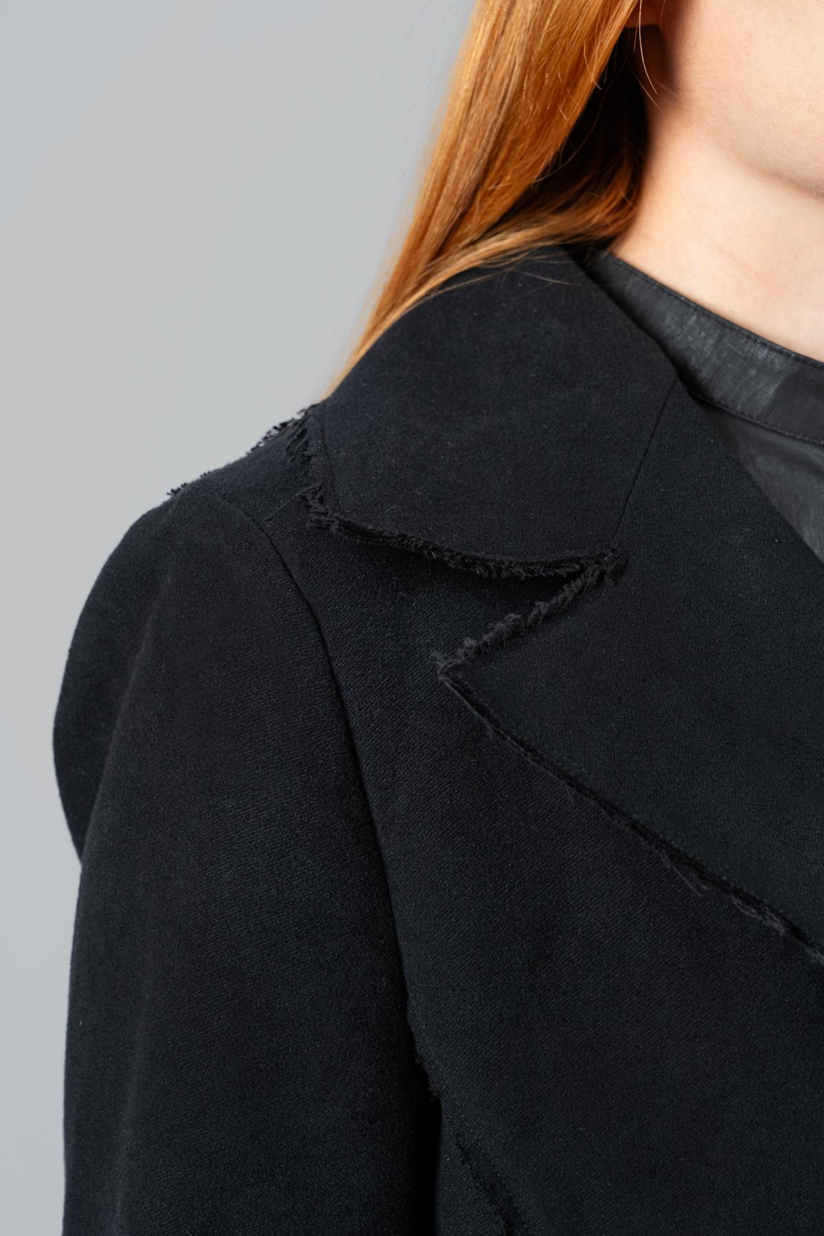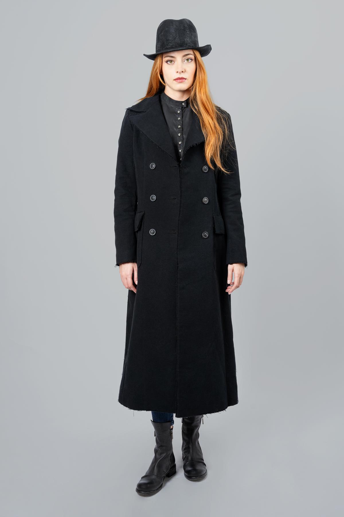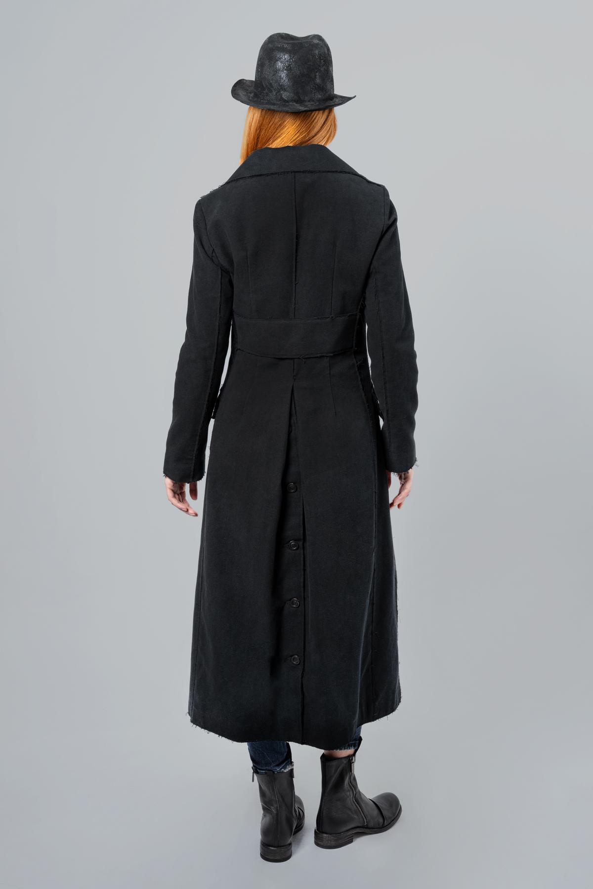 Cappotto doppiopetto con ampi revers. Chiusura a sei bottoni. Martingala e dettaglio di bottoni nel retro. Interno con fodera impreziosita dalla stampa con la poesia Empr ...