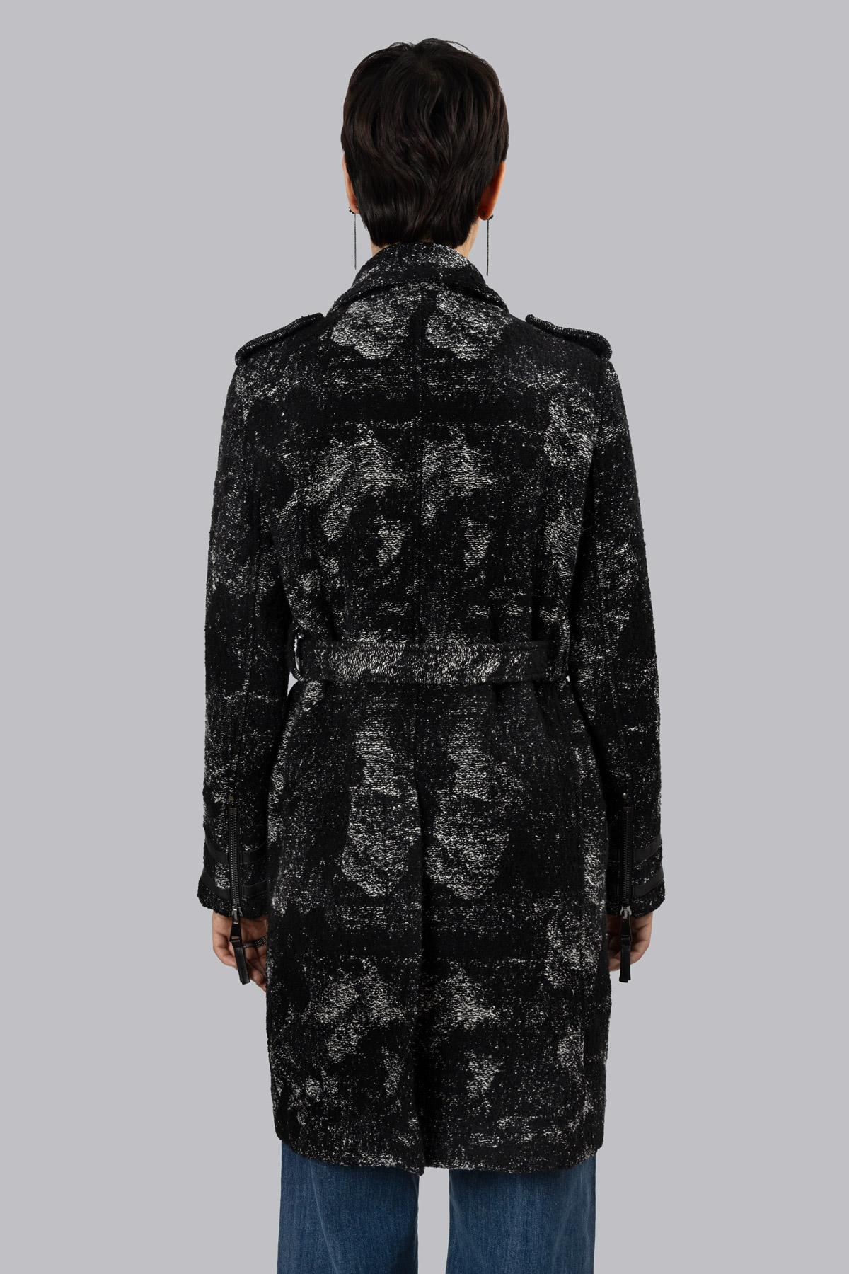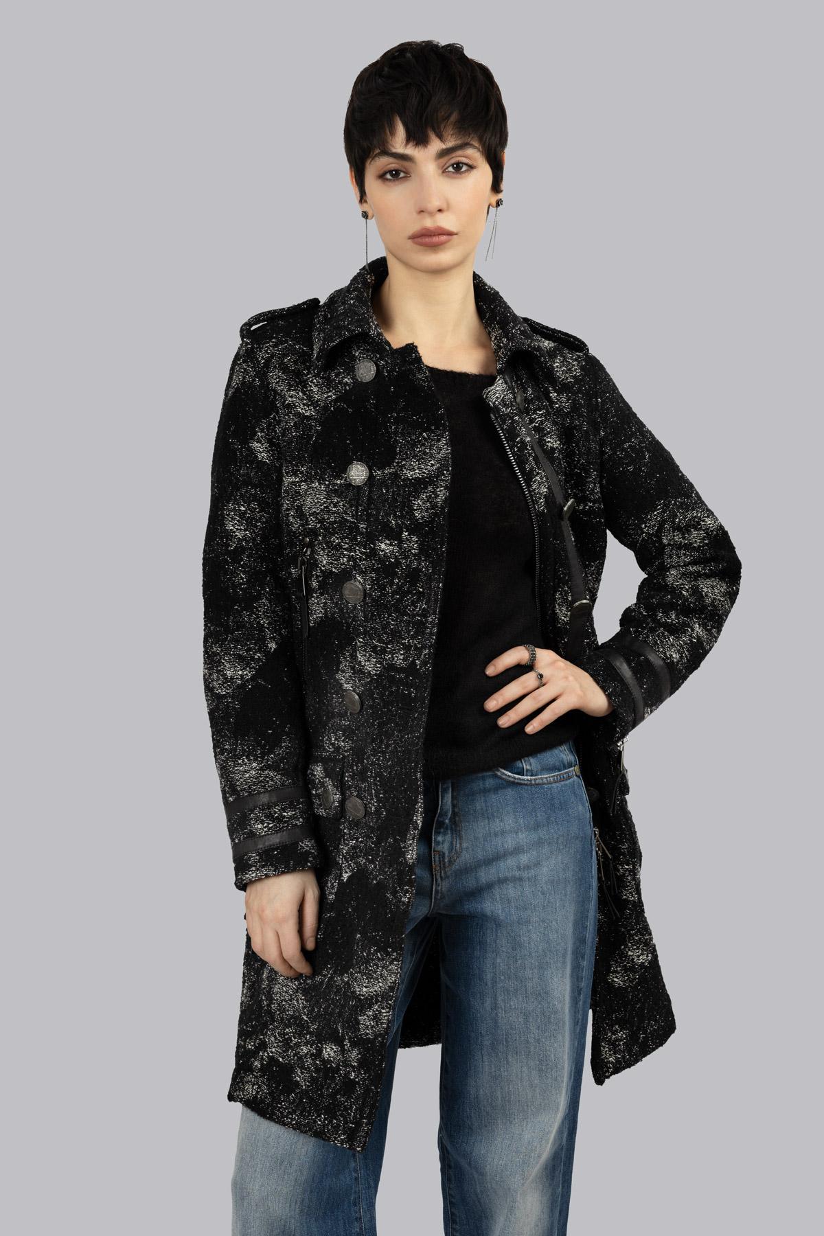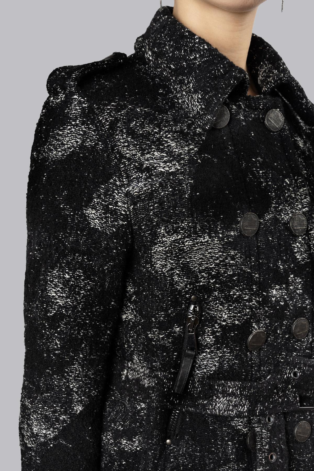 Cappotto in lana e canapa sfoderato con profilo taglio vivo e fantasia texturizzata irregolare. Chiusura a doppio petto con bottoni in metallo martellati effetto invecchiato e cerniera centrale, tasche a filetto con chiusura lampo e due tasche a pattina con bottoni a pressione. Dotato di cintura per definire la silhouette, sulle maniche due zip.