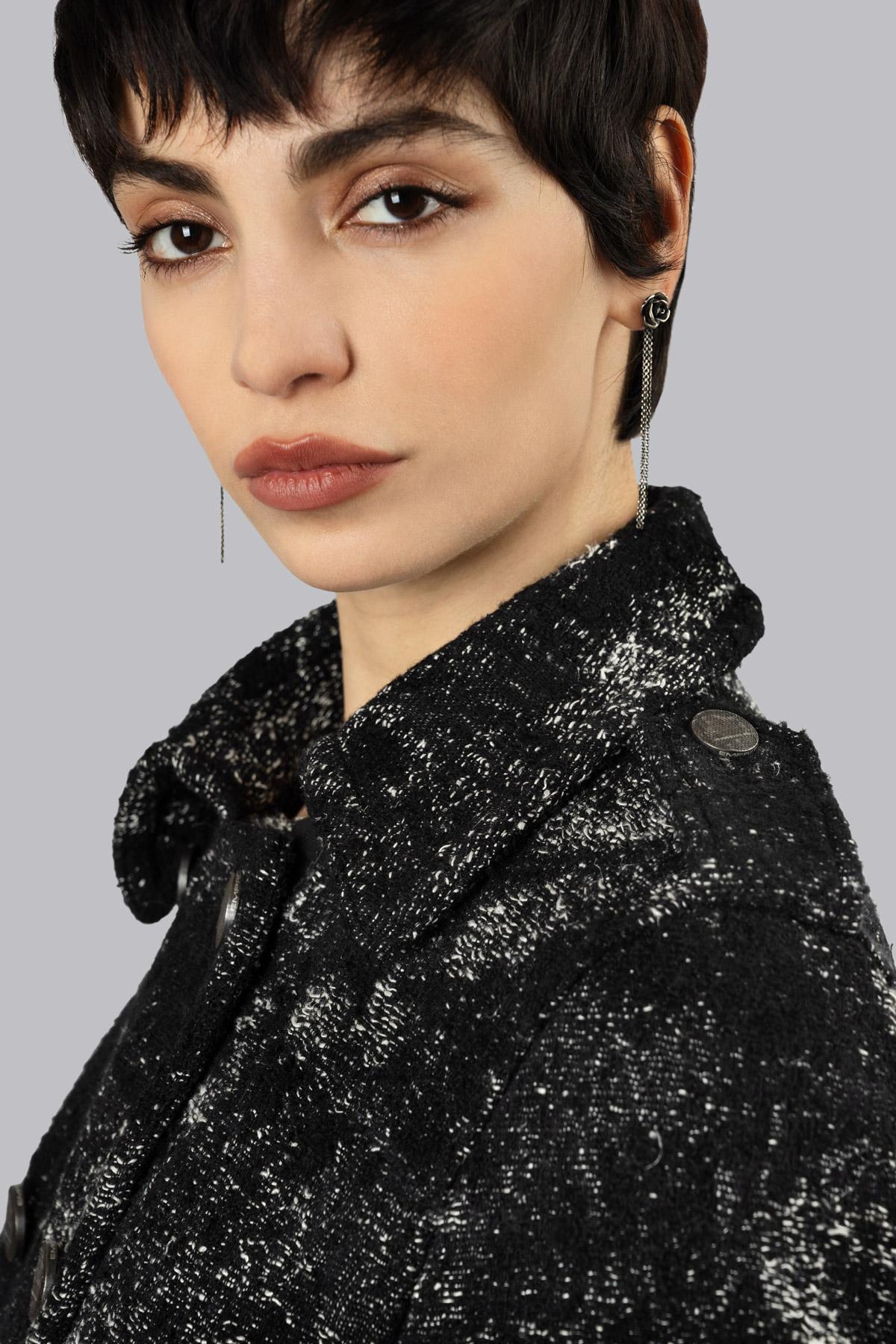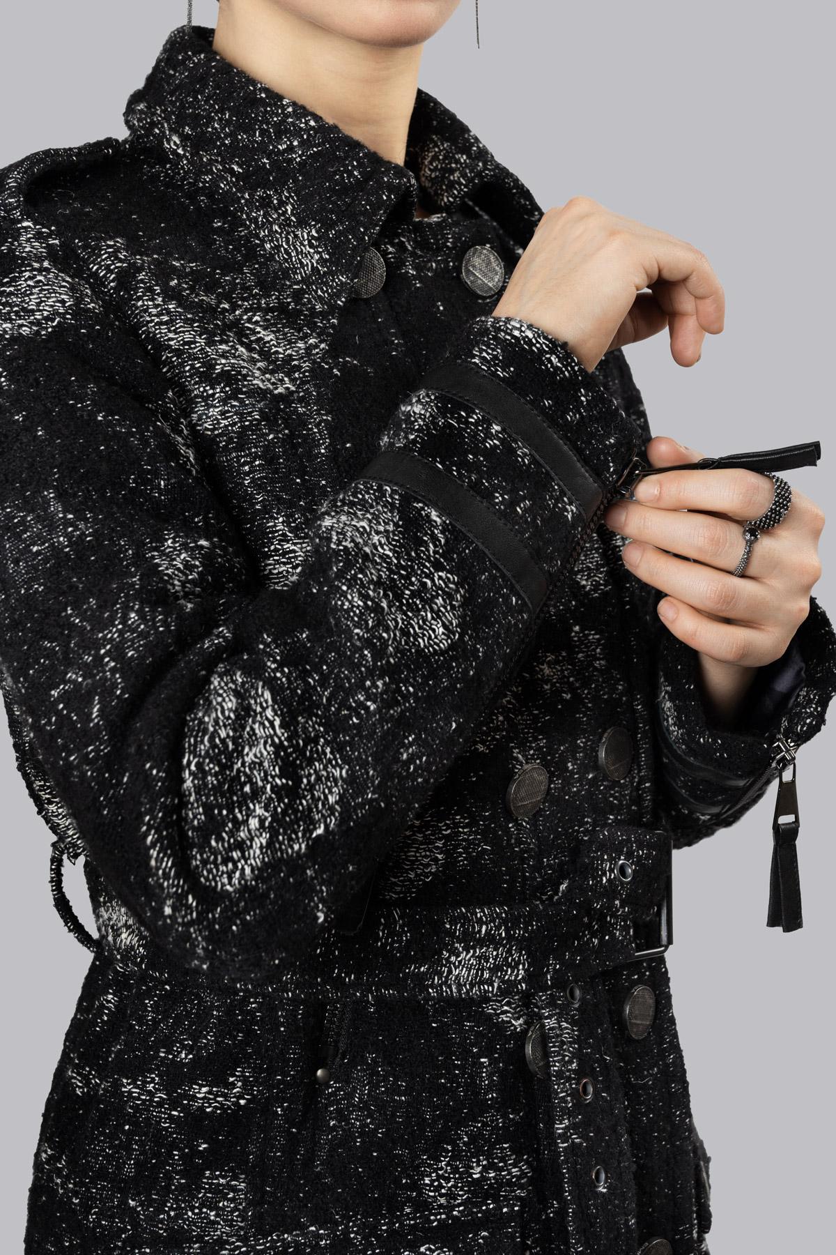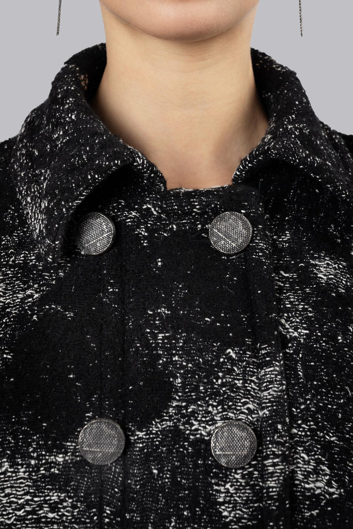 Cappotto in lana e canapa sfoderato con profilo taglio vivo e fantasia texturizzata irregolare. Chiusura a doppio petto con bottoni in metallo martellati effetto invecchiato e cerniera centrale, tasche a filetto con chiusura lampo e due tasche a pattina con bottoni a pressione. Dotato di cintura per definire la silhouette, sulle maniche due zip.