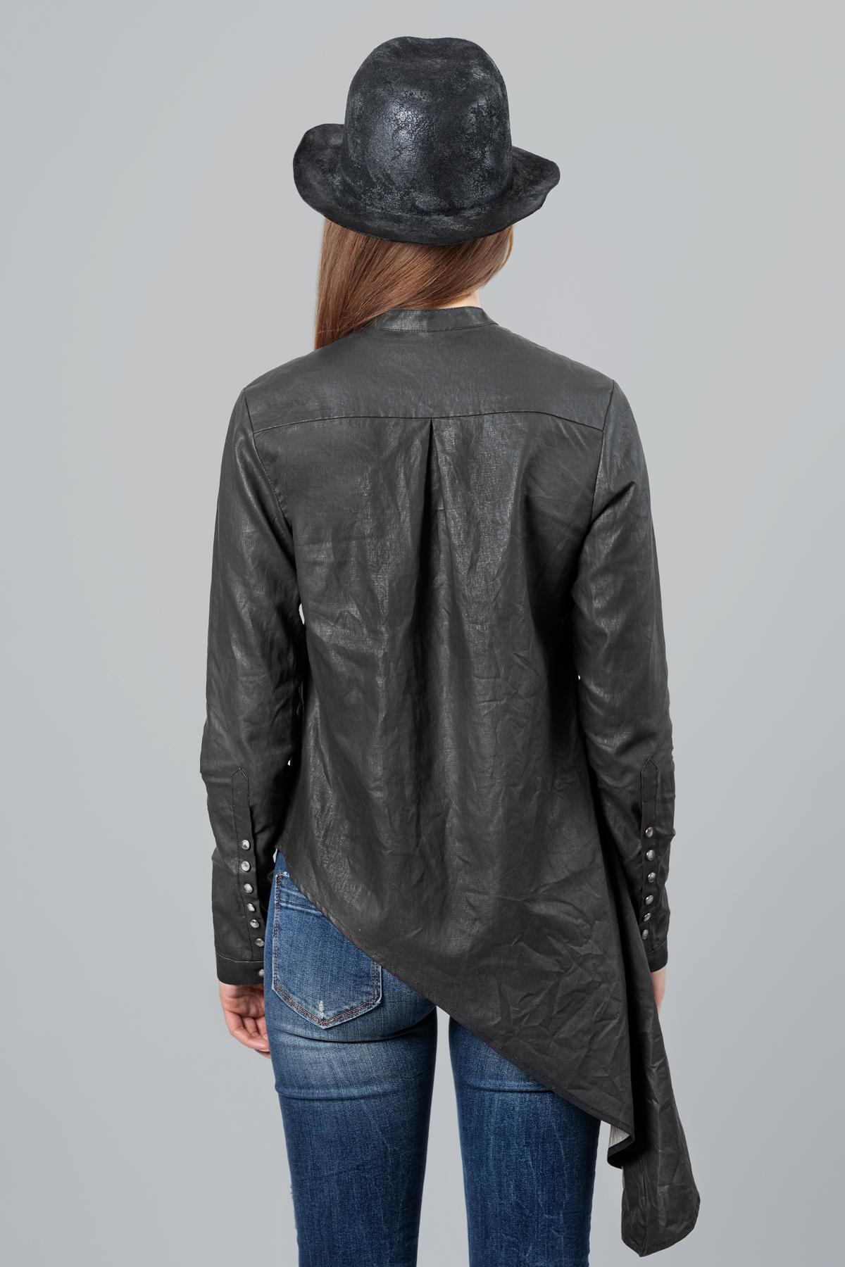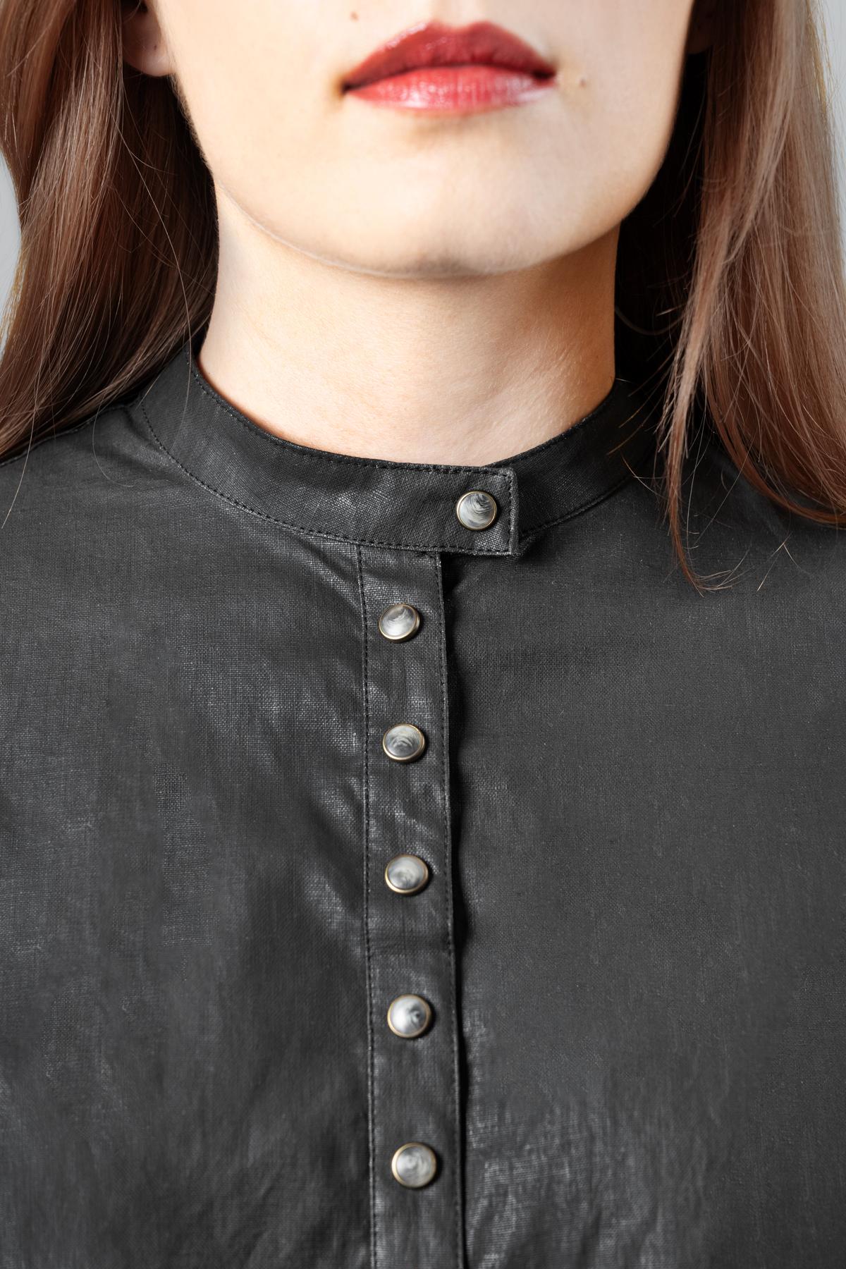 Camicia in lino resinato, dal taglio asimmetrico. Colletto alla coreana e chiusura con bottoni automatici.