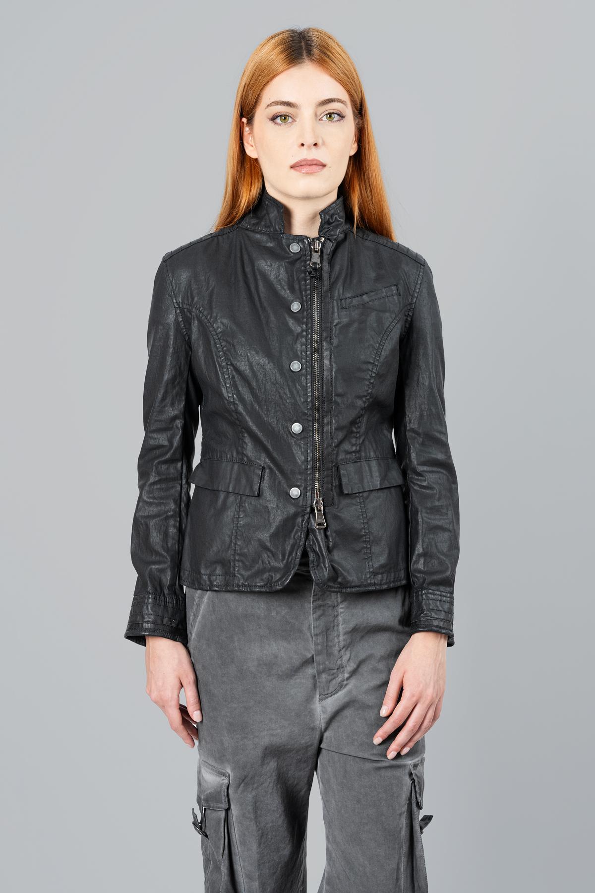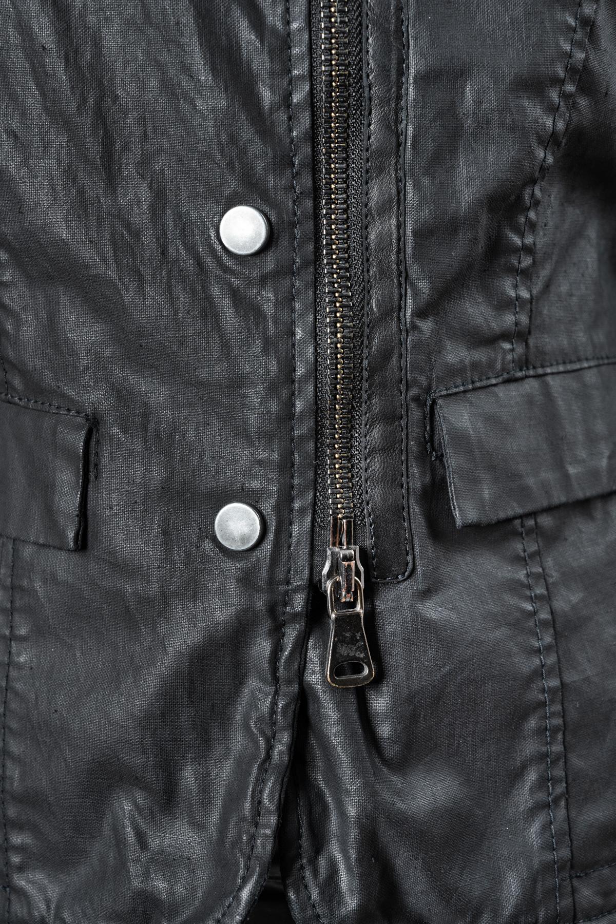 Giacca sfoderata, in cotone resinato. Chiusura centrale con bottoni automatici e chiusura lampo. Due tasche a pattina sul davanti e zip sulle maniche. Stampa interna con teschio.