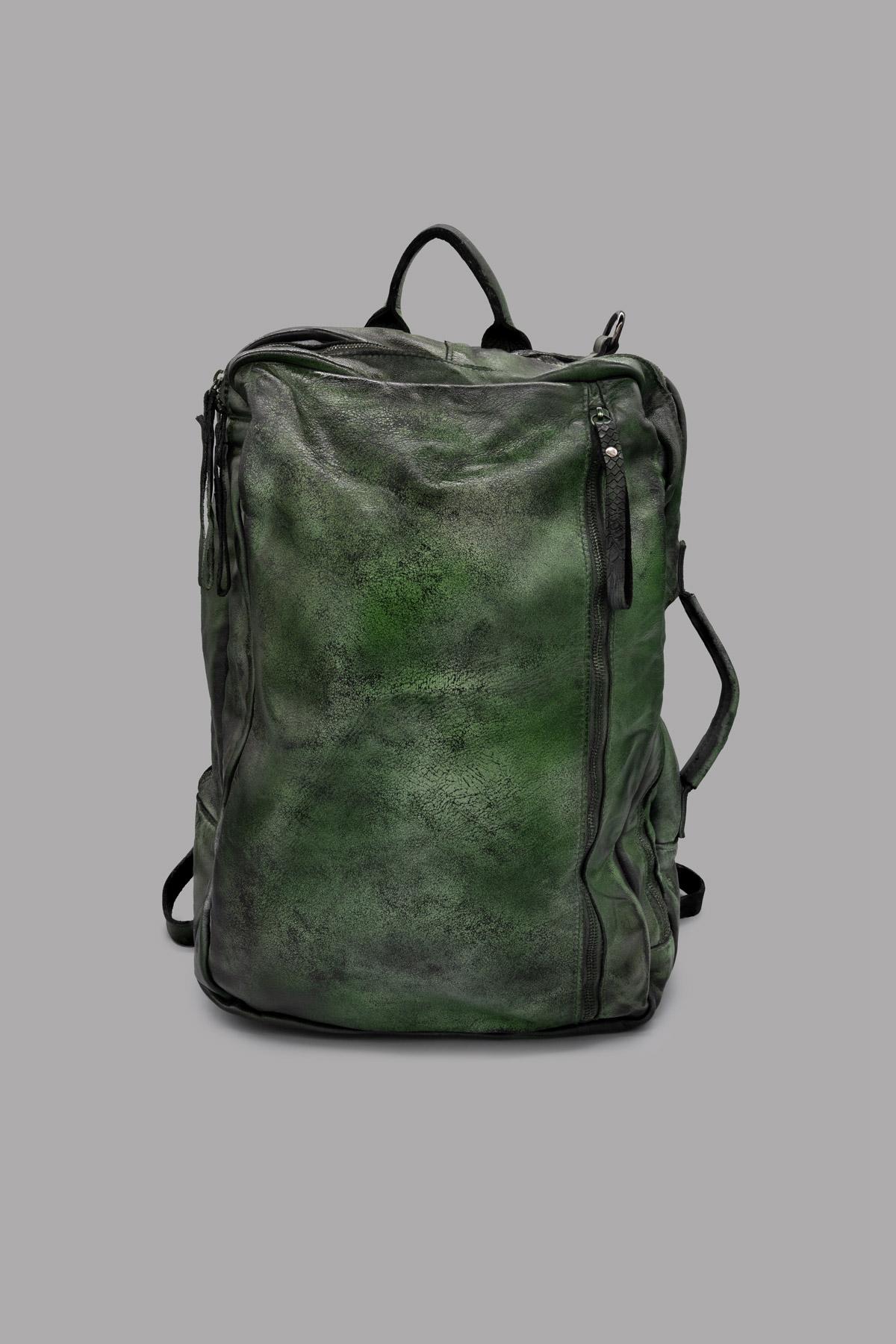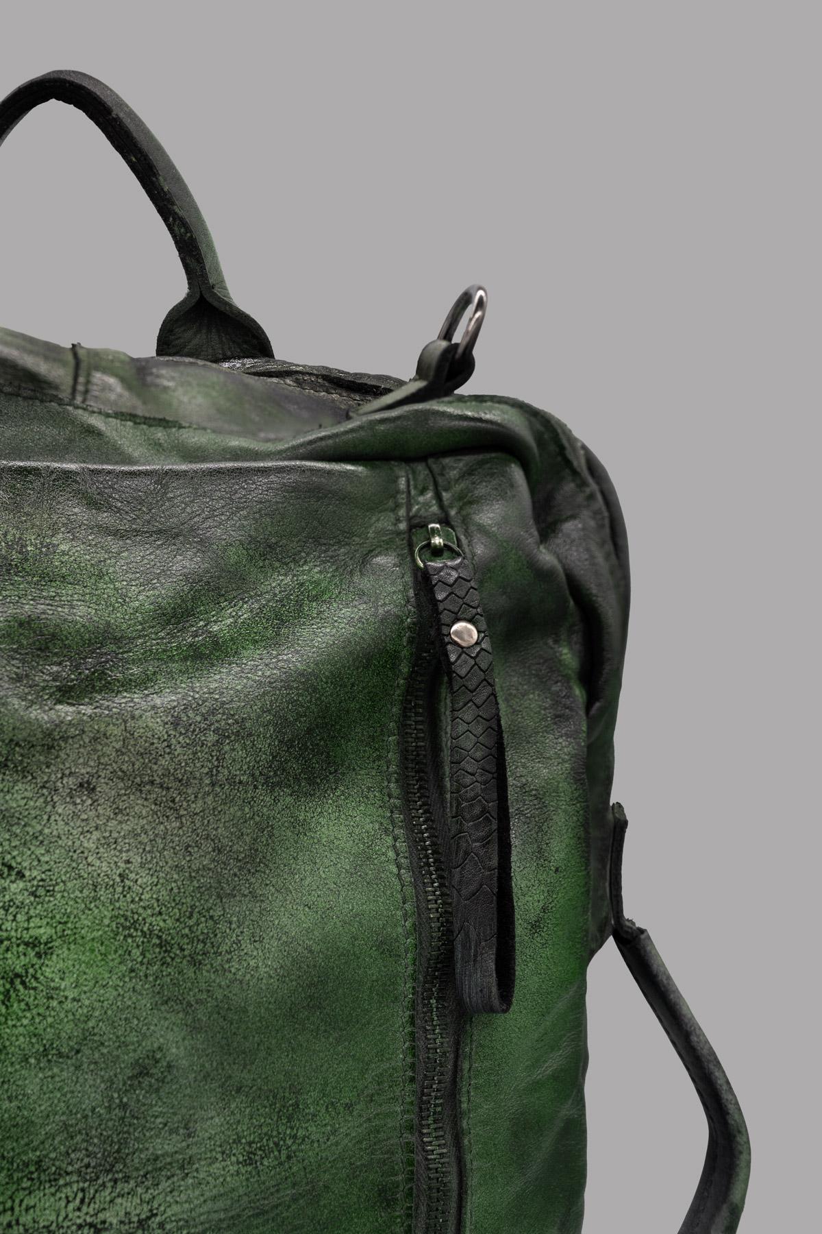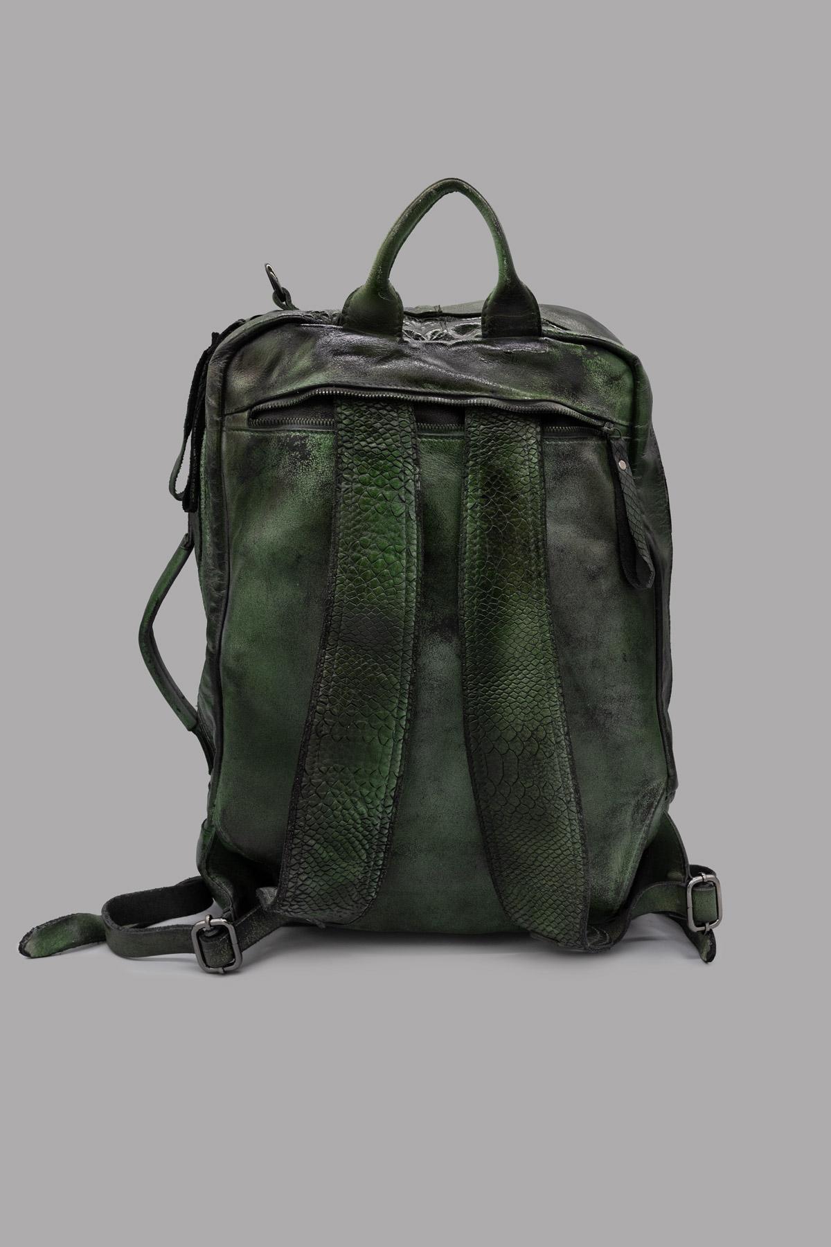 Zaino in pelle tamponata a mano, con chiusura lampo. Inserendo nella tasca posteriore le cinghie dello zaino, la borsa può essere indossata anche a tracolla o a mano.