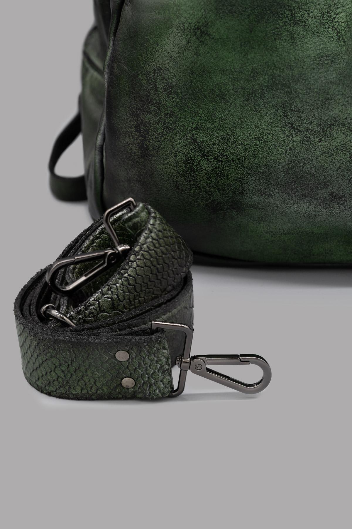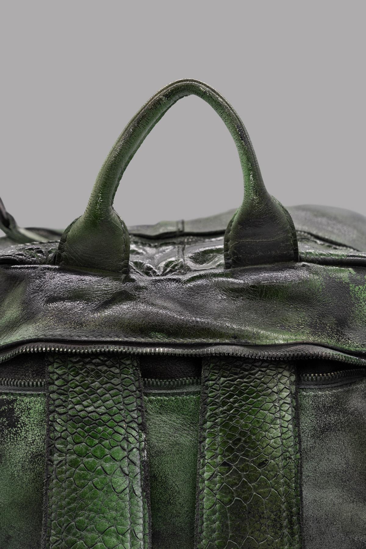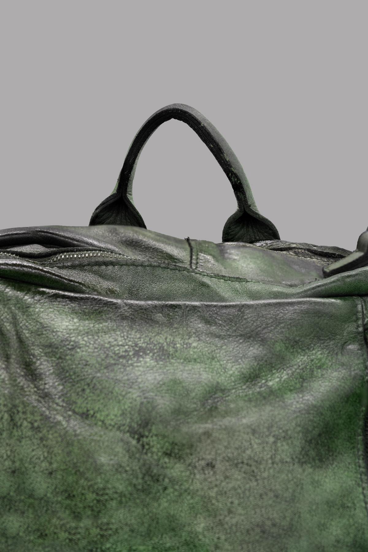 Zaino in pelle tamponata a mano, con chiusura lampo. Inserendo nella tasca posteriore le cinghie dello zaino, la borsa può essere indossata anche a tracolla o a mano.