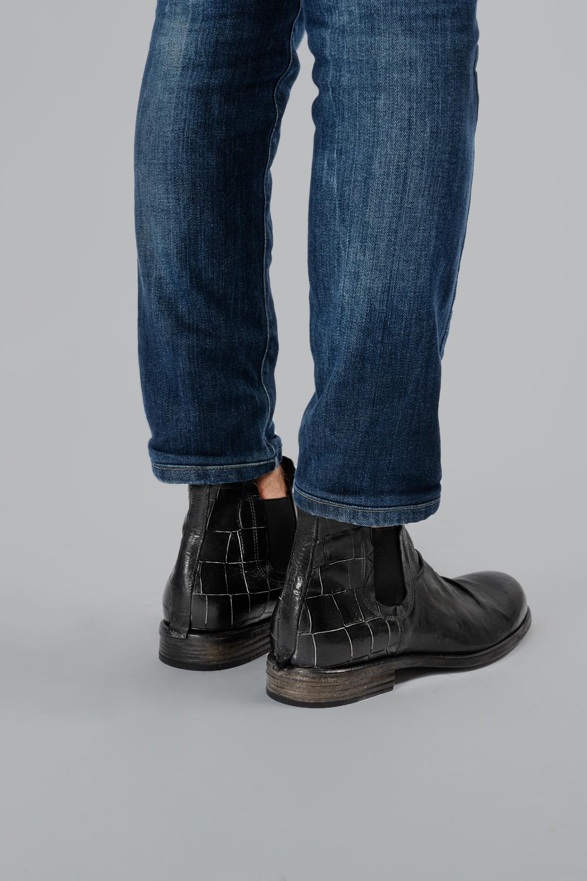Stivaletto Chelsea in pelle con dettaglio posteriore in texture coccodrillata. Suola e tacchi di 3 cm realizzati con diversi strati di cuoio.