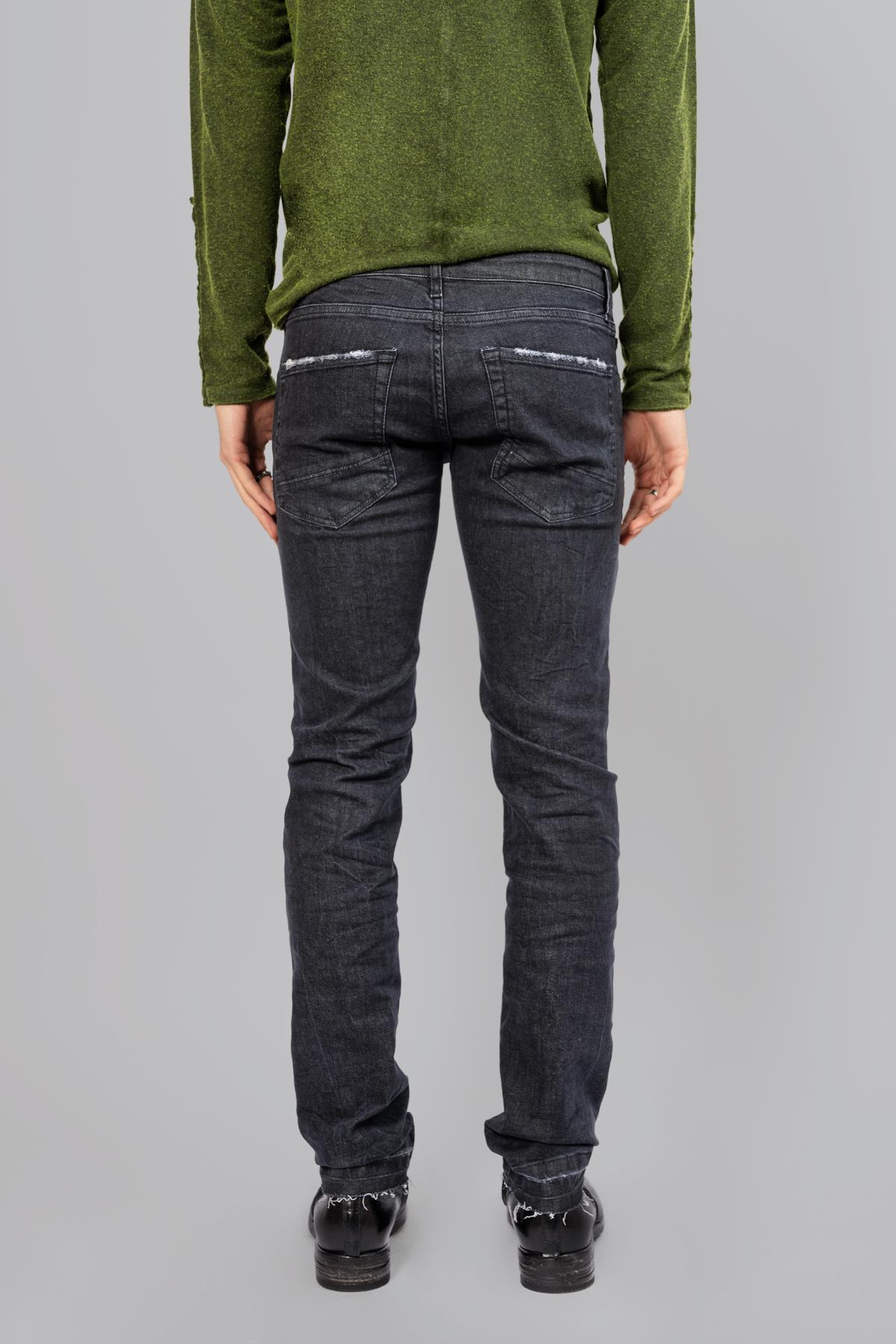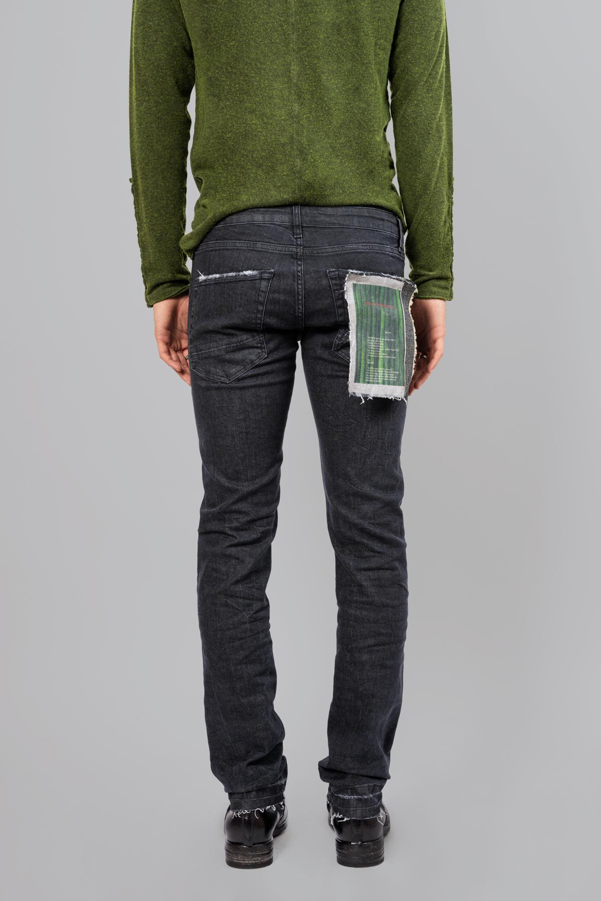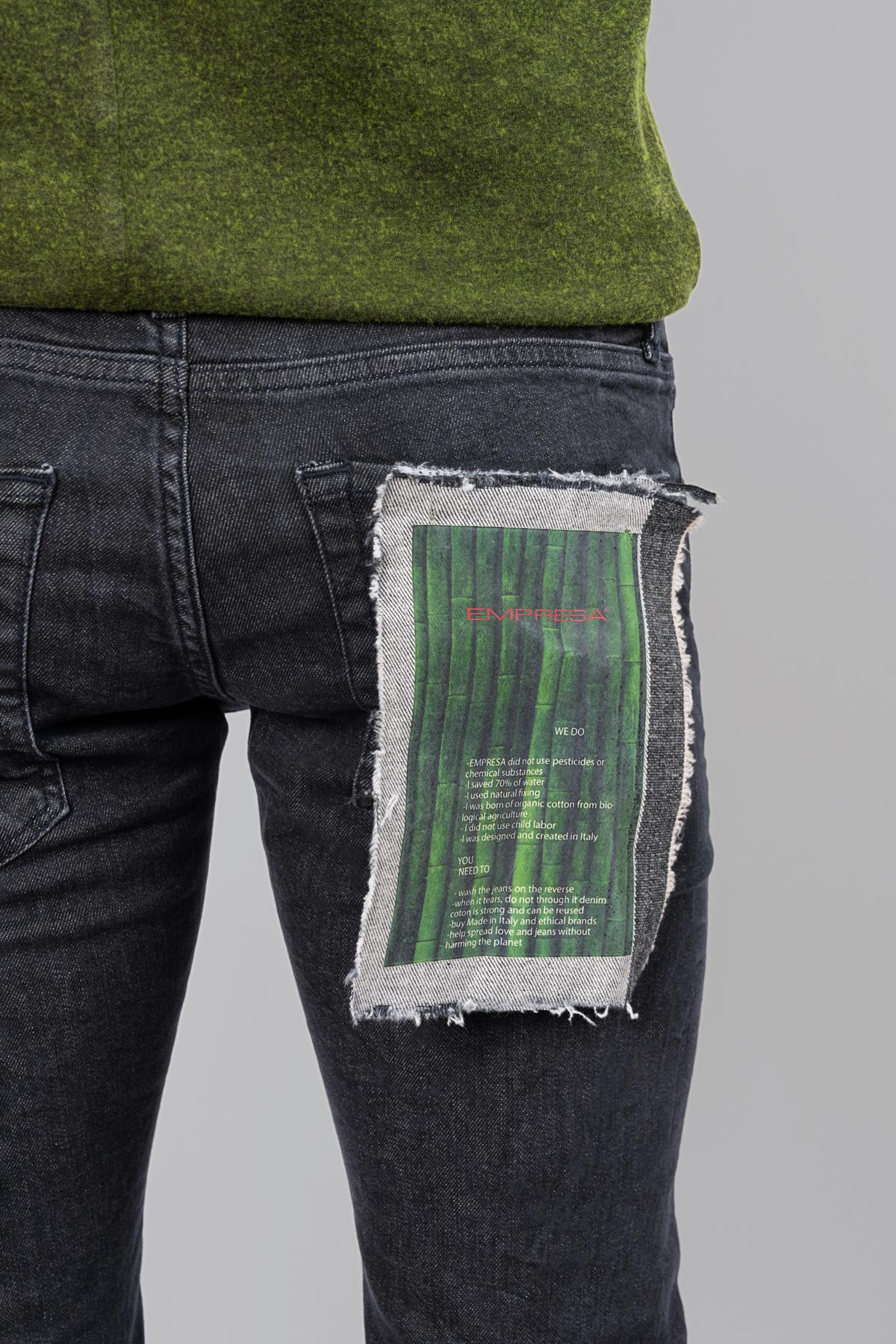 Jeans palazzo a vita alta. Una tasca anteriore e una posteriore rivestita in pelle. Chiusura centrale con bottone e zip.