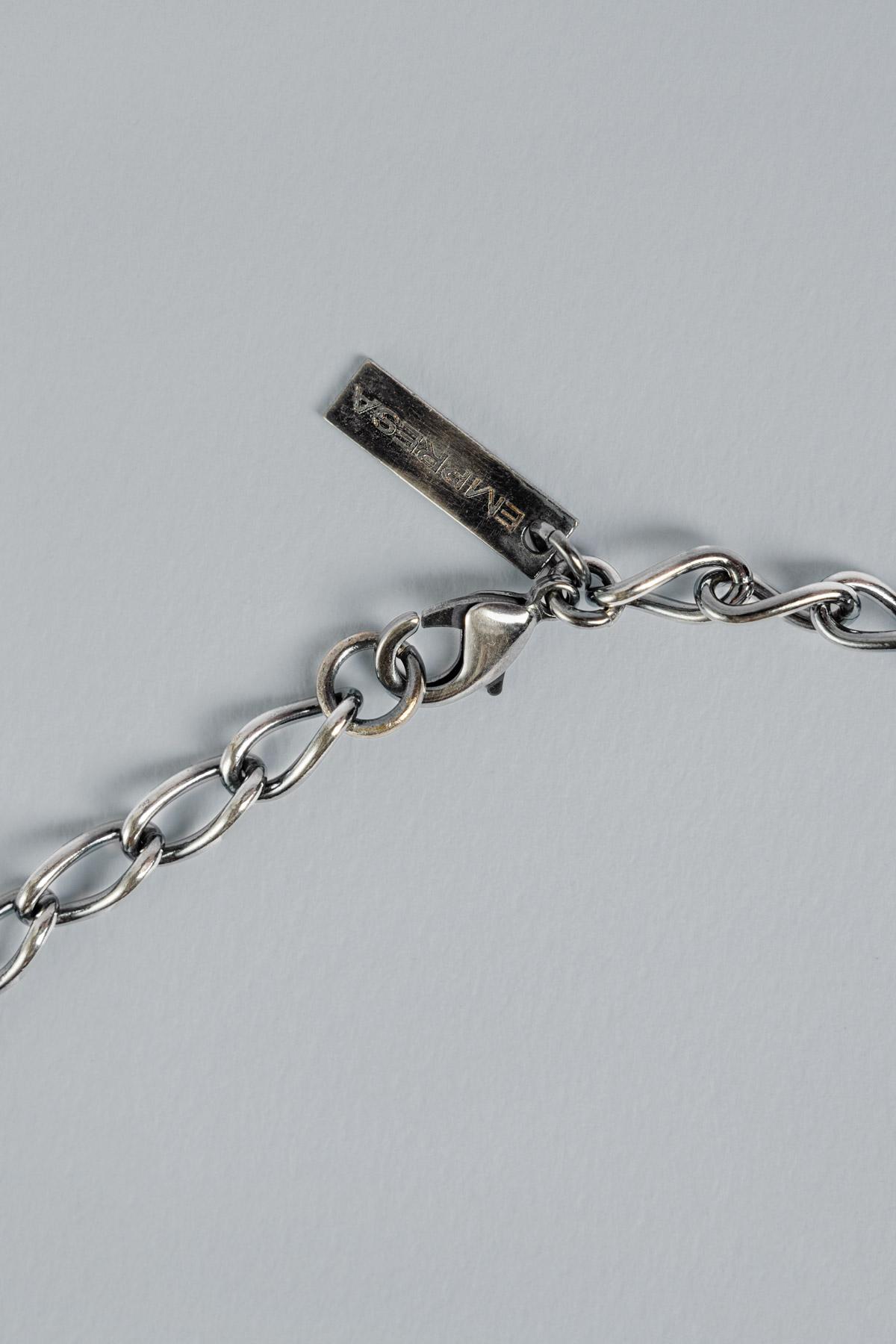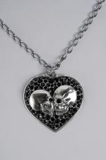 Collana con pendente a forma di cuore, impreziosito da due teschi finemente scolpiti e scintillanti pietre incastonate. Chiusura con moschettone.