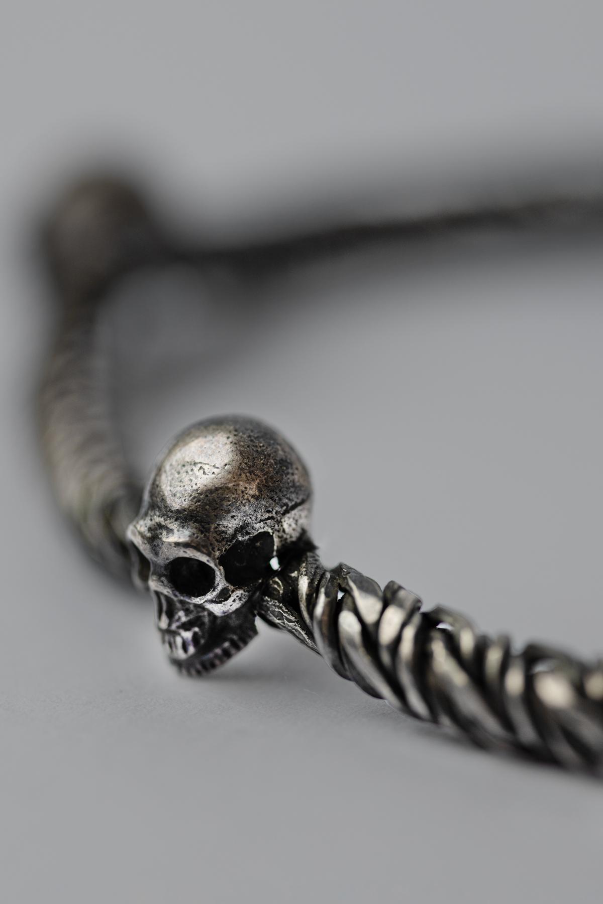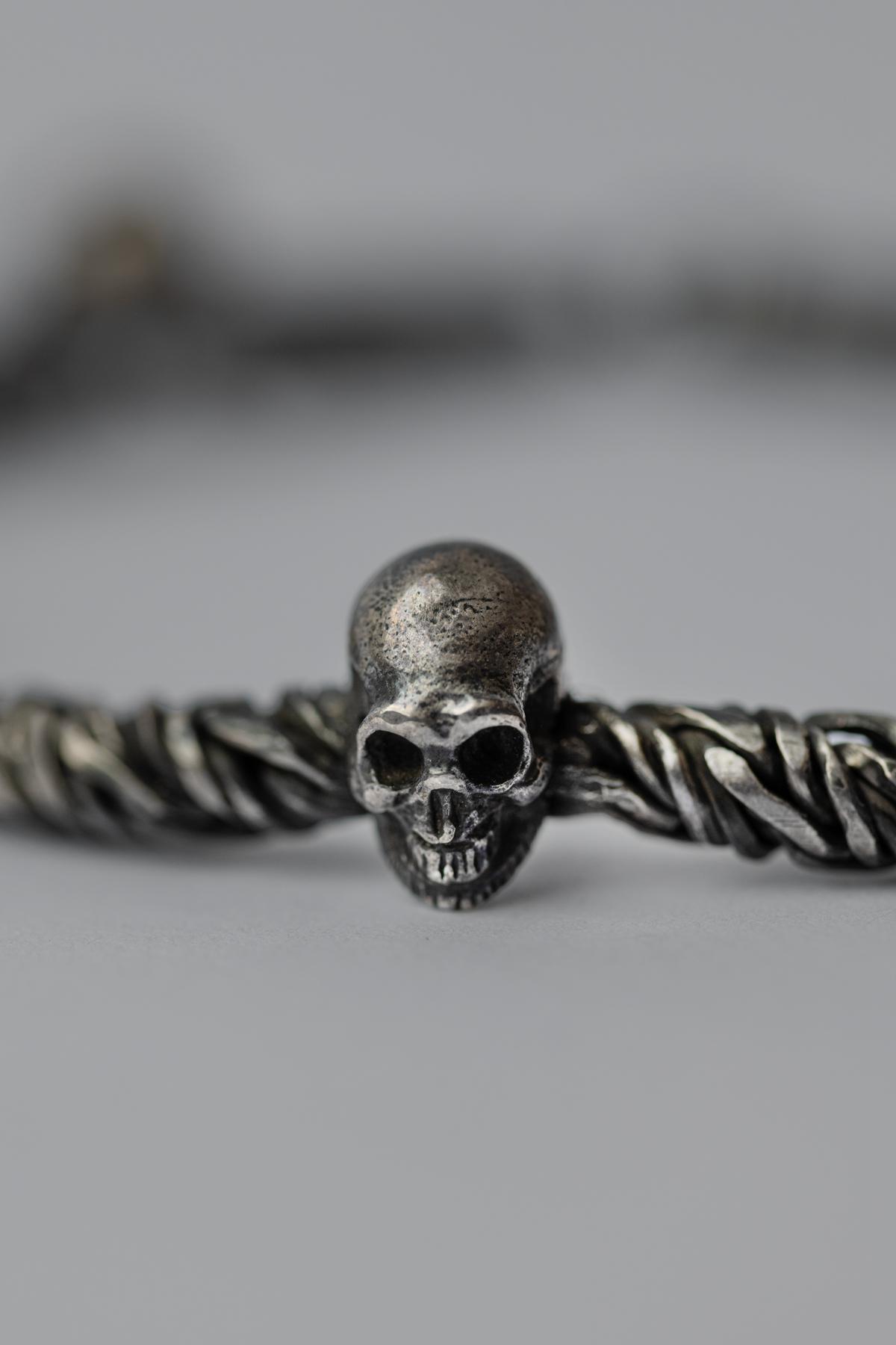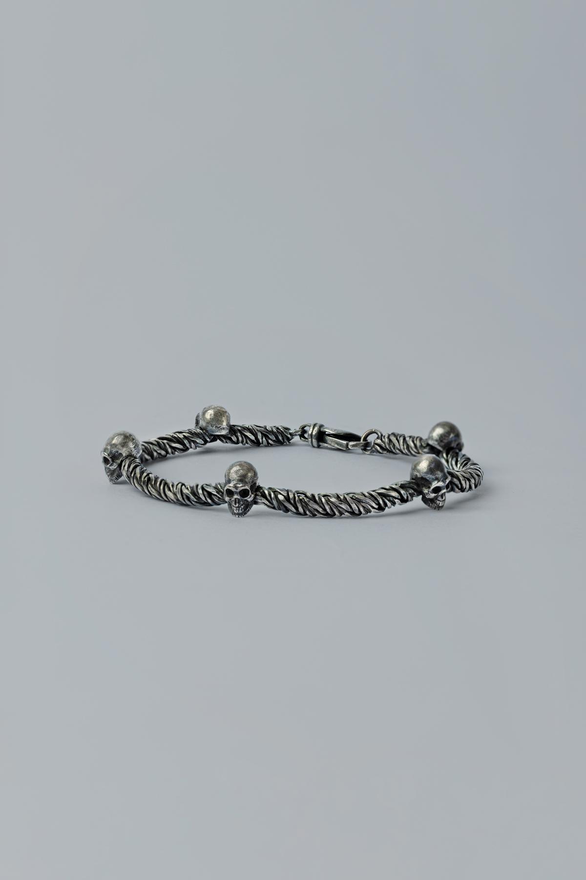 Silver bracelet inlaid with skulls. Lobster clasp closure.