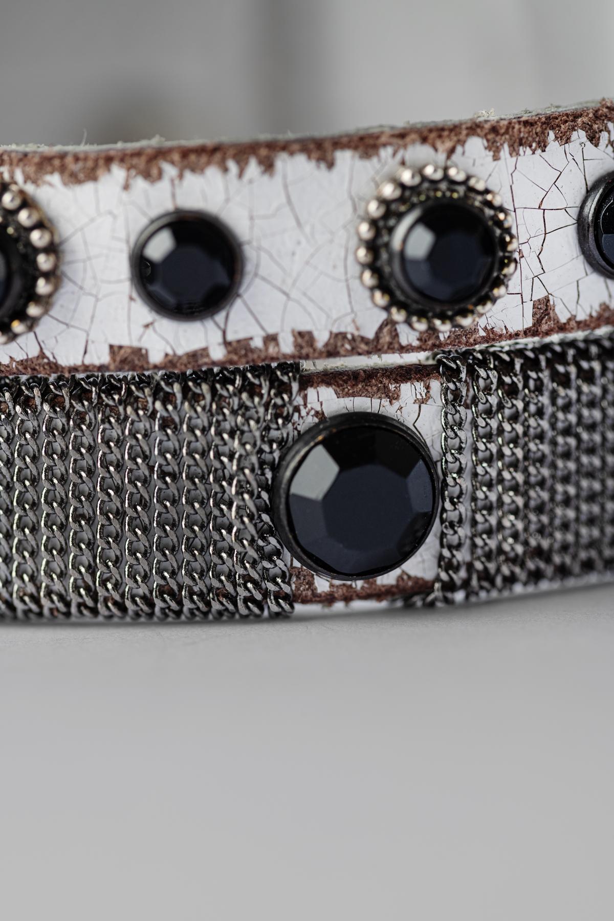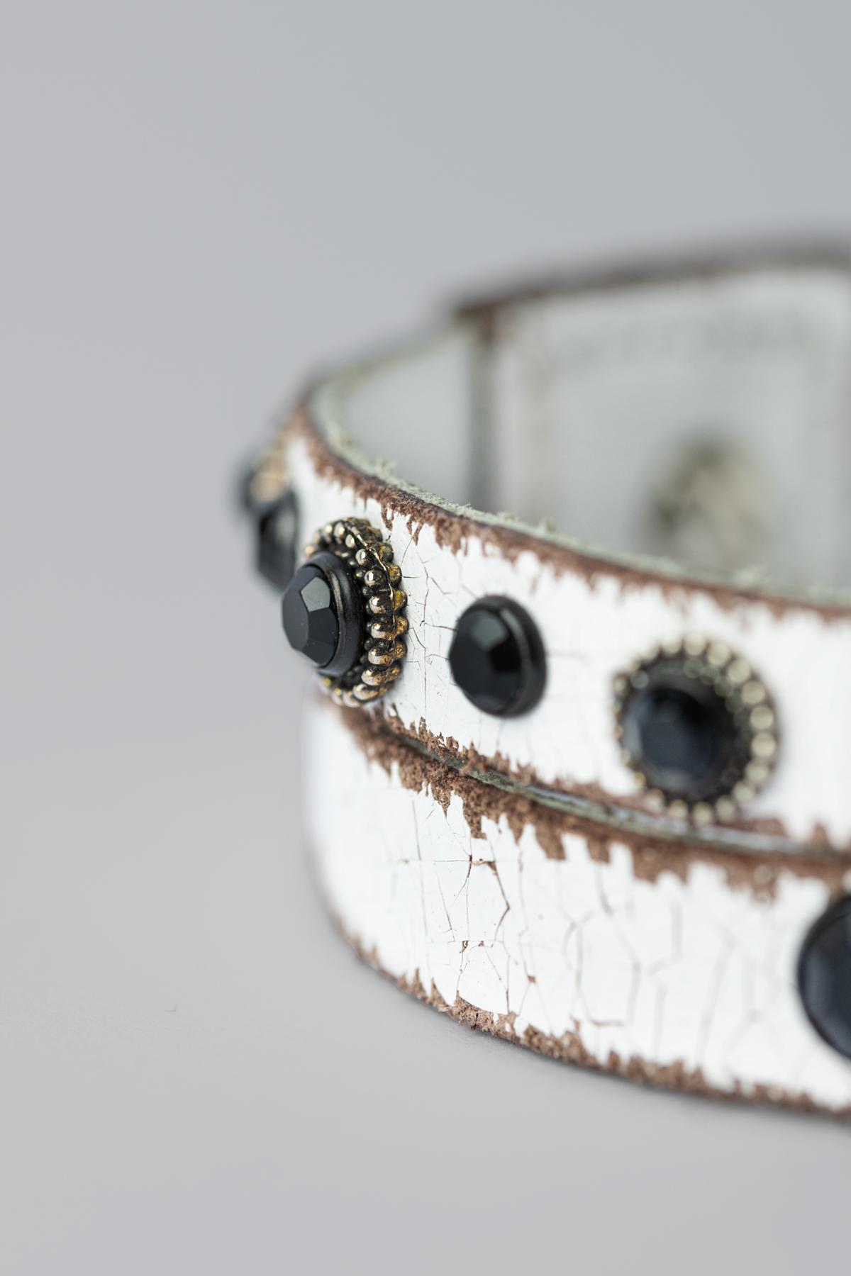 Double bracelet in ruined effect leather. Application of onyx stone and metal wires. Button closure with through hole
