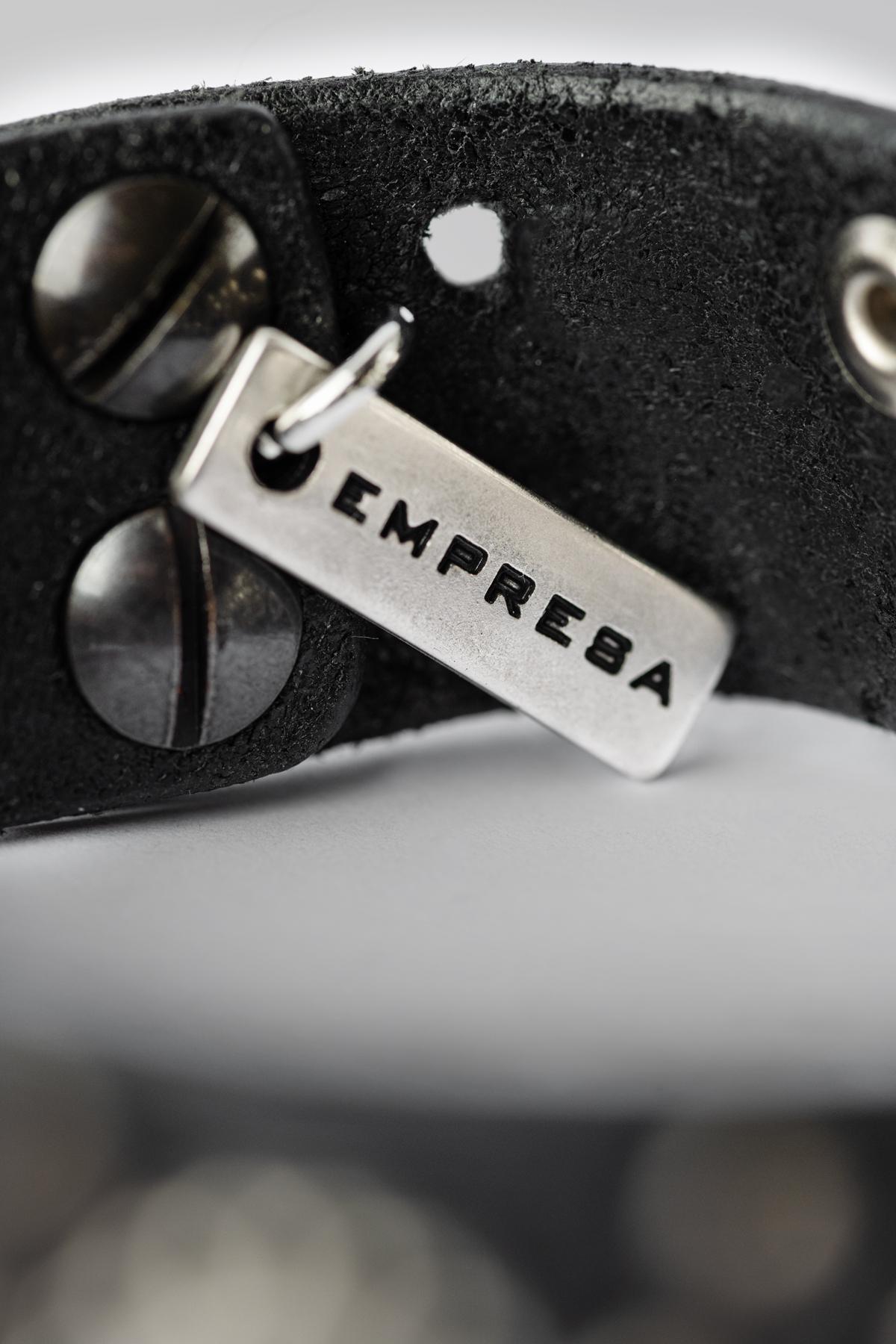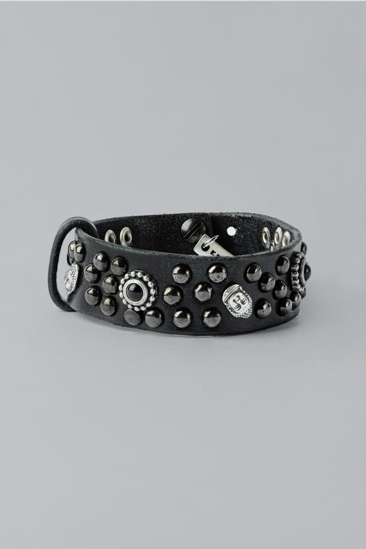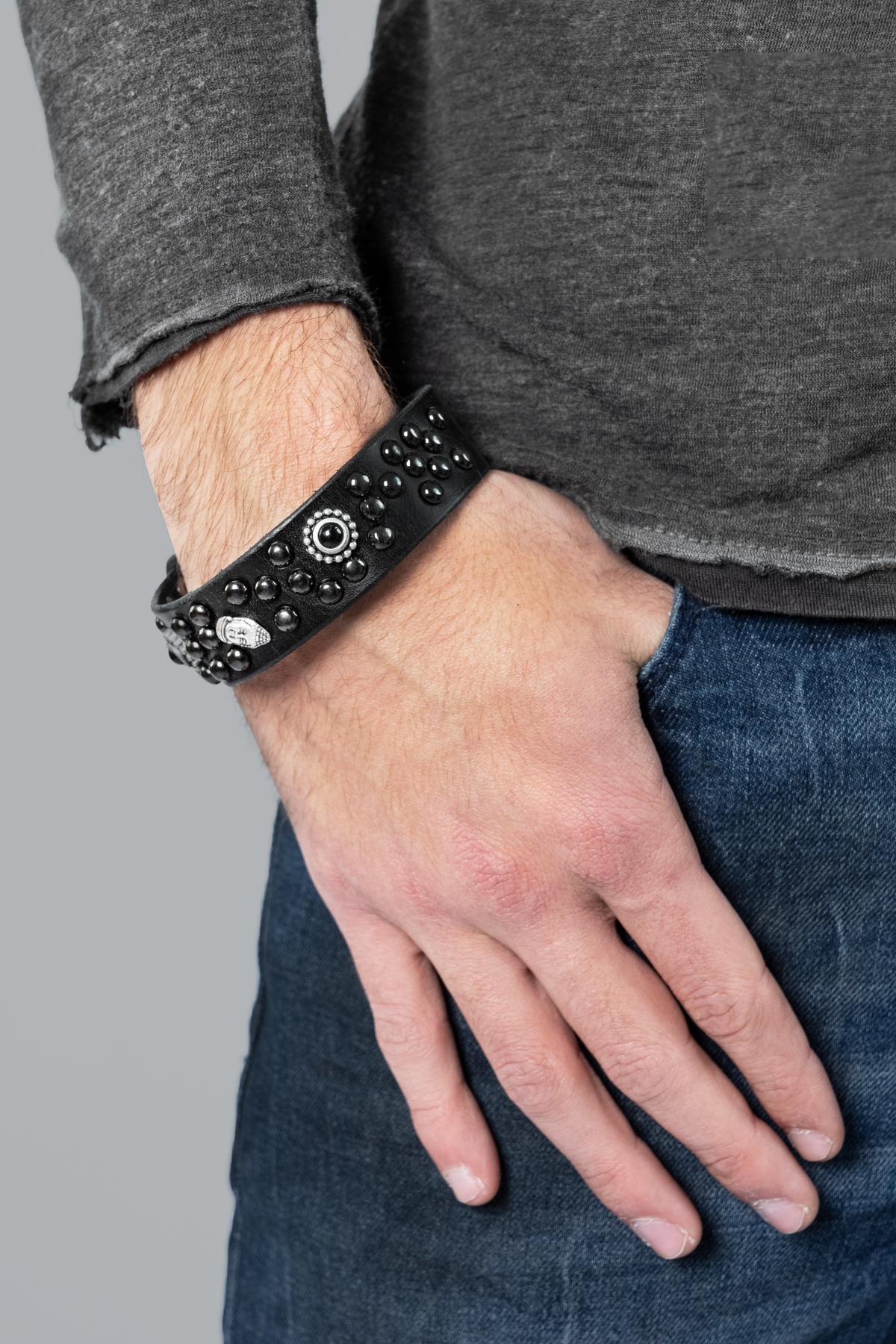 Band bracelet with studs, buddha and onyx stone. Button closure with through hole.