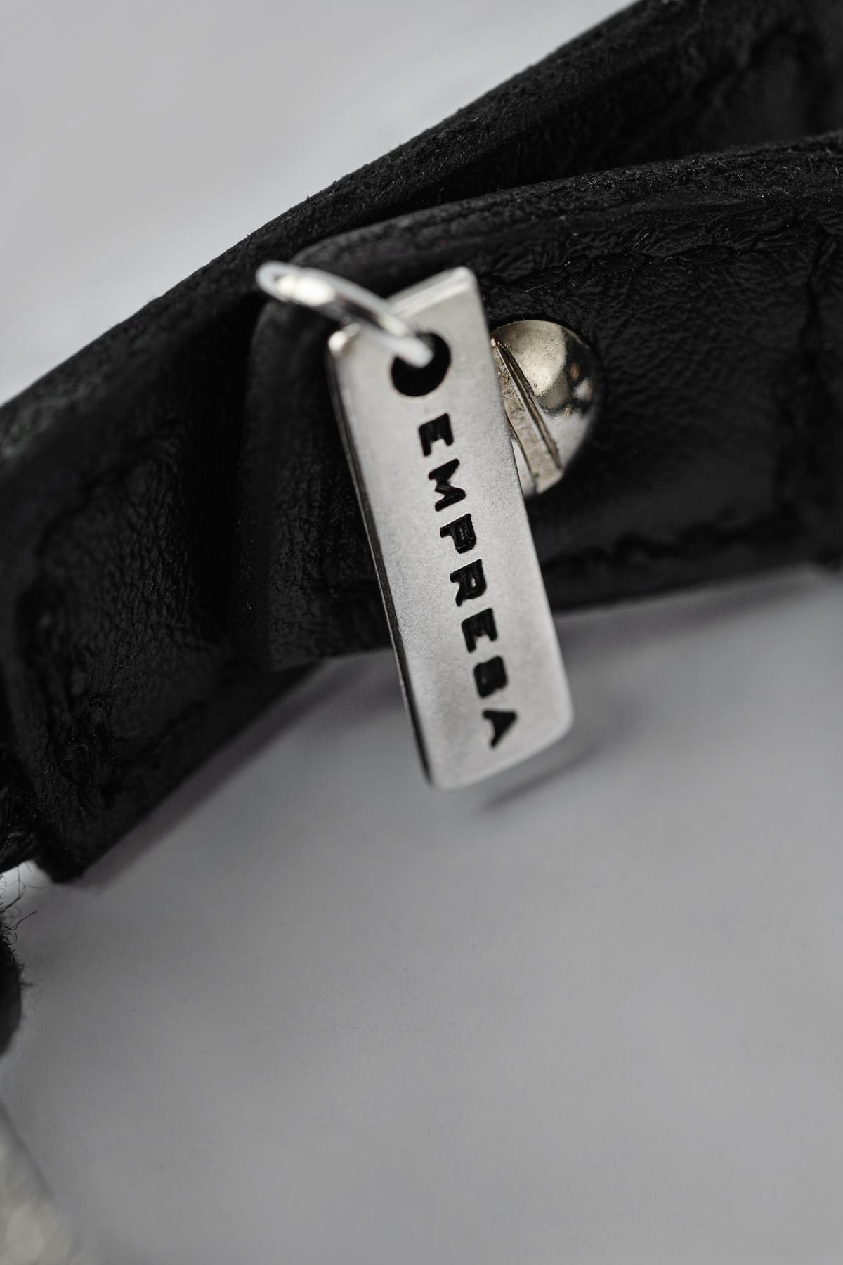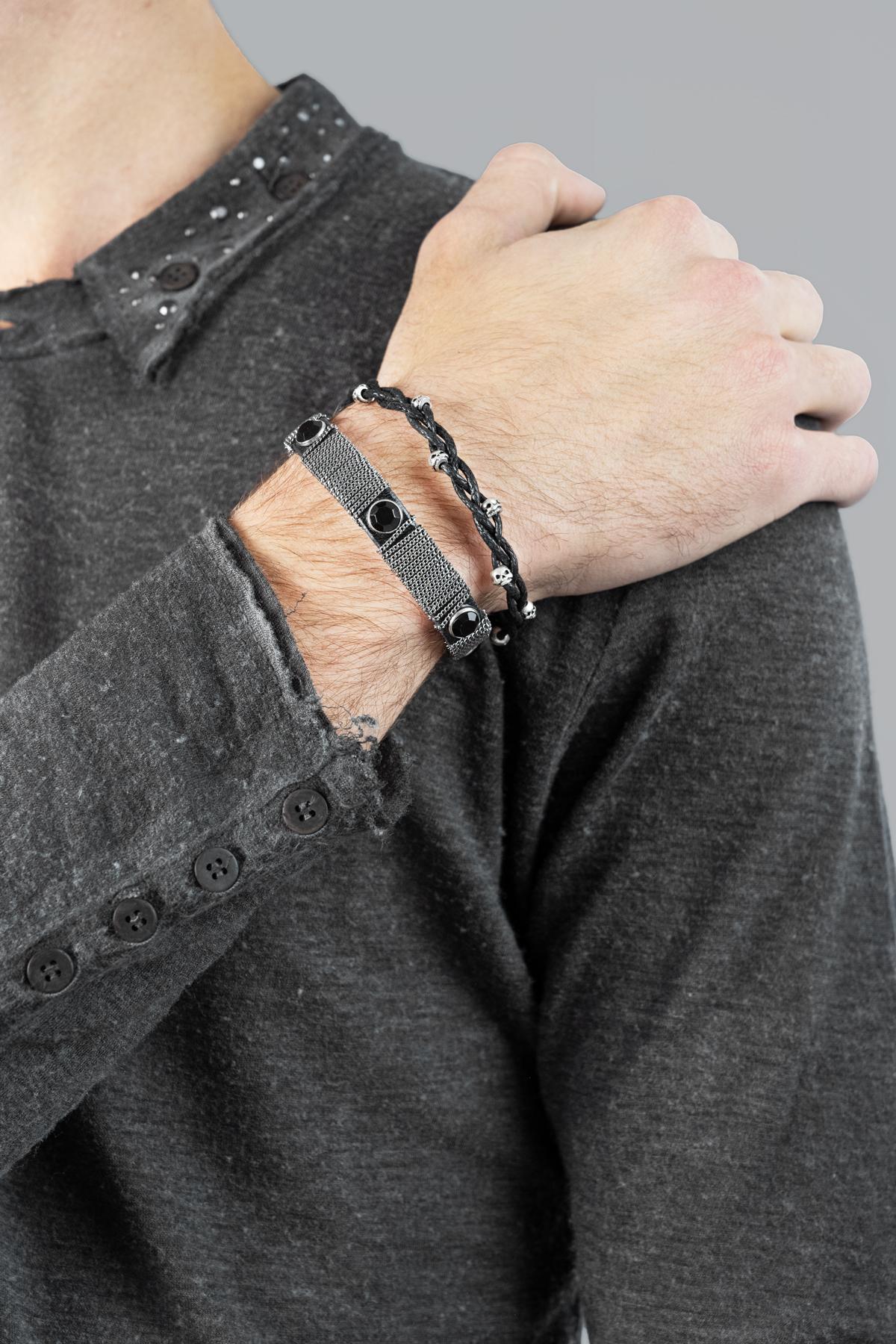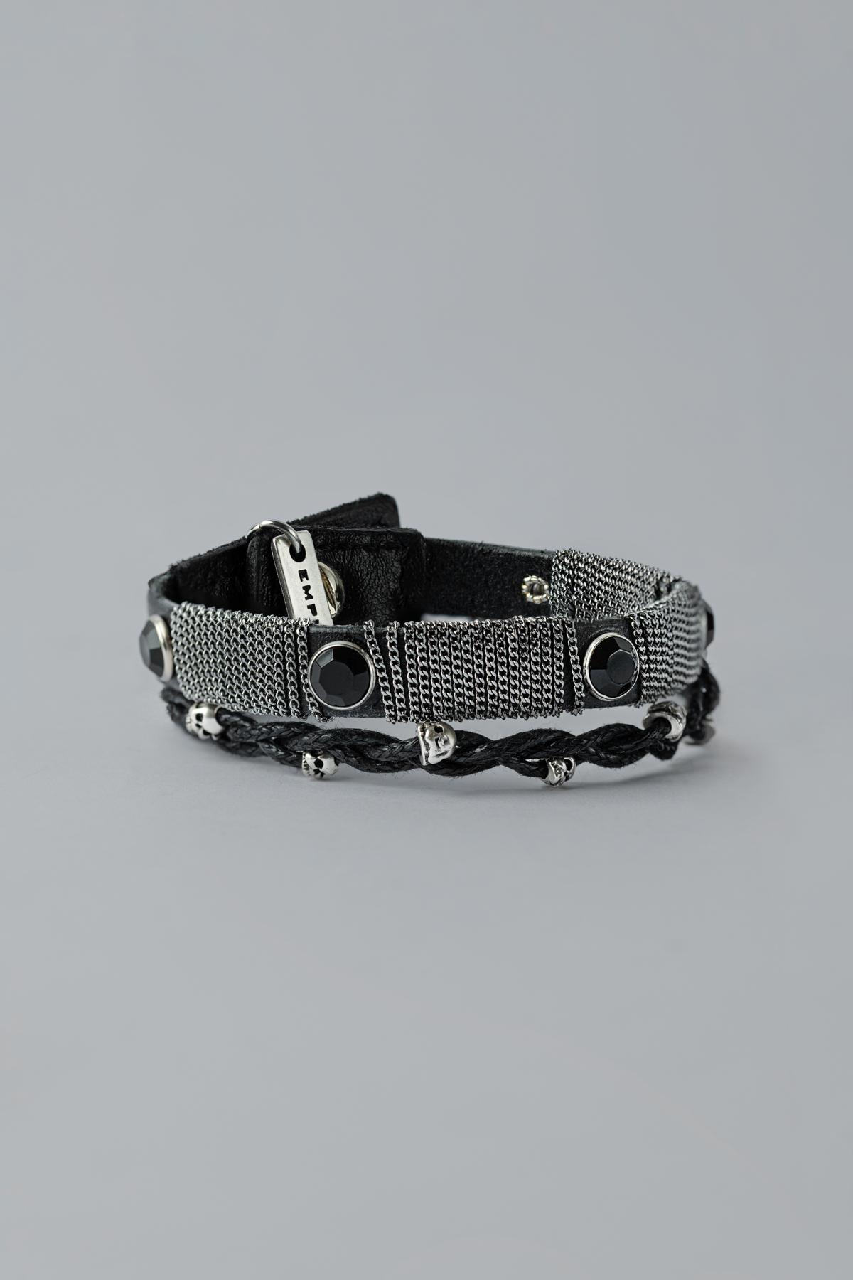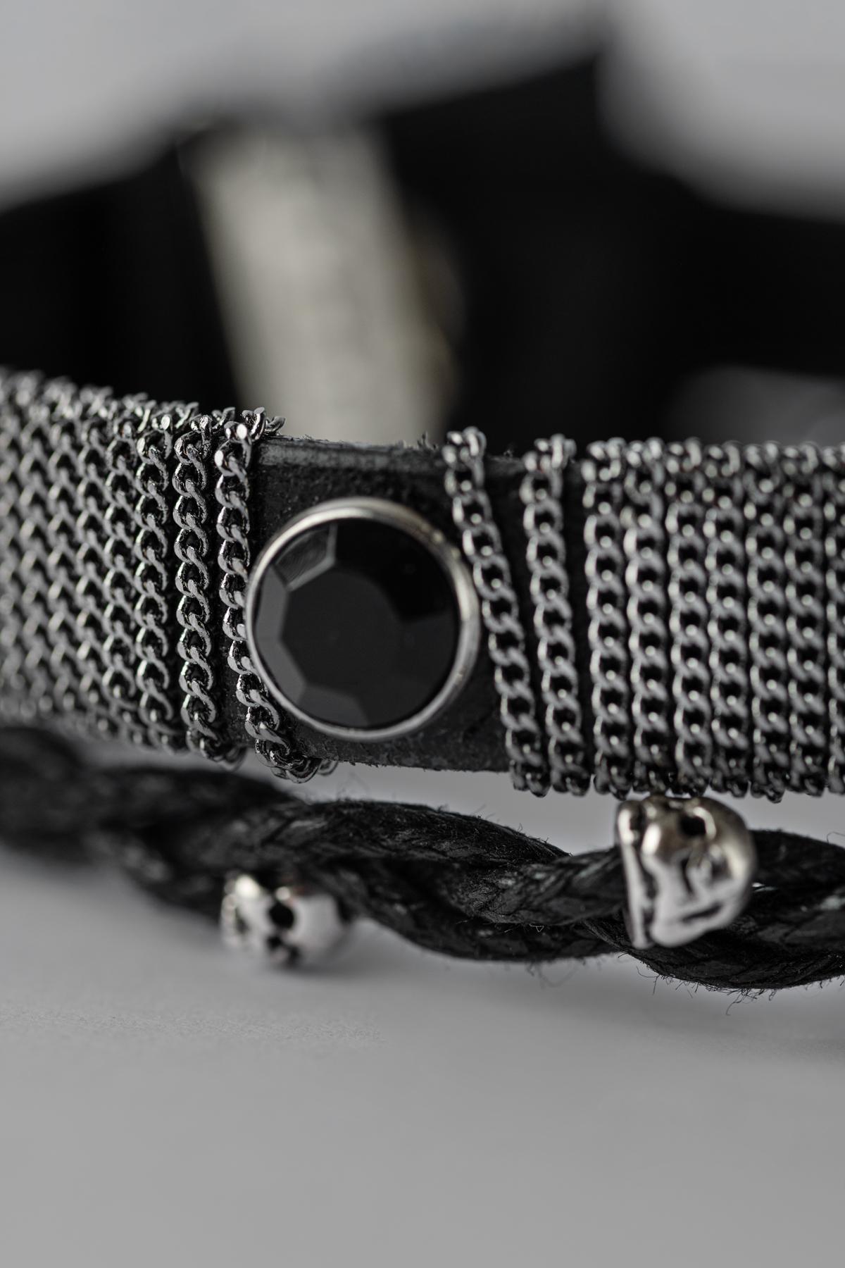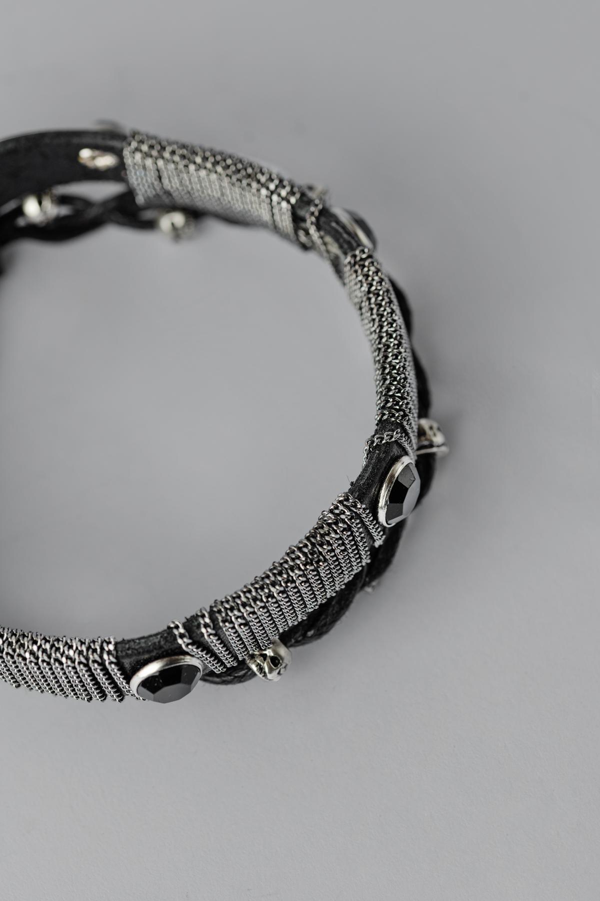 Double leather bracelet with application of metal threads, onyx stone and skulls. Adjustable closure with through hole.