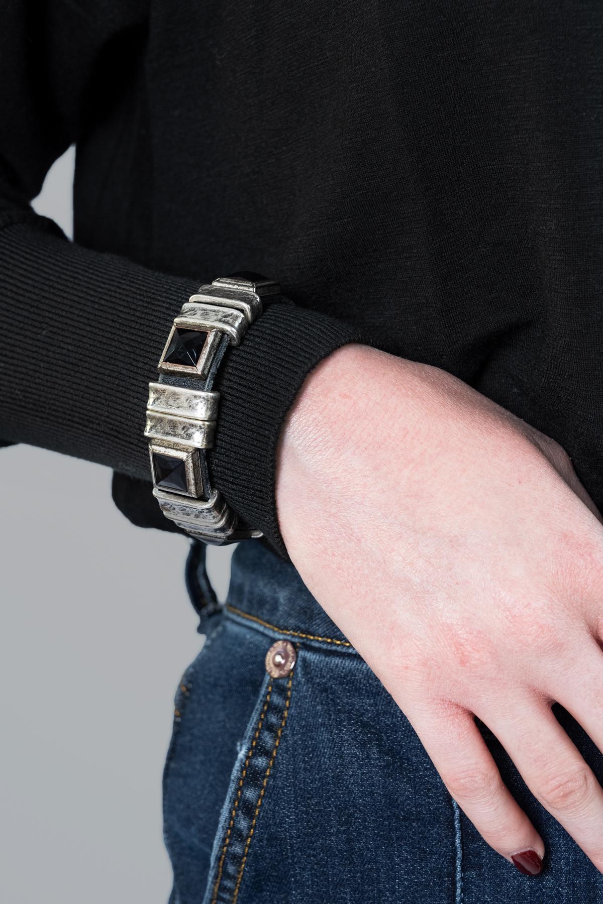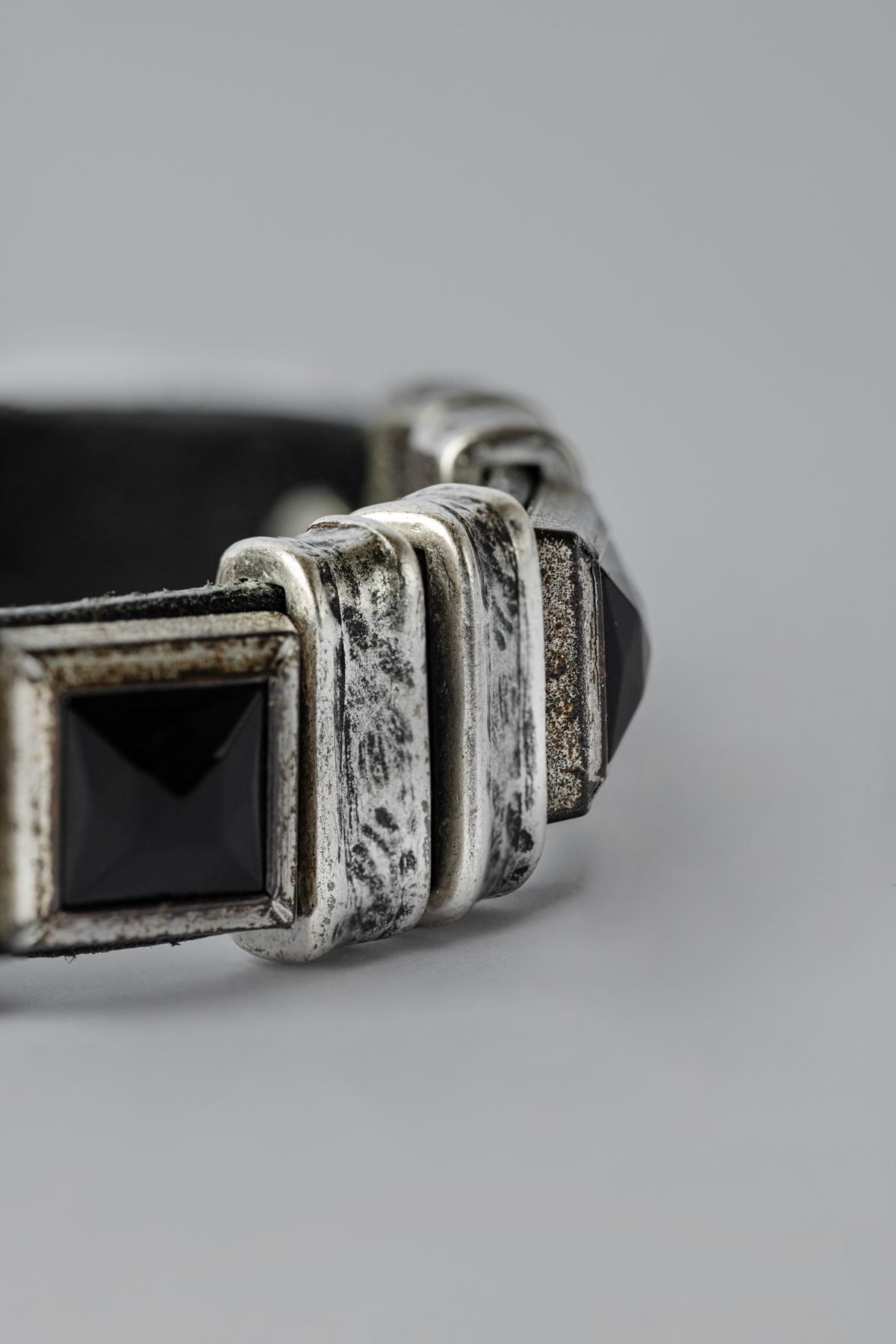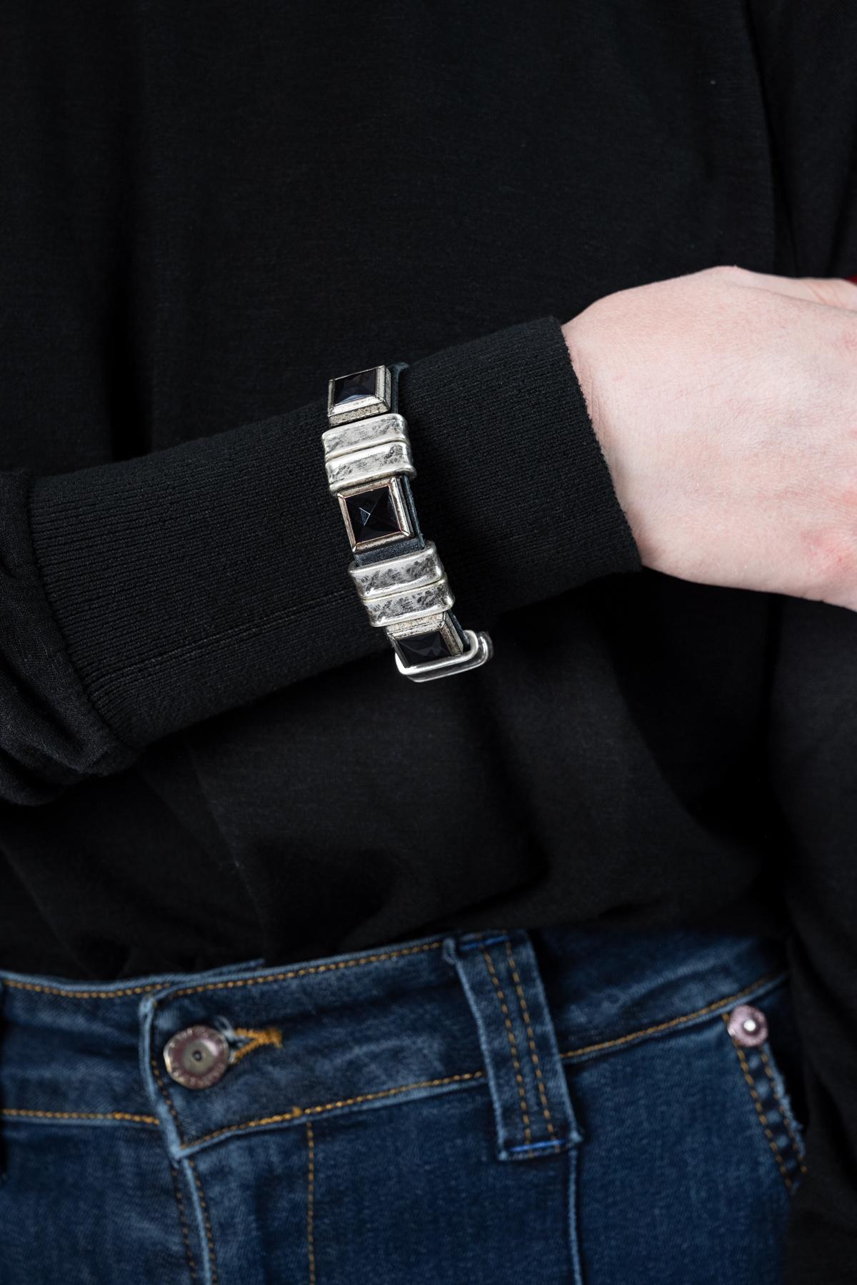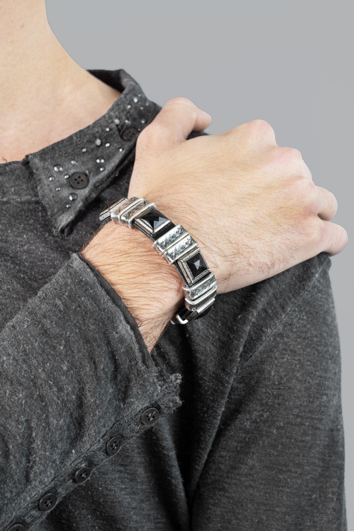 Leather bracelet with applications of geometric shapes and onyx stone.