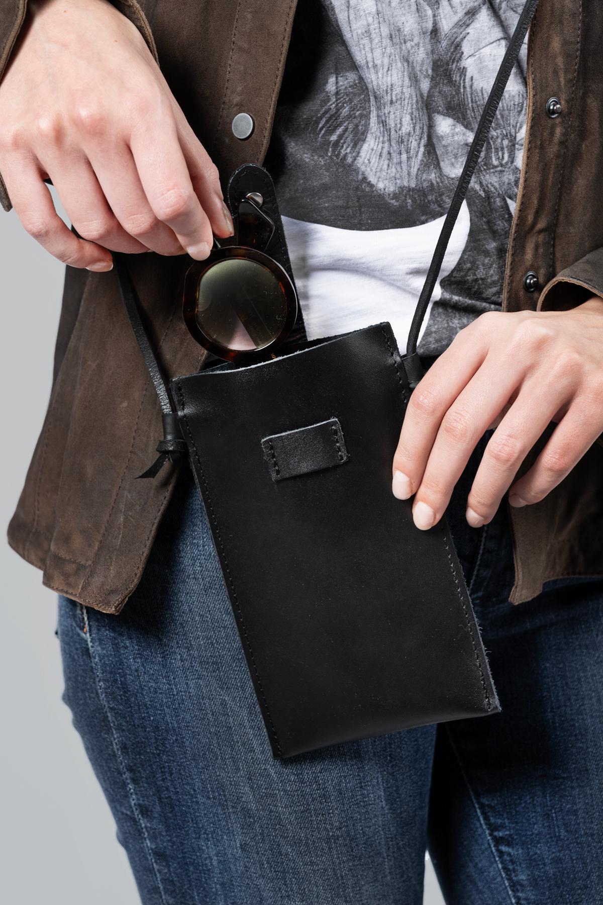 Genuine leather spectacle case with a practical shoulder strap. Secure webbing and buttonhole closure, embellished with a refined metal detail. A unique accessory that combines functionality and style to protect your glasses with a touch of class.