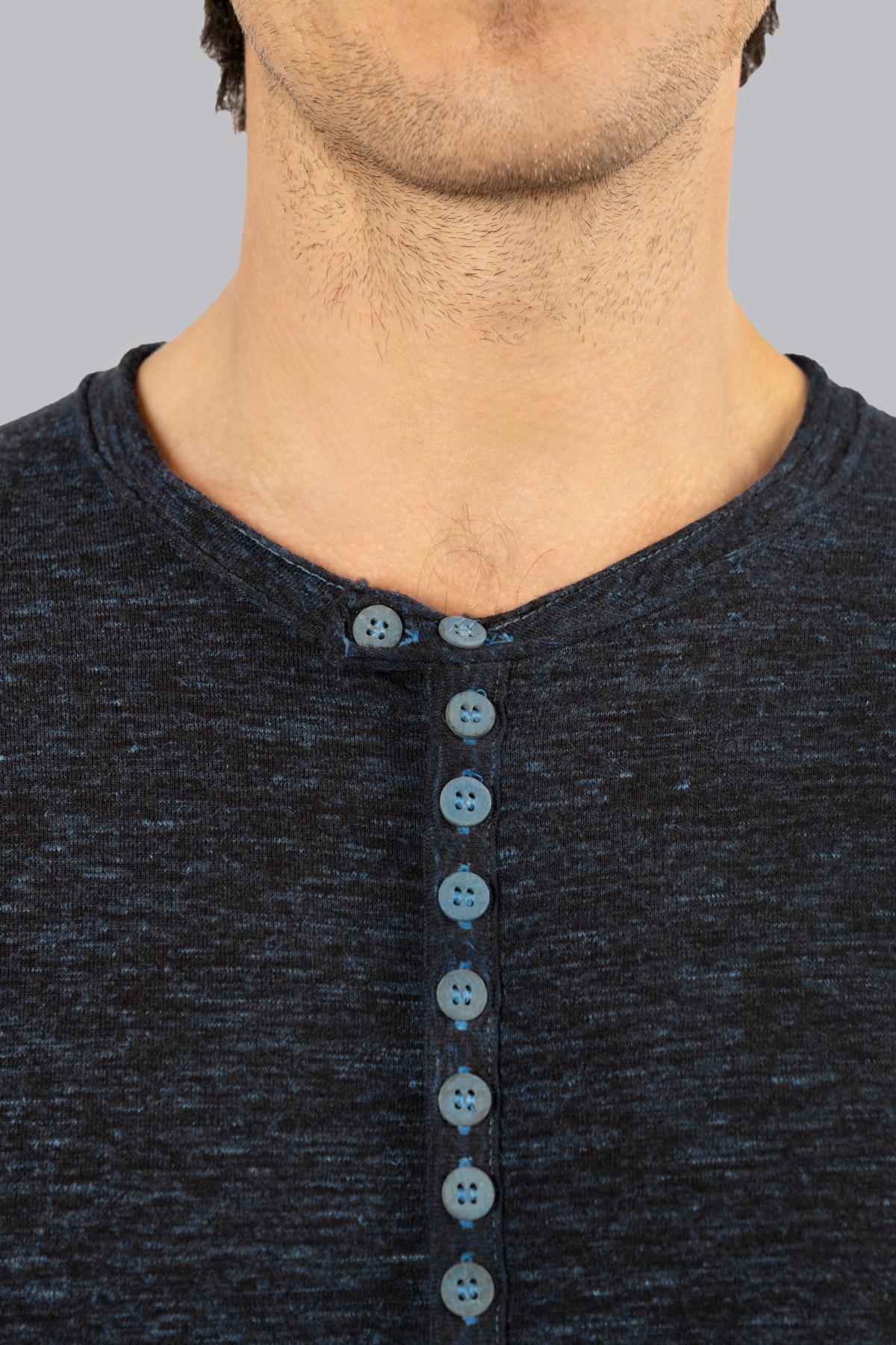 Long-sleeved sweater in 100% cotton, regular and comfortable fit, featuring a crew neckline embellished with coconut wood buttons. The style is completed by a raw-cut hem, eight buttons on the sleeves, and the iconic poetry print on the inside.