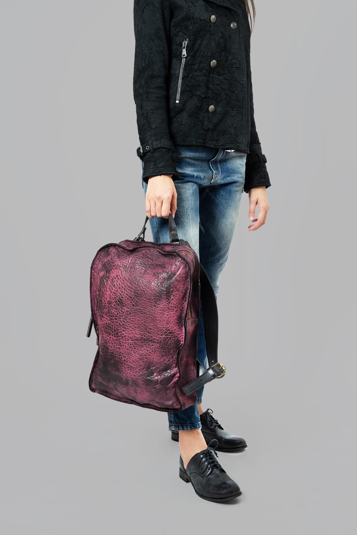 Leather backpack with zipper and buckle straps.