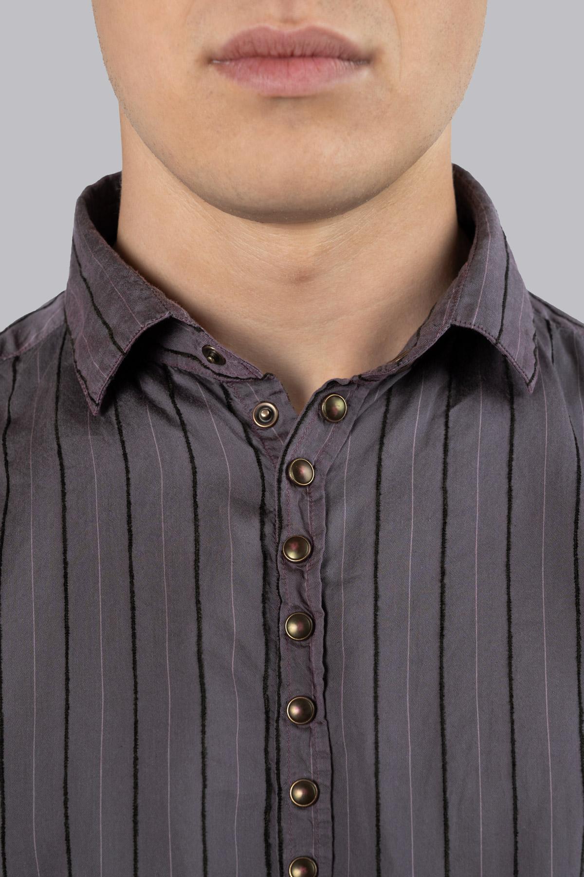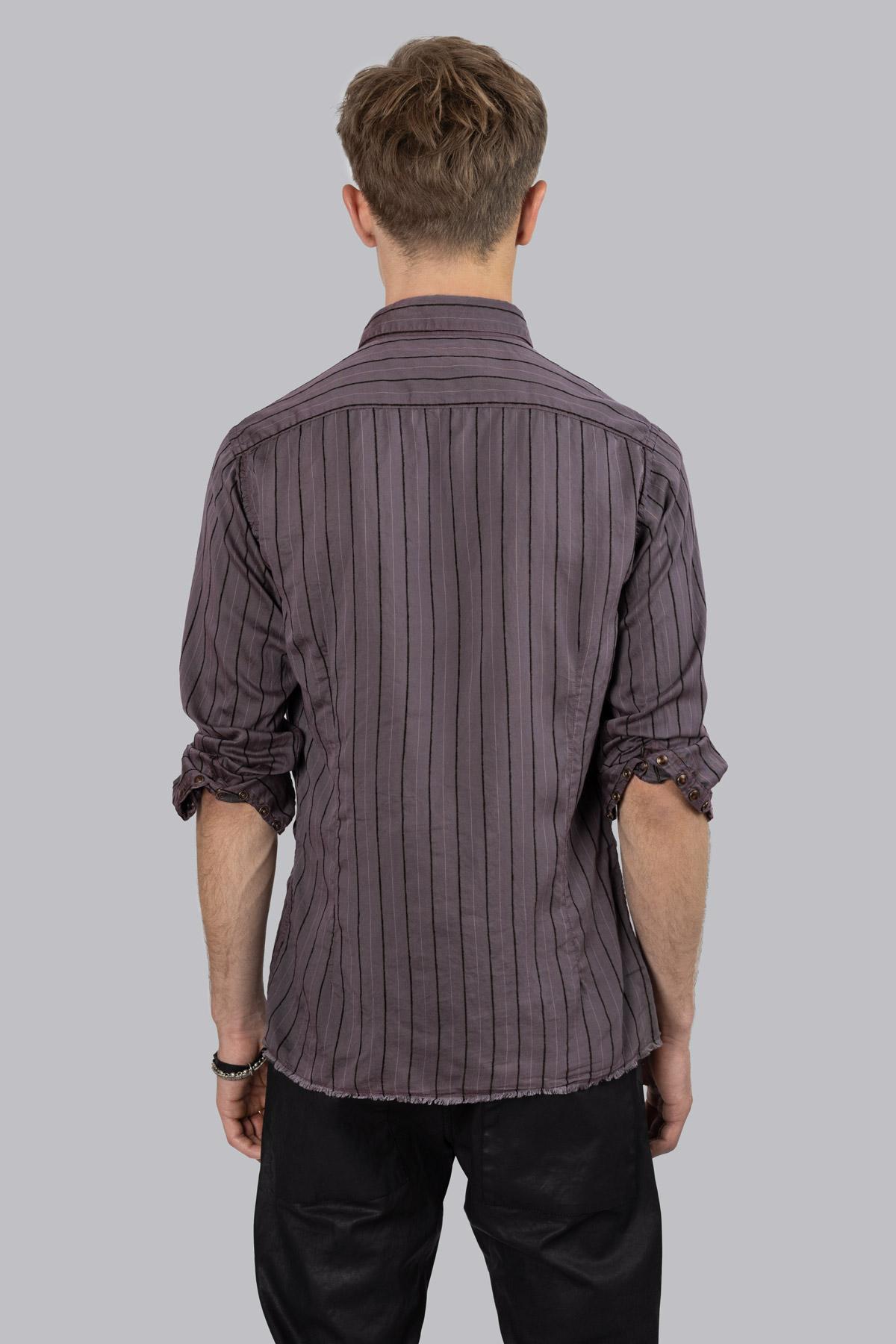 Long-sleeved shirt with striped pattern. Central snap fastener. Button detail along the sleeves.