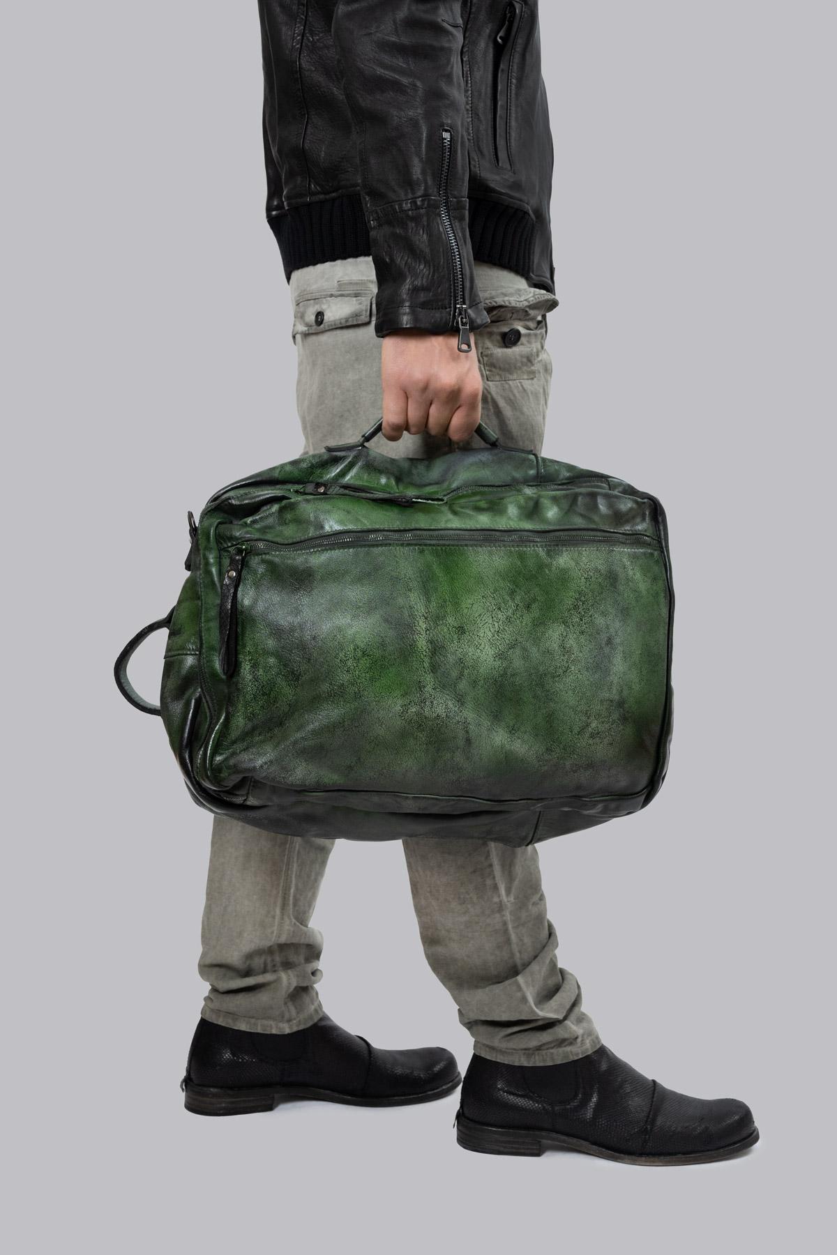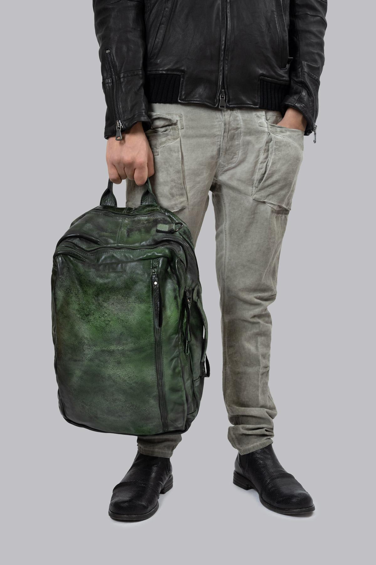 Backpack in hand-padded leather, with zip fastener. By inserting the backpack straps into the back pocket, the bag can also be worn over the shoulder or by hand.