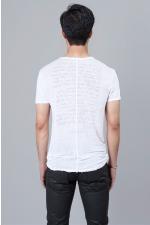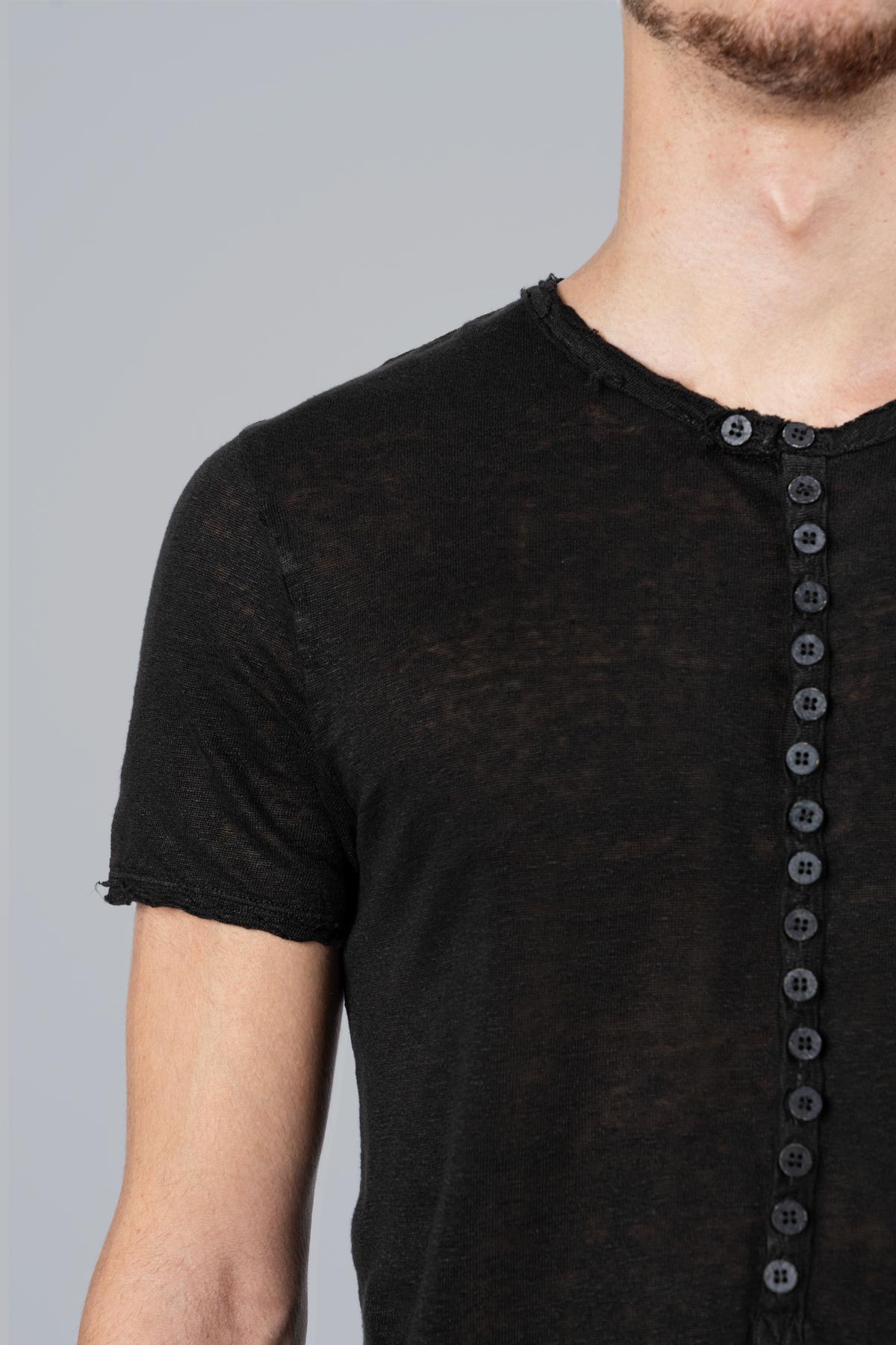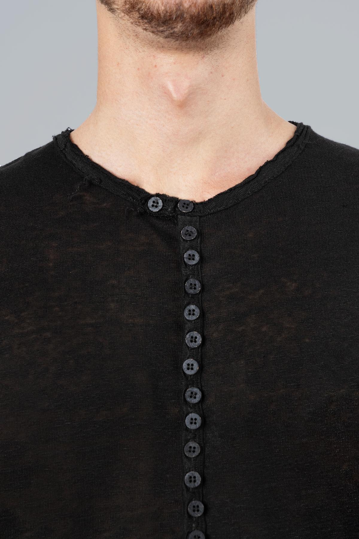 Chester T-shirt with short sleeves. Buttons at center. Inside poem print. Raw cut hem.