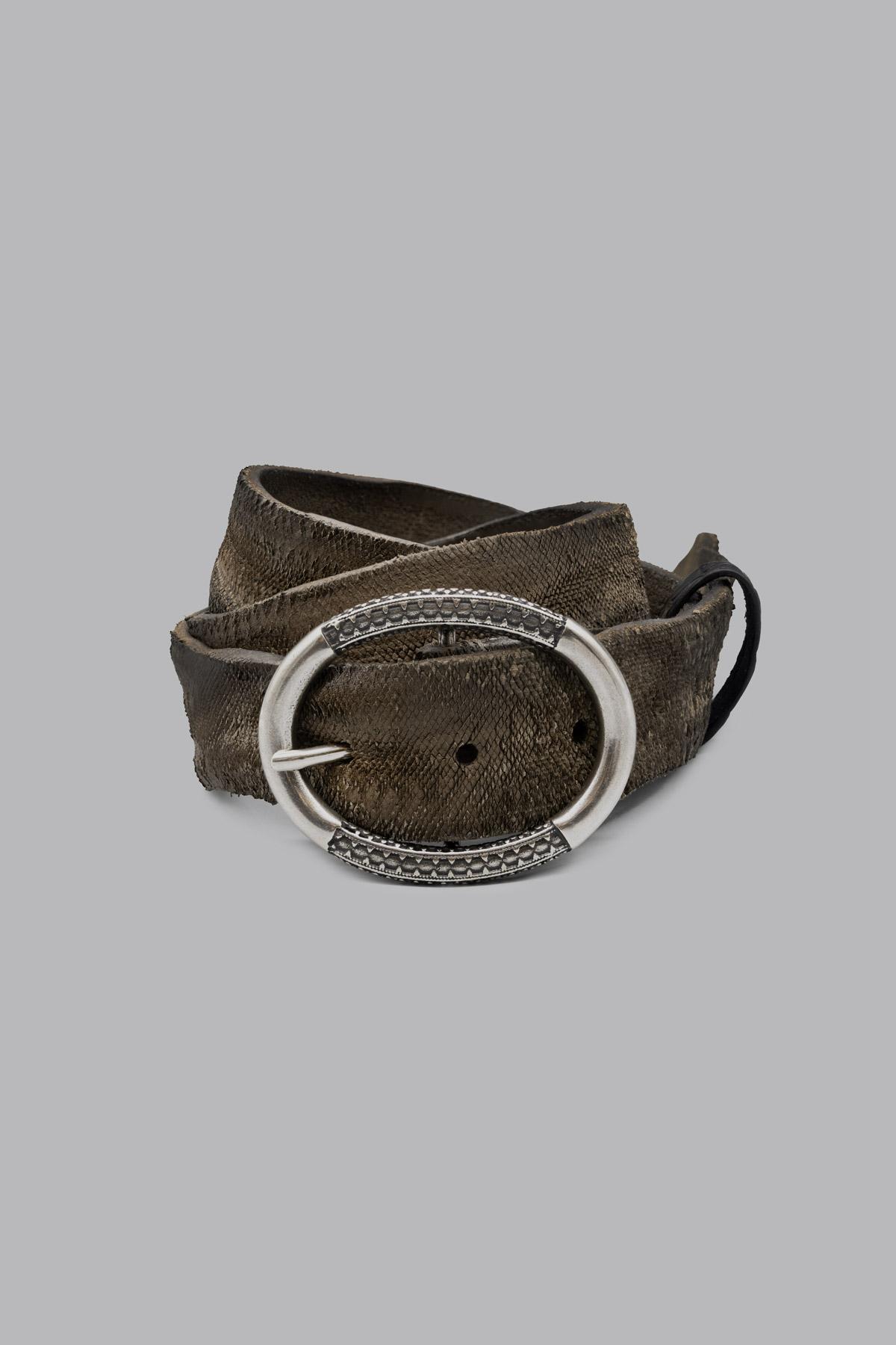 Belt in completely vegetable-tanned calfskin, made from a single piece of leather 3.5/4 mm thick. Cut, engraved, dyed, laminated, washed, and brushed individually by hand, this process makes the belt unique in the world. Oval buckle.