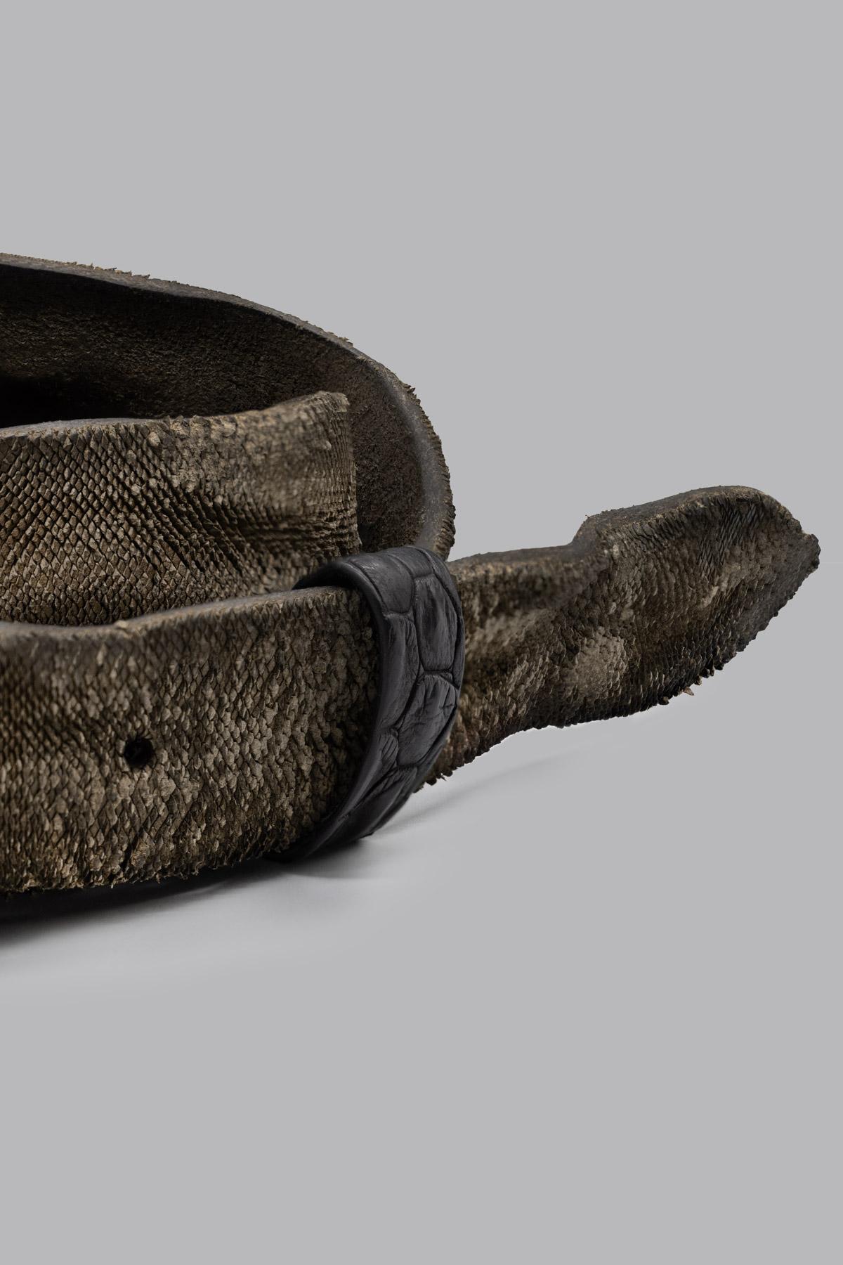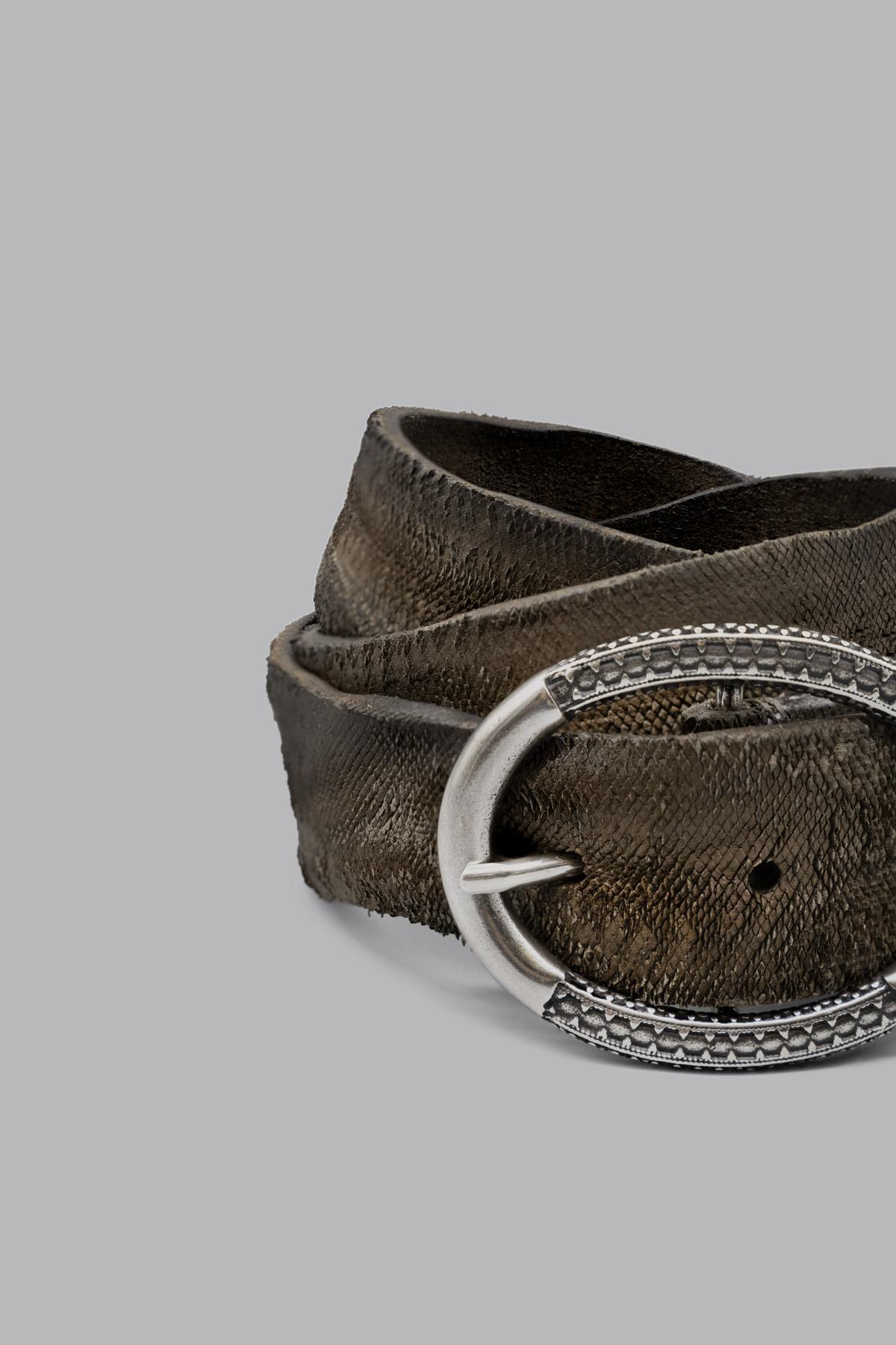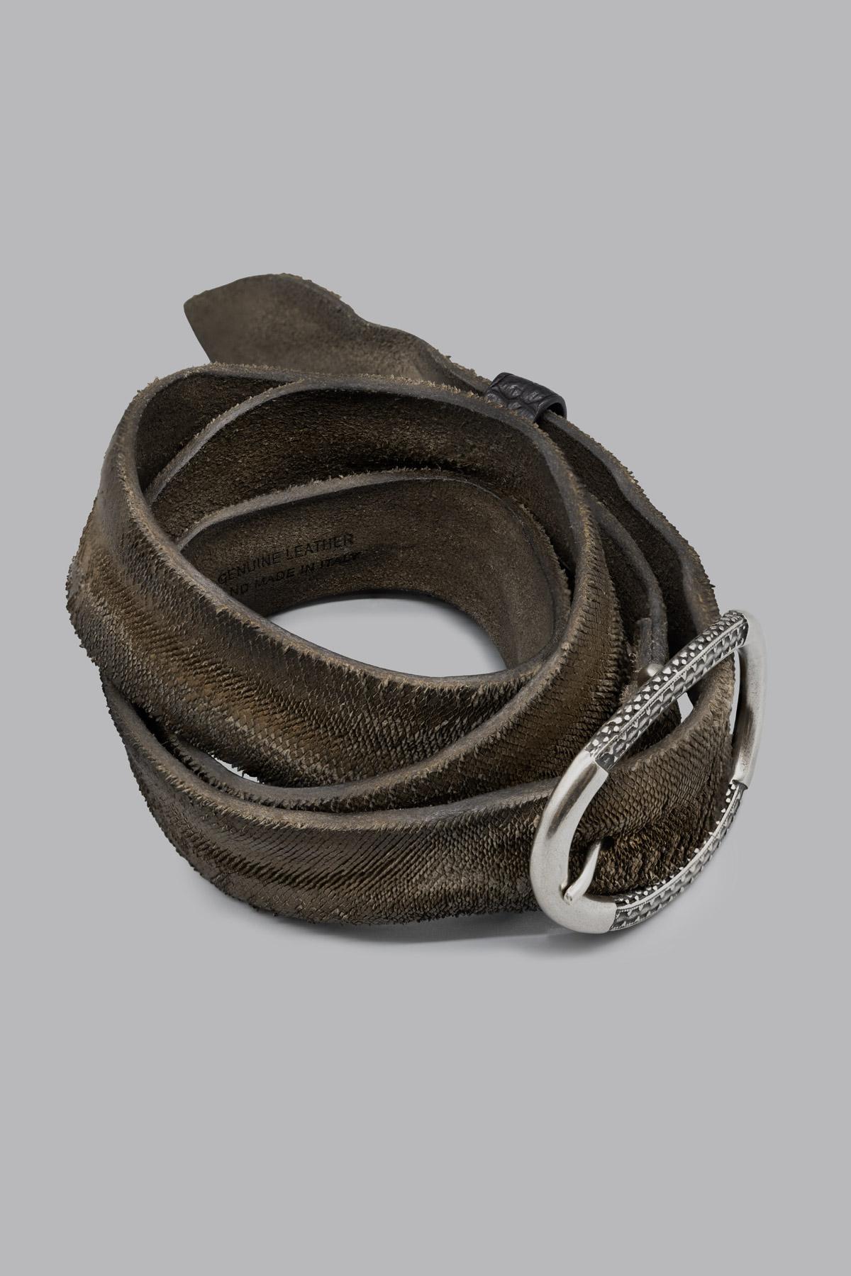 Belt in completely vegetable-tanned calfskin, made from a single piece of leather 3.5/4 mm thick. Cut, engraved, dyed, laminated, washed, and brushed individually by hand ...