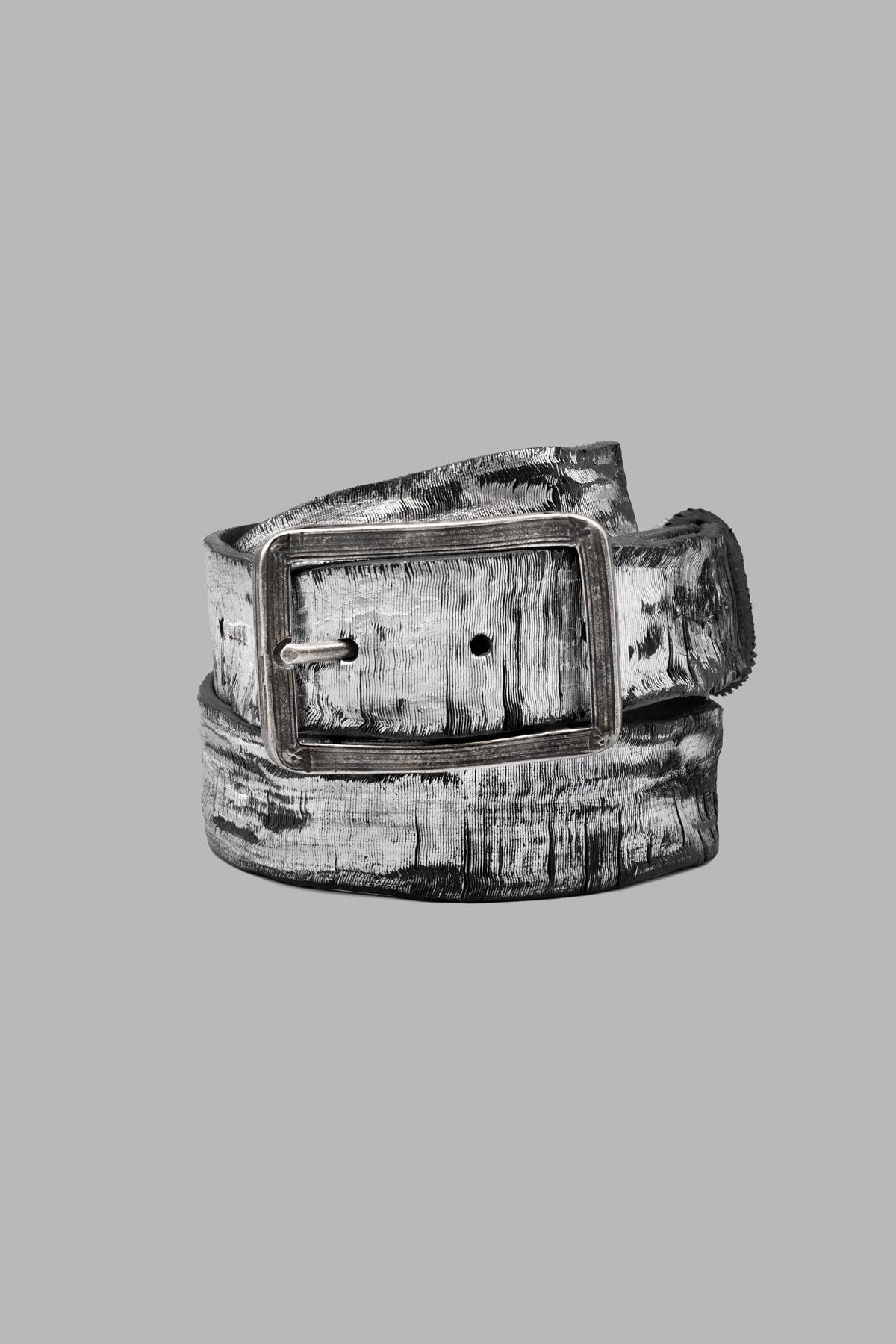 Belt in completely vegetable-tanned calfskin, made from a single piece of leather 3.5/4 mm thick. Cut, engraved, dyed, laminated, washed, and brushed individually by hand, this process makes the belt unique in the world. Square buckle.
