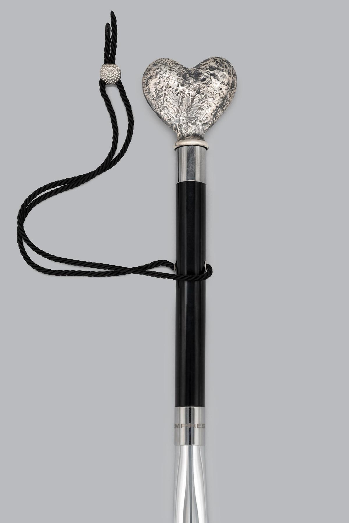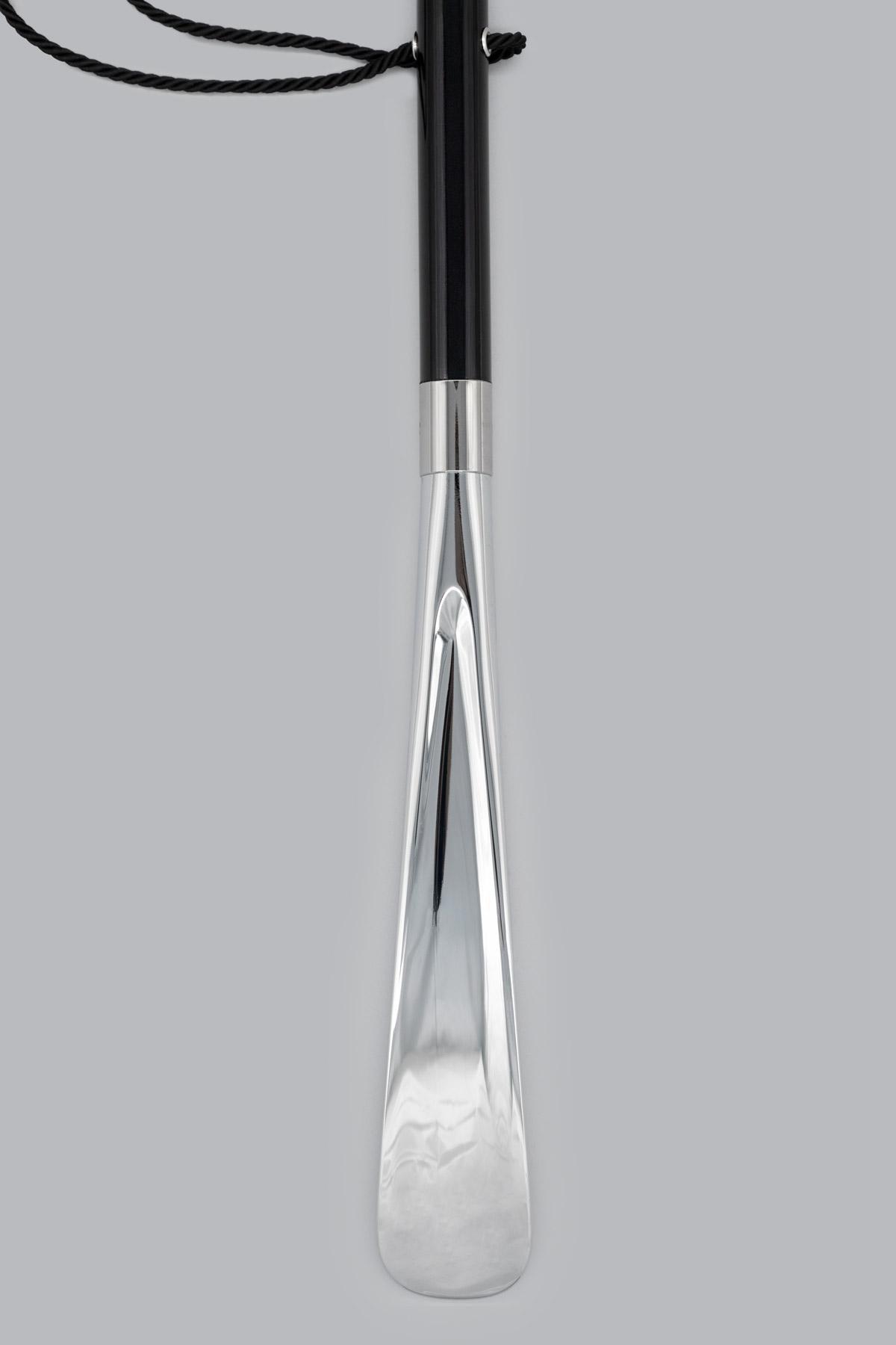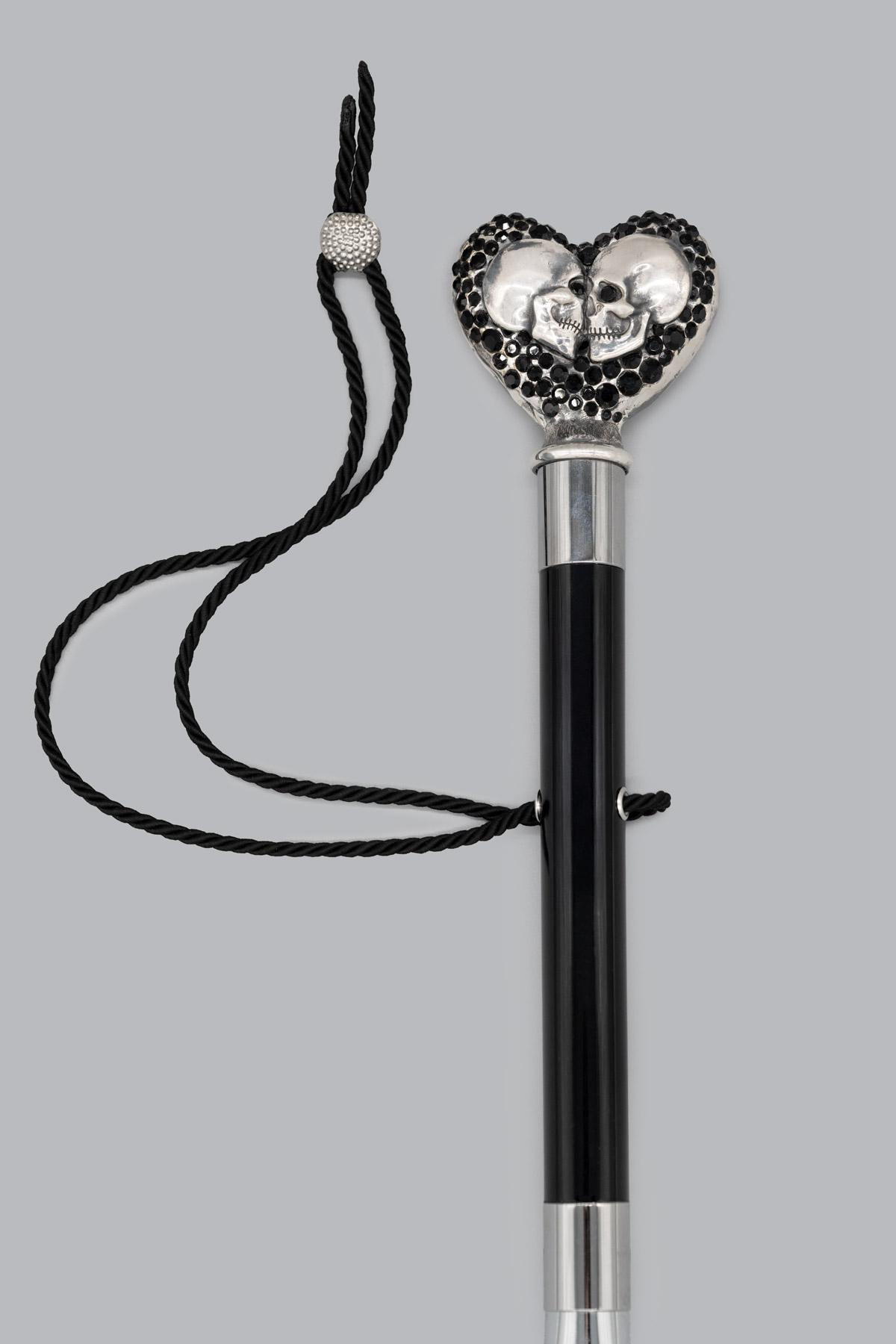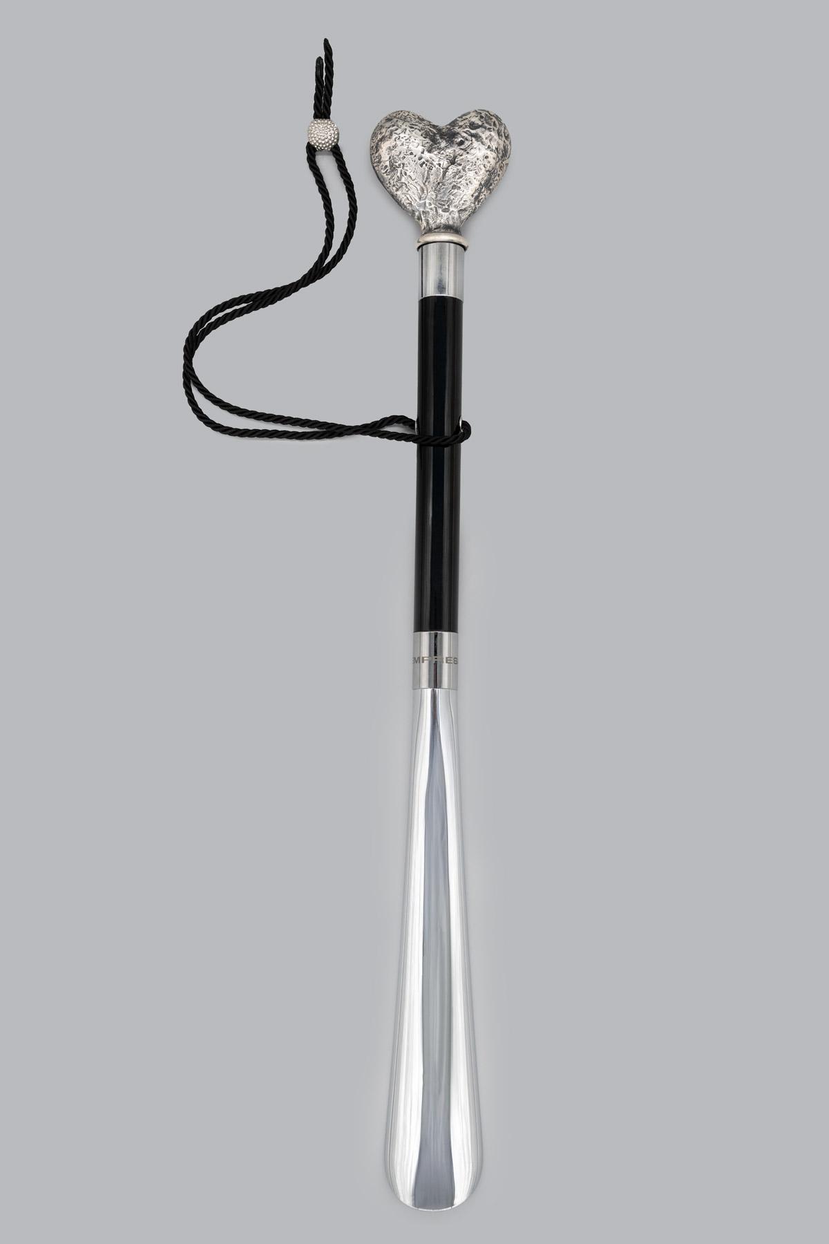 Shoehorn with heart-shaped handle and two engraved skulls. Rhinestone application and lanyard. Silver-coloured shovel.