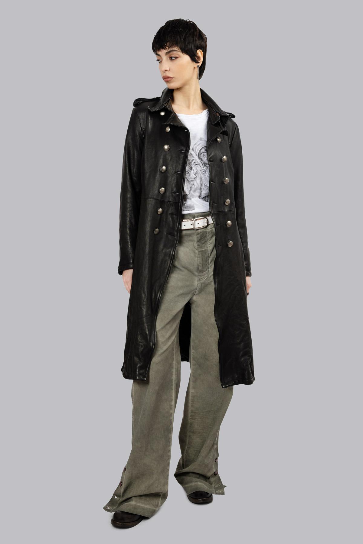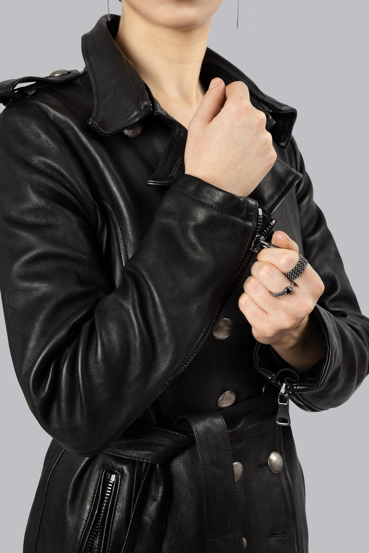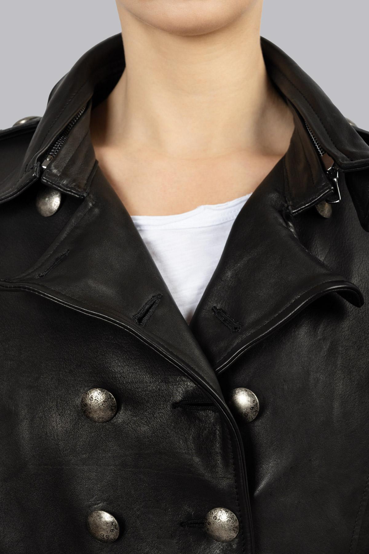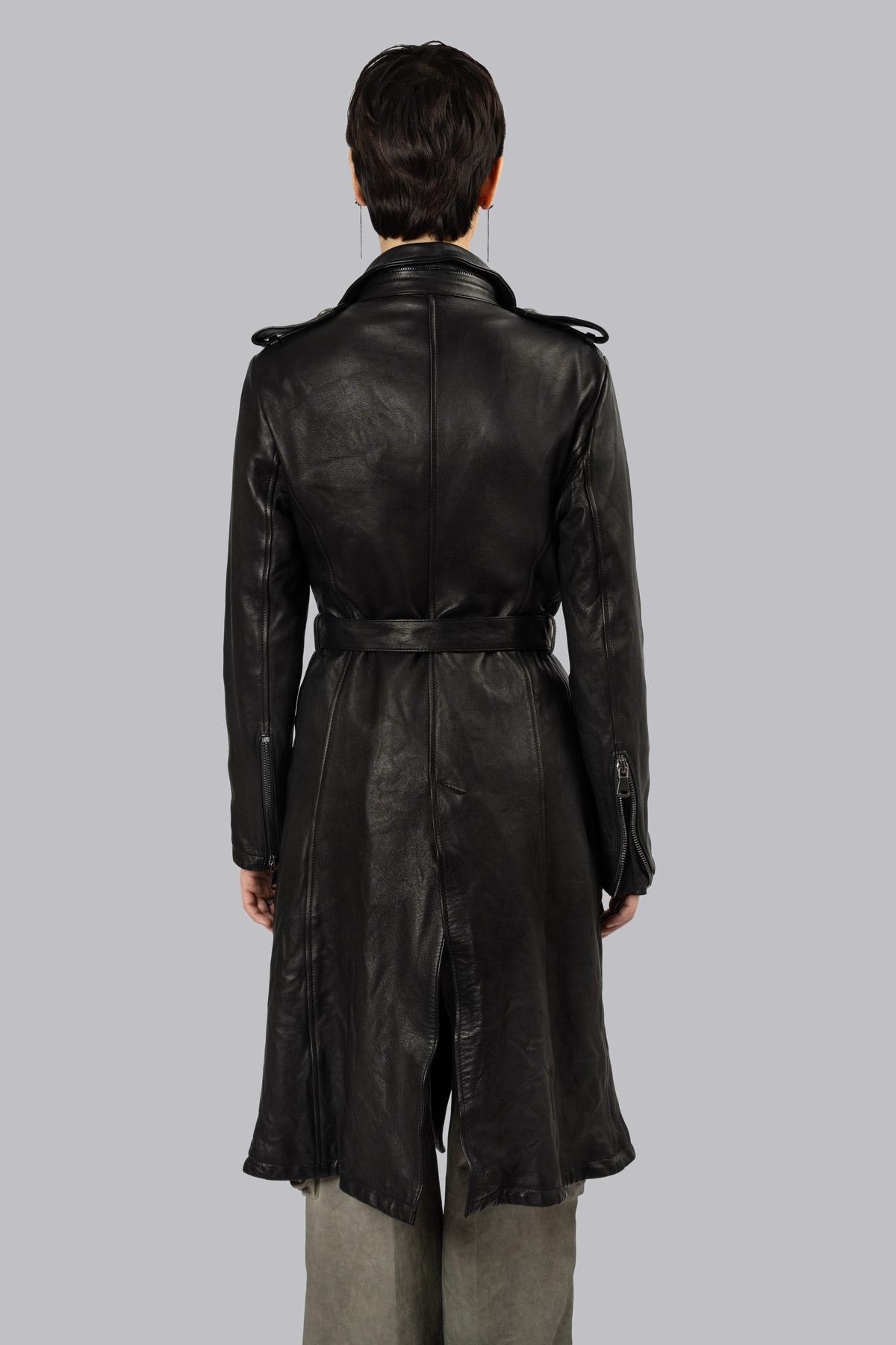 Double-breasted leather trench coat with hammered buttons for an aged effect and a buckle-free belt to complete the silhouette. The inner lining features the iconic rose ...