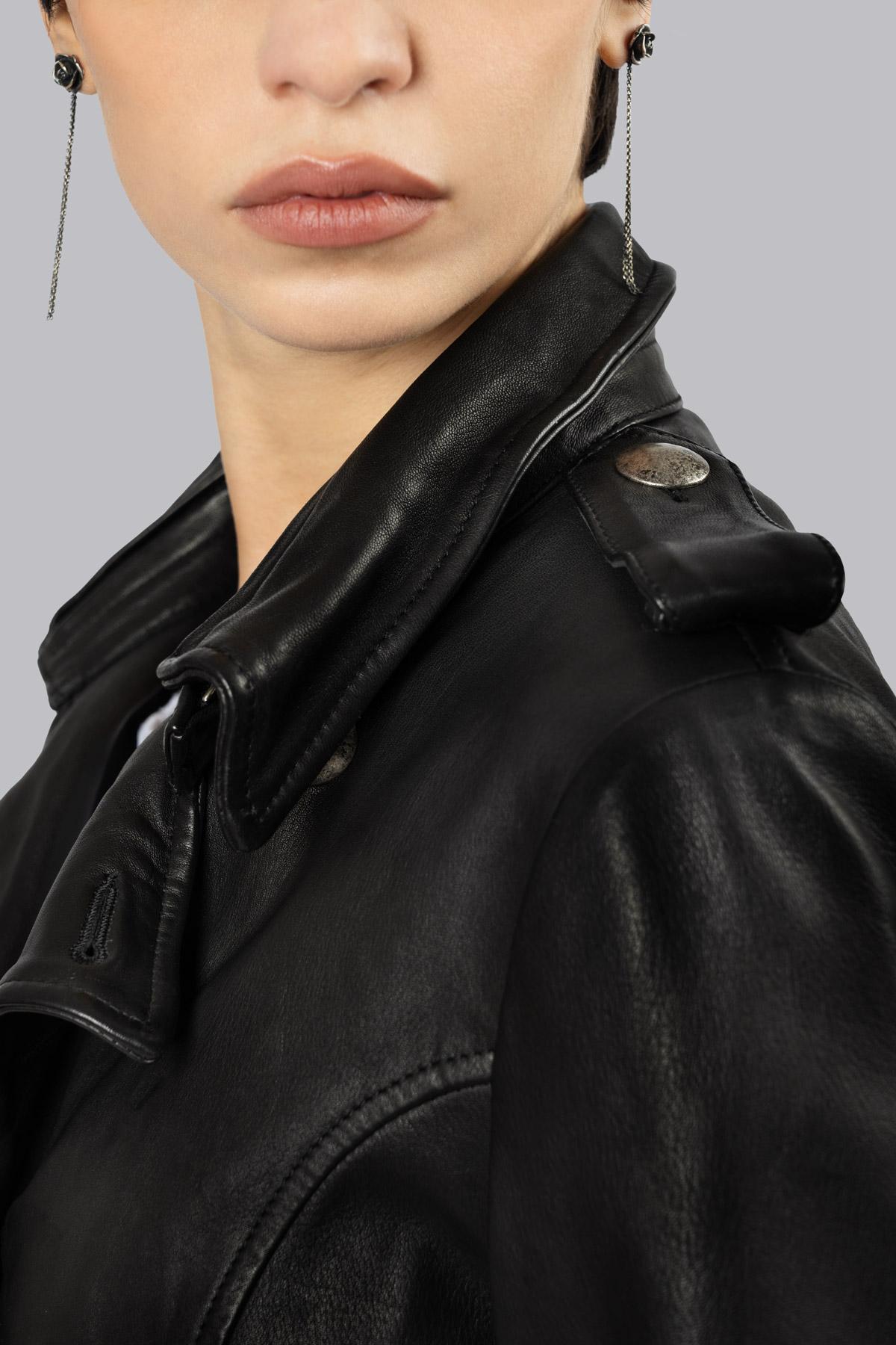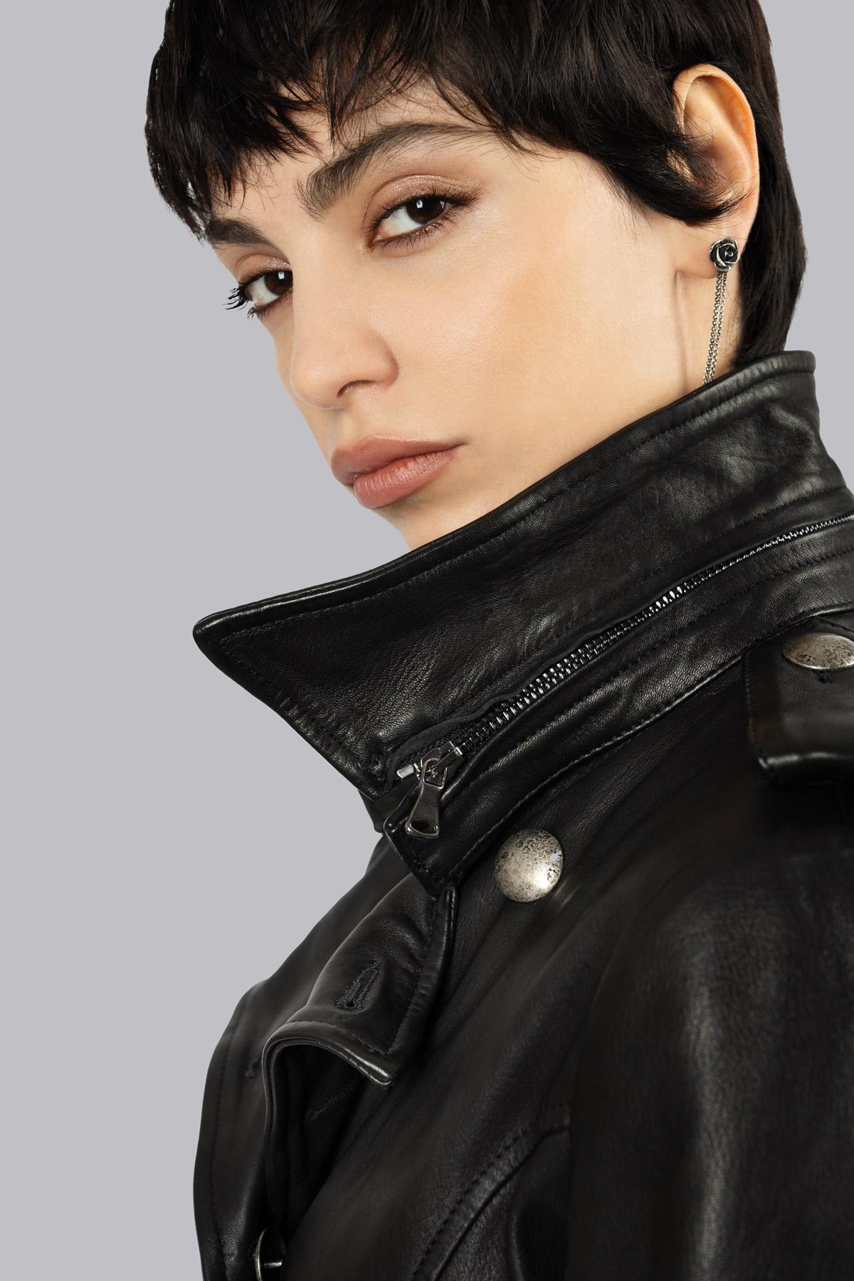 Double-breasted leather trench coat with hammered buttons for an aged effect and a buckle-free belt to complete the silhouette. The inner lining features the iconic rose print, while the pockets are welt pockets with zippers and zippers on the sleeves.