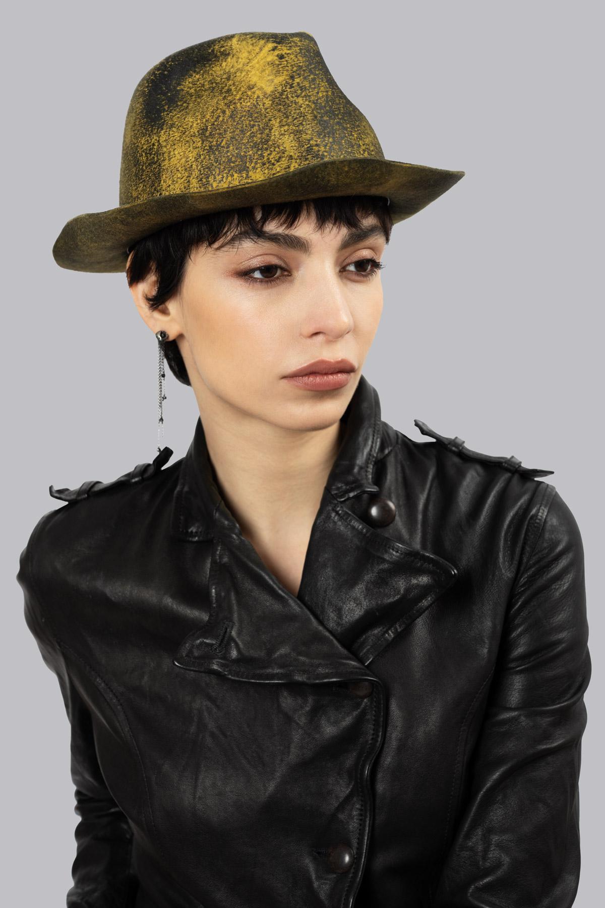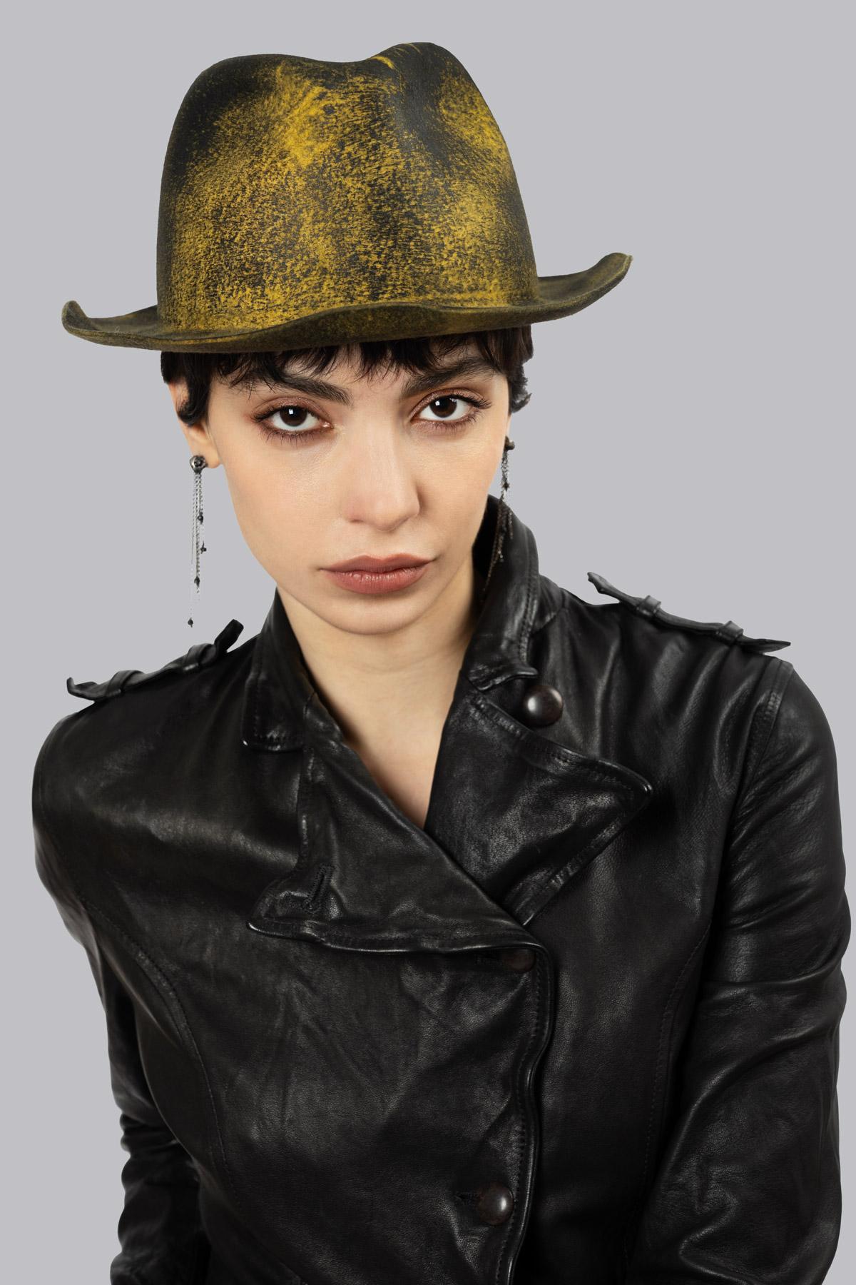 Wide-brimmed fedora hat in hand-buffed shaved wool.
