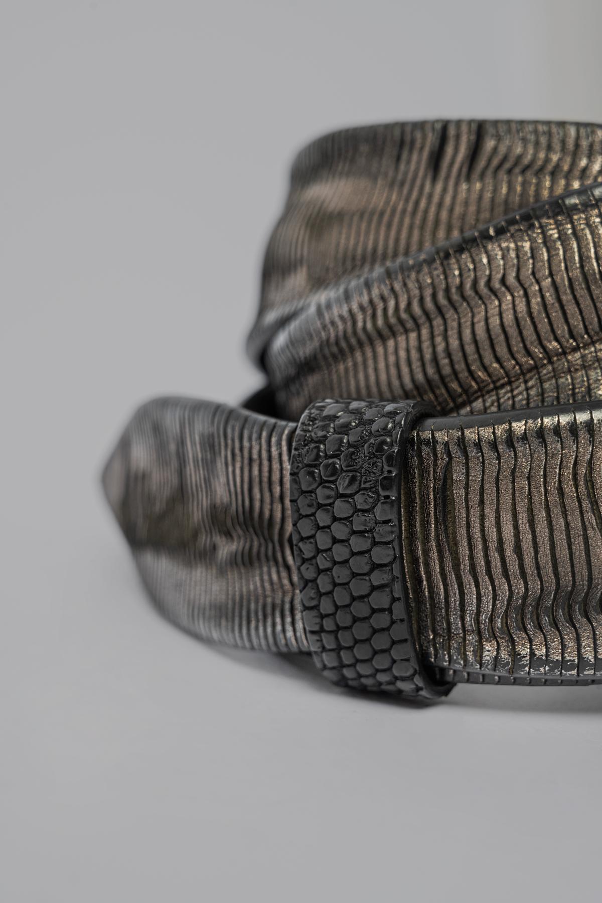 Completely vegetable-tanned calfskin belt, made from a single piece of leather 3.5/4 mm thick. Individually cut, engraved, dyed, laminated, washed and brushed by hand. All this makes the belt unique. Lizard loop. Resistant to a brave life. Oval buckle.