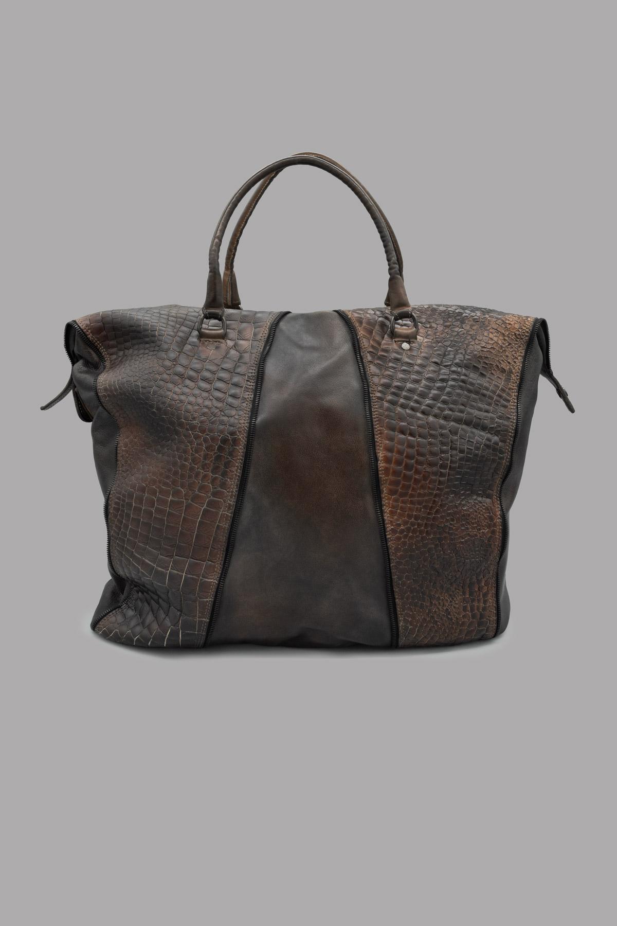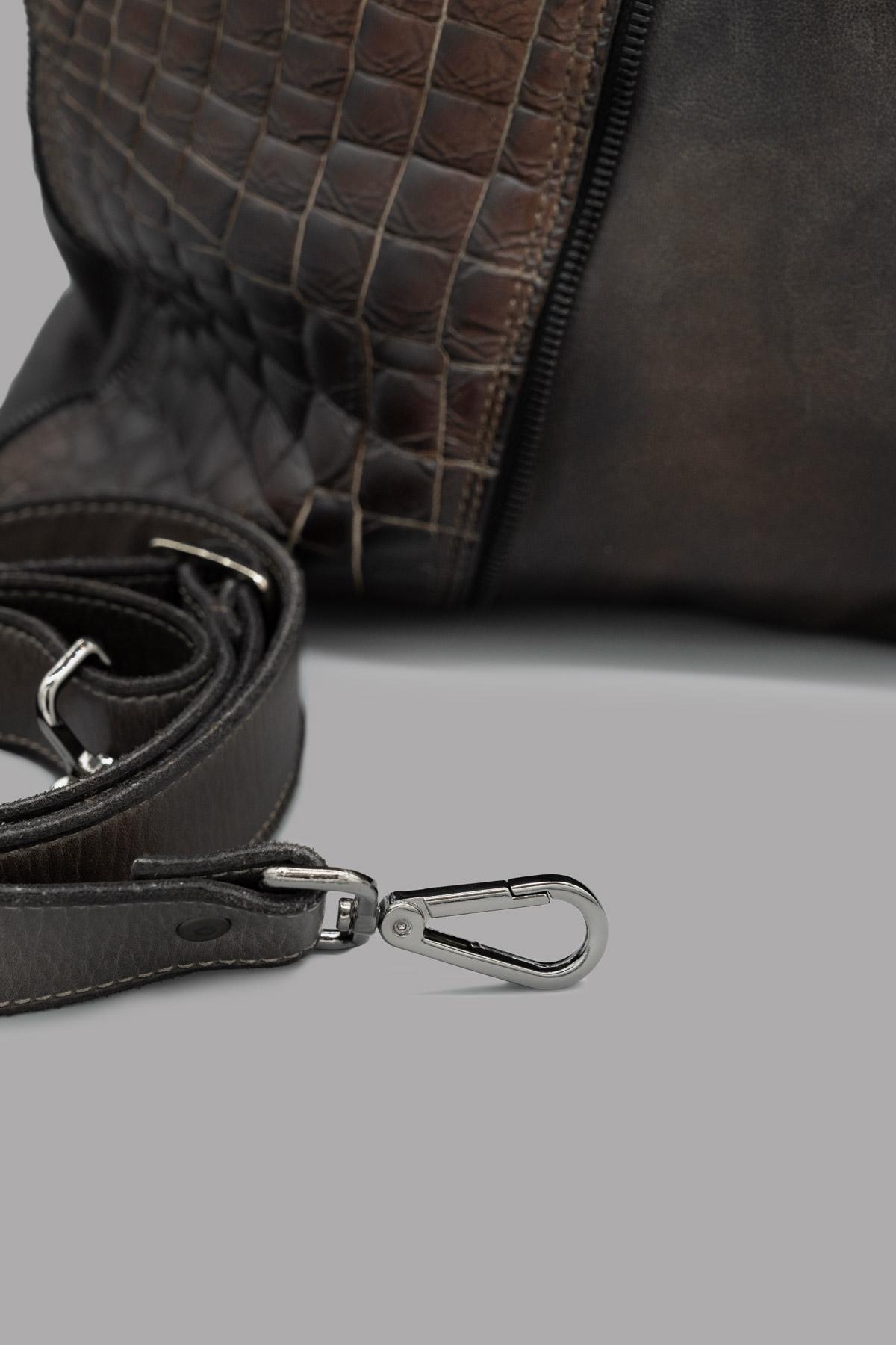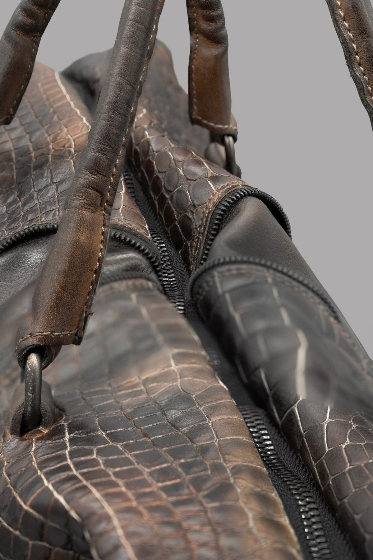 Leather bag with crocodile print inserts. Zipper detail. Zipper closure. Removable and adjustable shoulder strap.