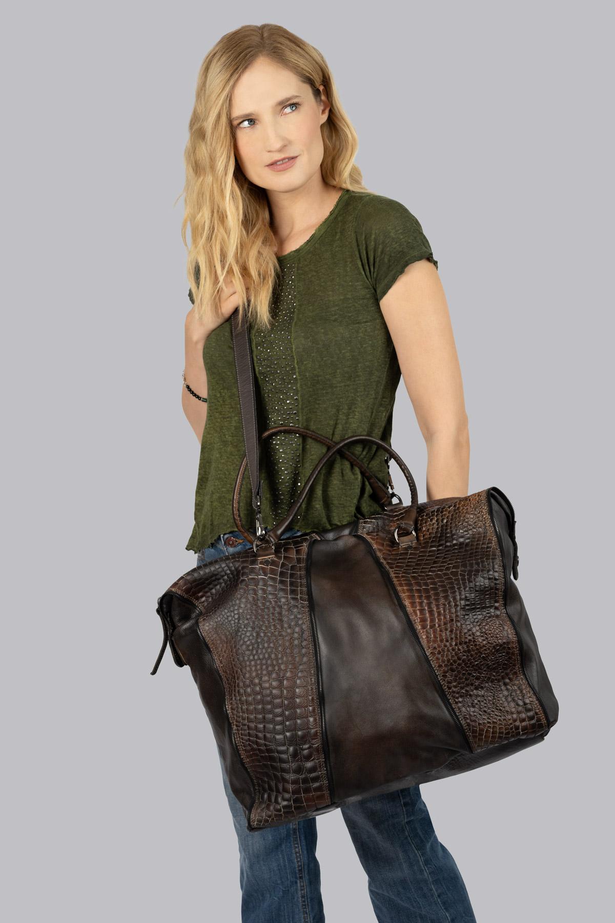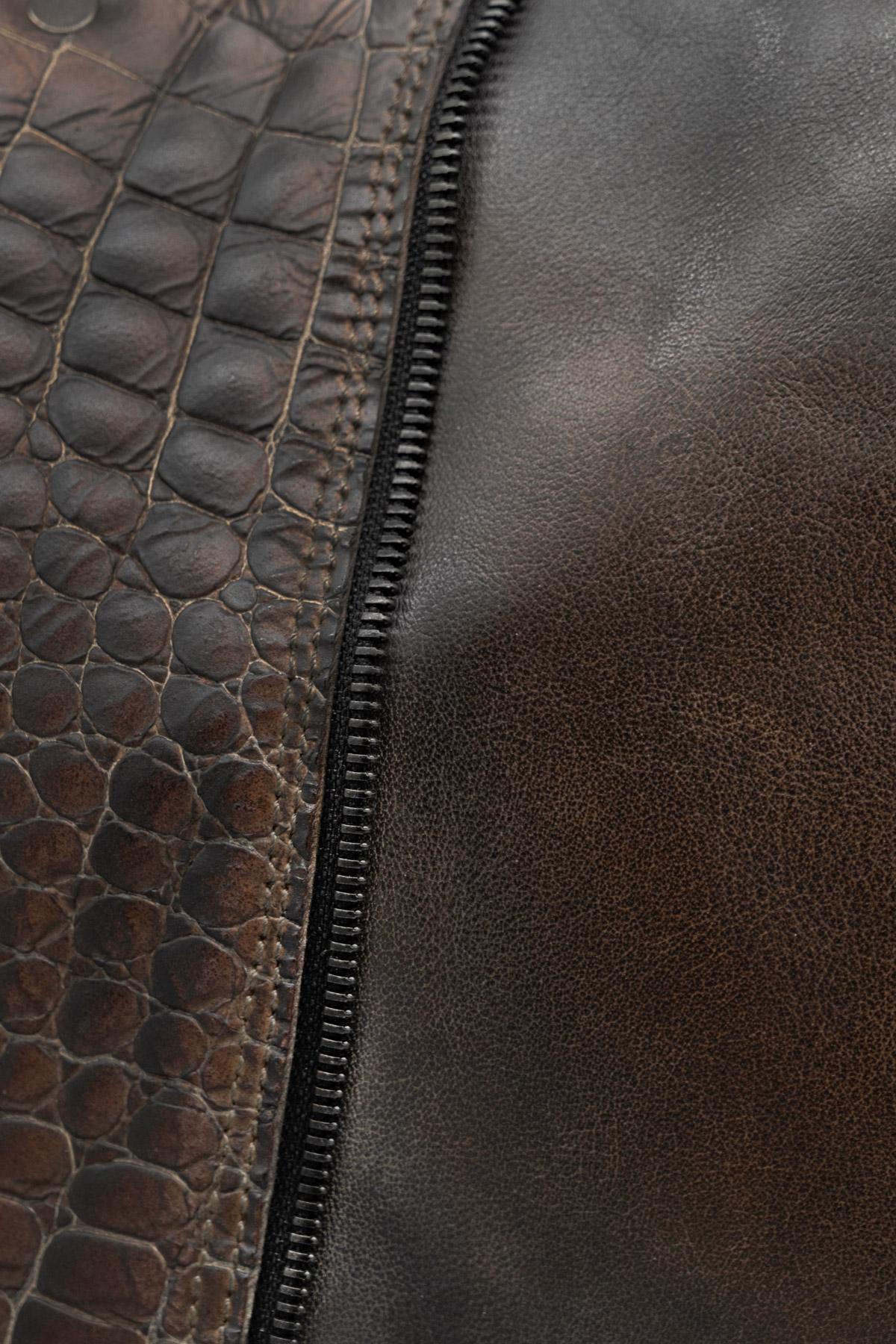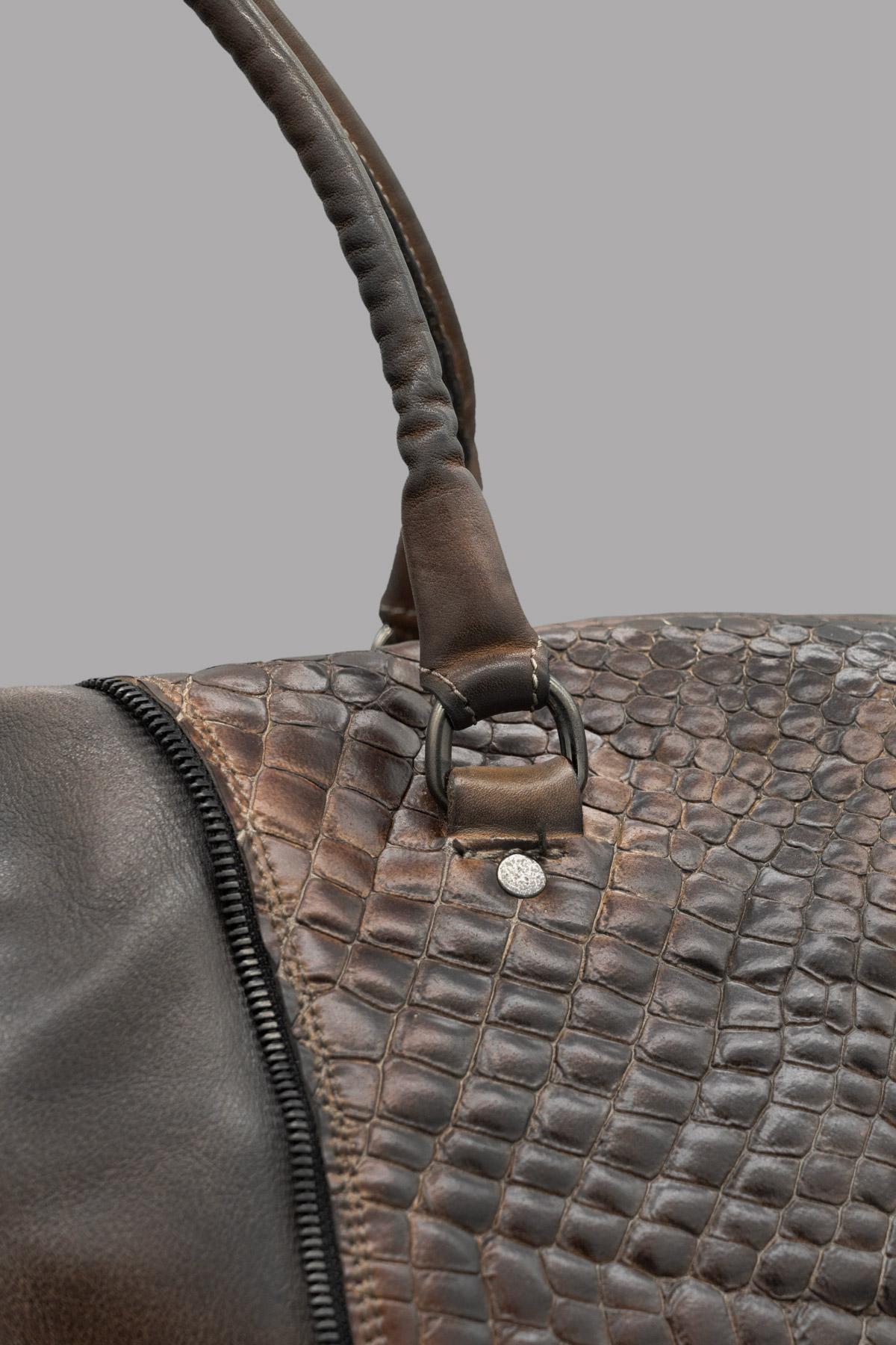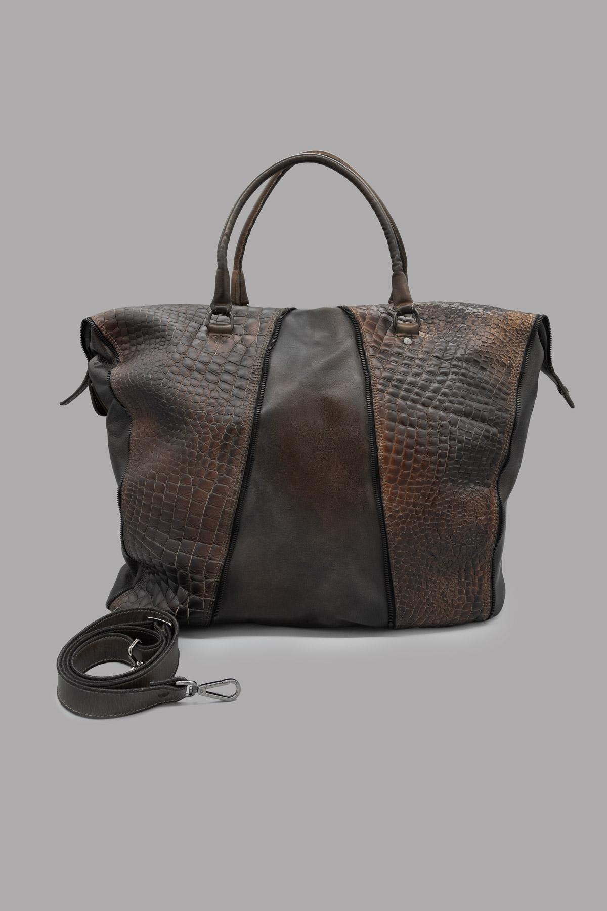 Leather bag with crocodile print inserts. Zipper detail. Zipper closure. Removable and adjustable shoulder strap.