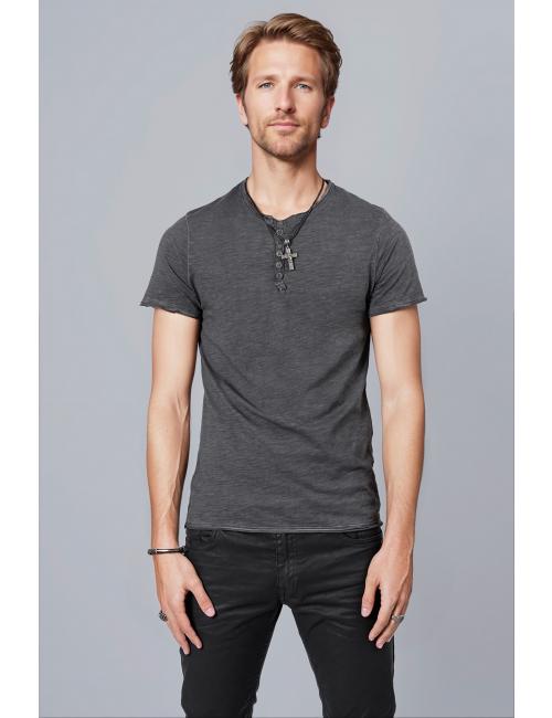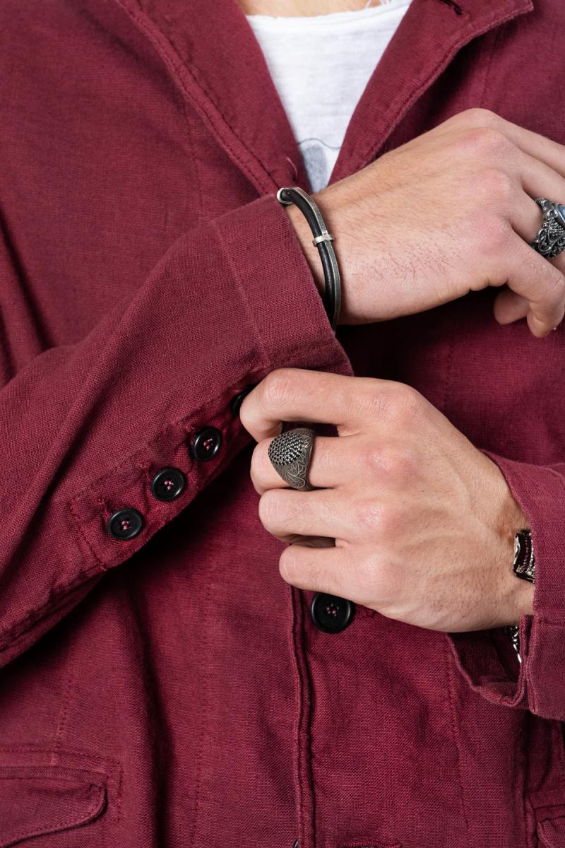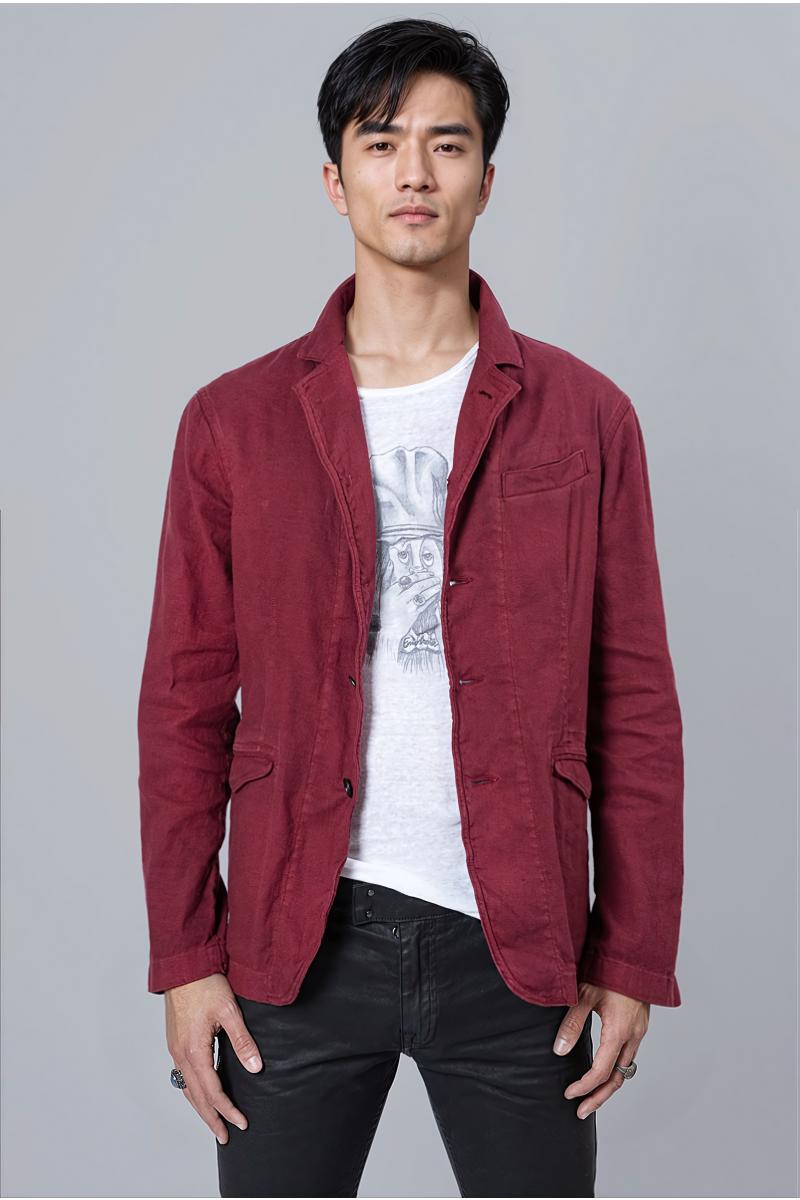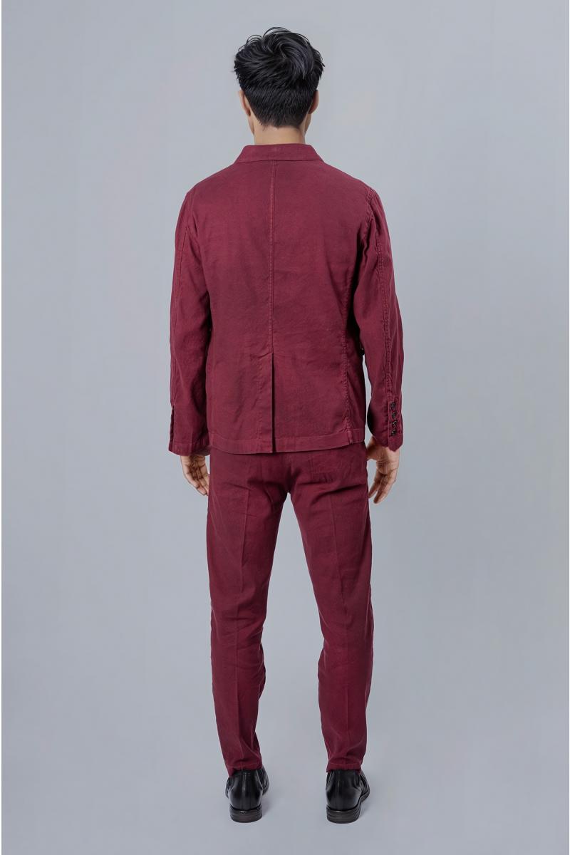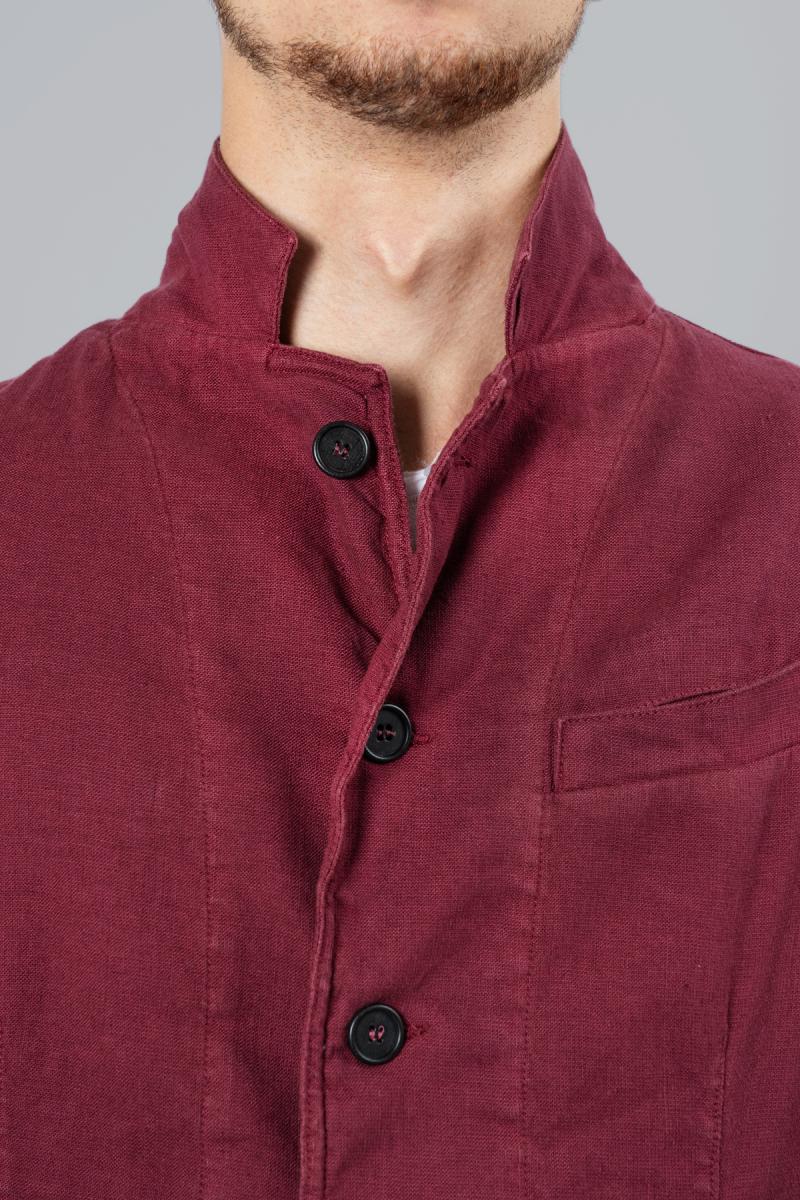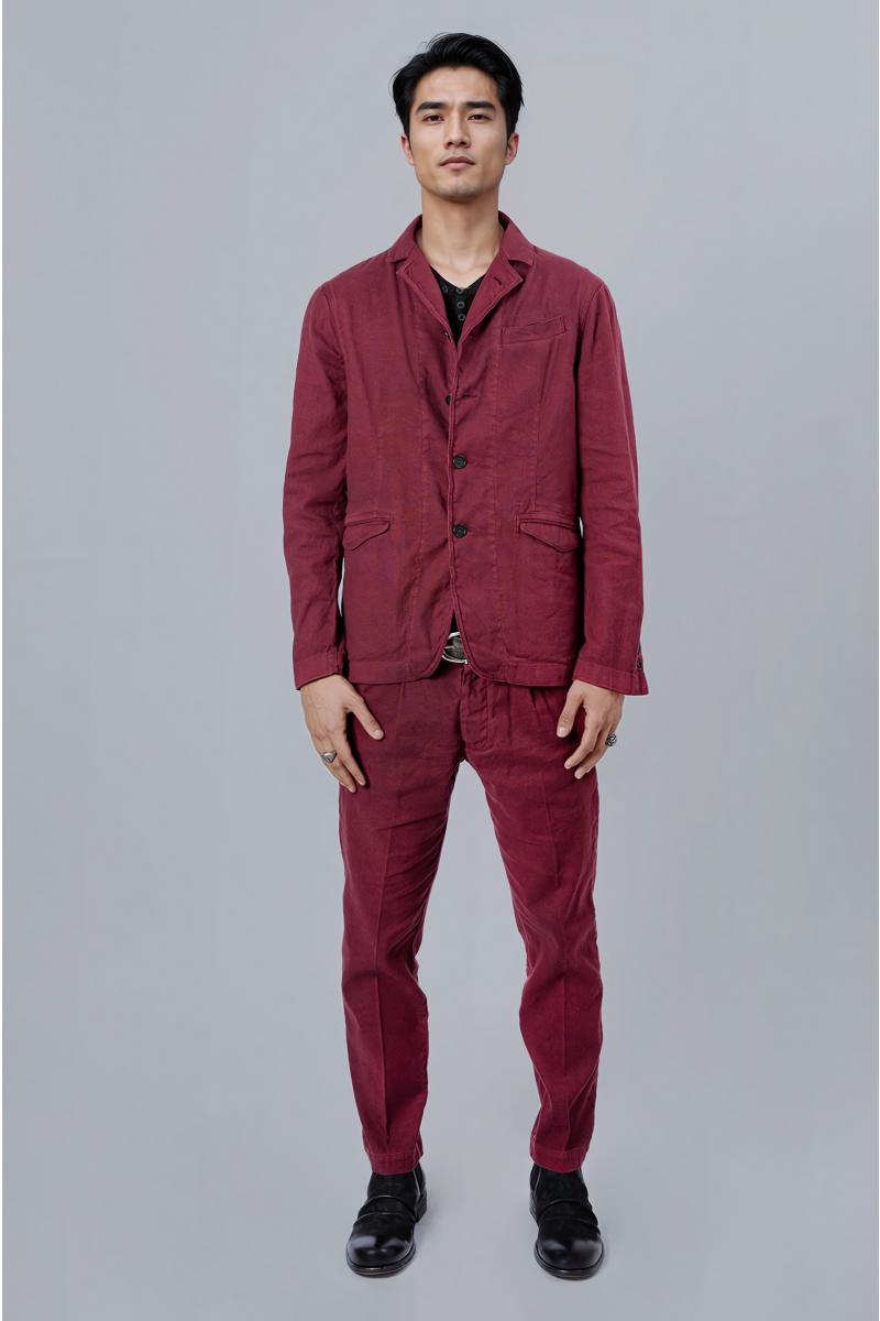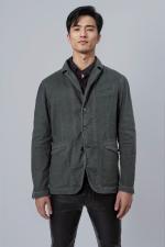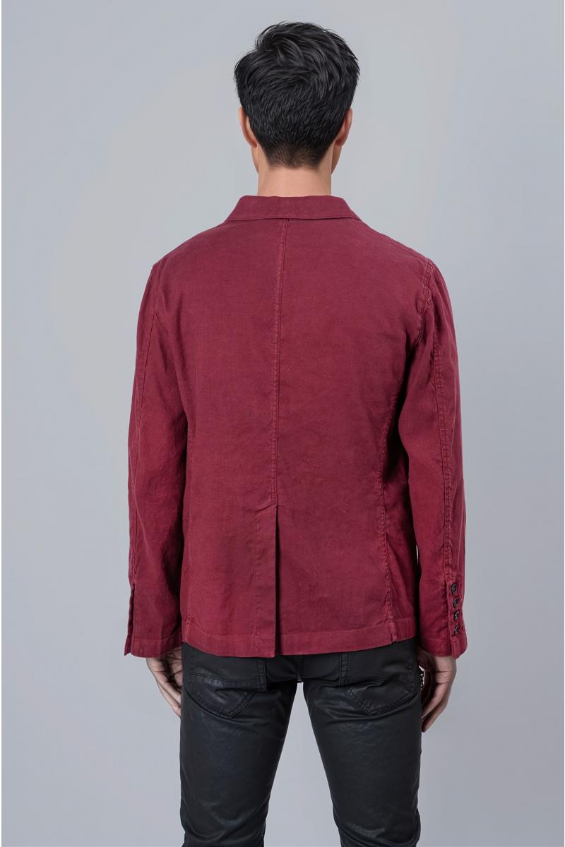 Single-breasted unlined jacket made of hemp blend. Three-button closure with flap pockets.