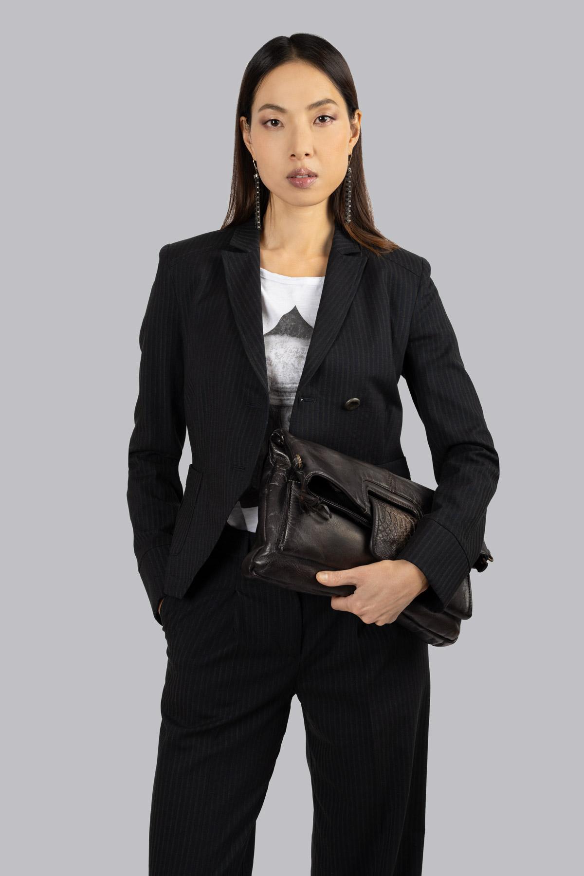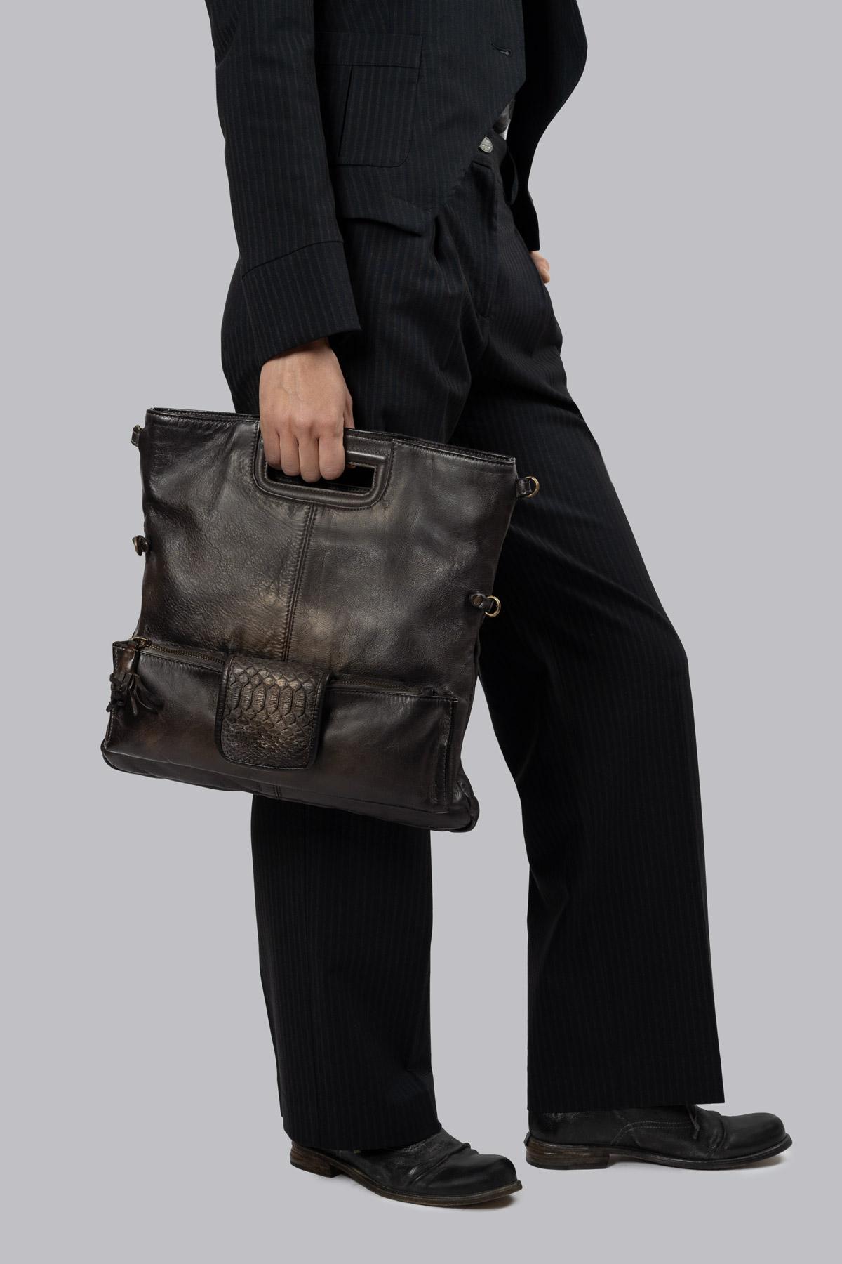 Hand-buffed genuine leather bag. Main zip closure. External pocket with zip closure and python leather flap with button. Practical and versatile, it can be carried by hand, as a cross-body bag, or as a clutch by folding the bag over itself. Adjustable and removable shoulder strap.
