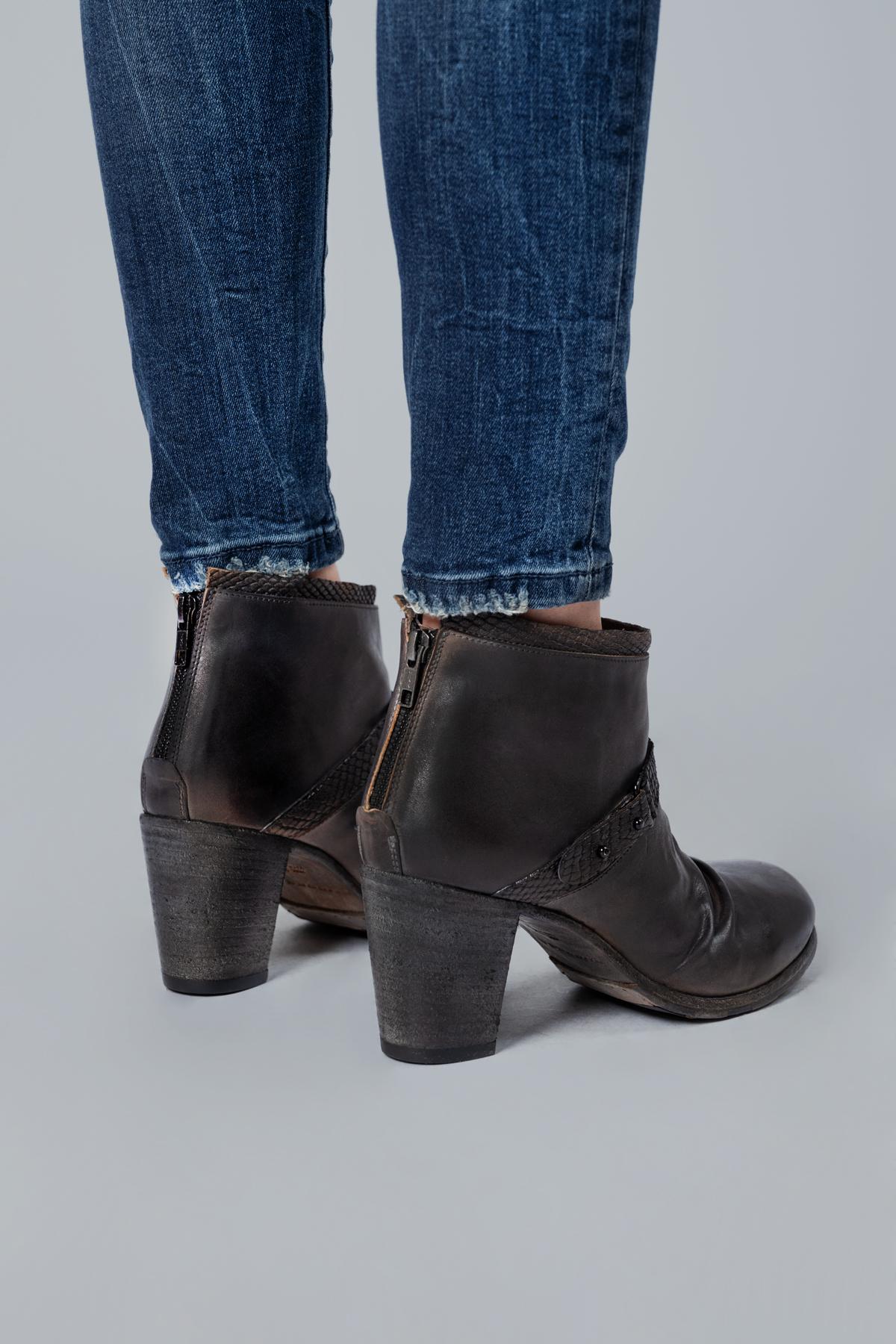 Ankle boots with leather heel, made of genuine hand-padded leather. An exclusive design enriched with python-print leather details. Equipped with an adjustable buckle and practical press studs.